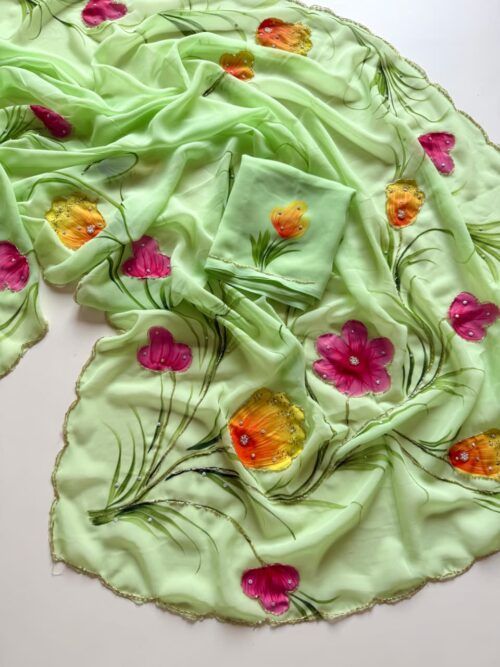 Soft Pure Satin Chiffon Handwork Sarees Wholesale Price 4 Pc Catalog