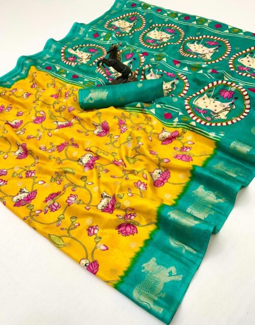 Premium Spice Silk Saree With Kalamkari Cow Border