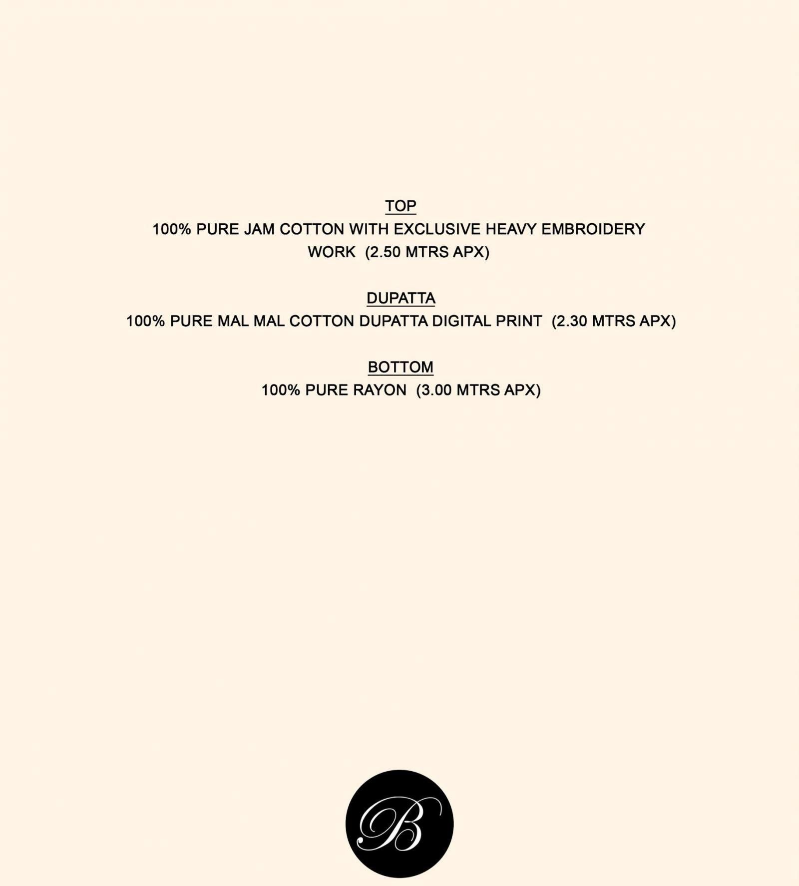 | Top: | 100% Pure Heavy Jam with Designer Heavy Embroidery Work + Heavy Daman Boring Work with Scalloping (2.50 mtrs apx) |
