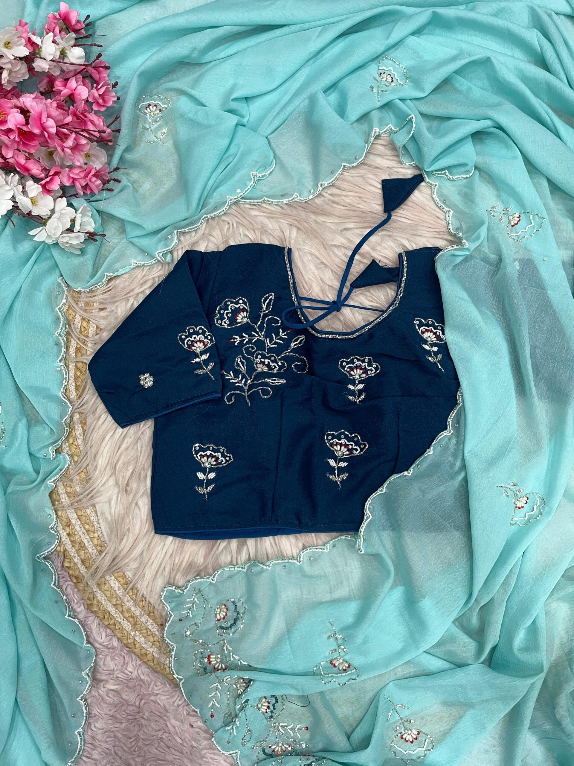 To perfect your wedding attire, you can go for designer blouses that have been embroidered and embellished with stones and gems. You can also wear velvet blouses or sequence blouses as they are trending at the moment.