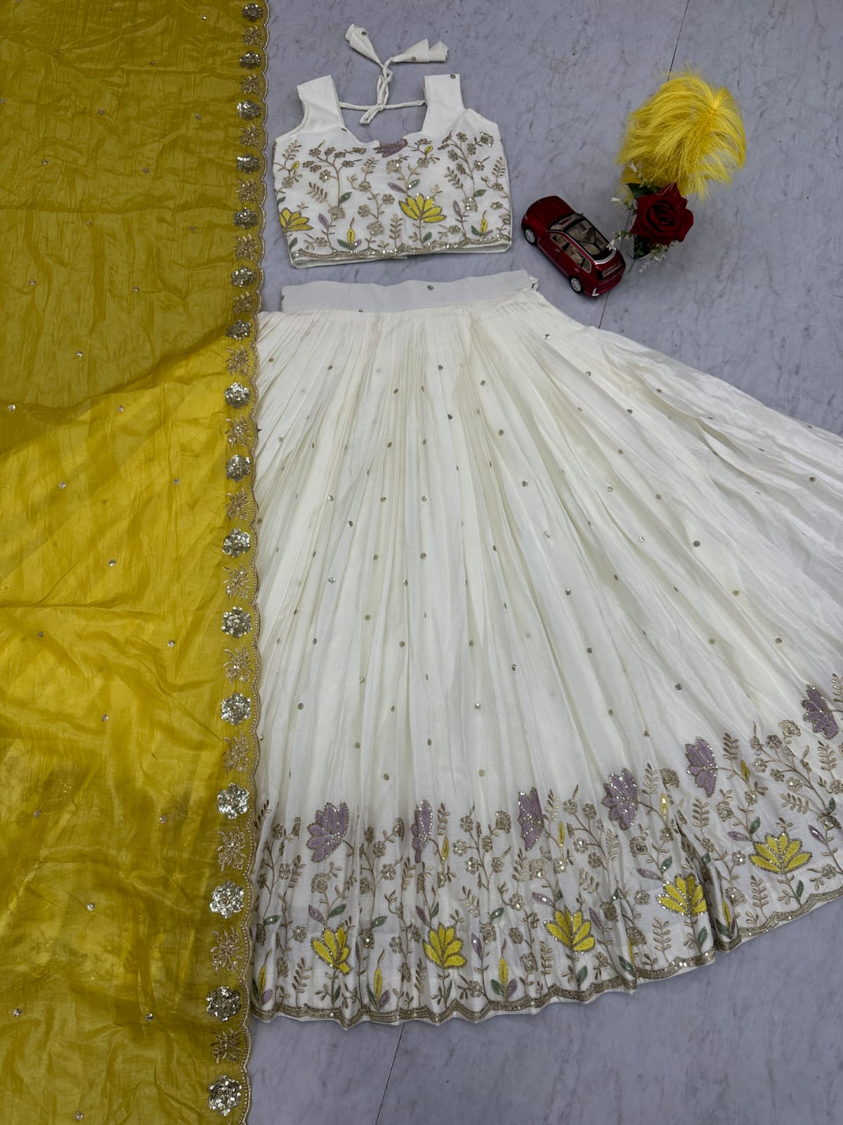 | Lehenga: | Fabric:- Chinon Inner:- Micro Cotton Work:- Embroidery Thread and Sequence Work Flair:- 3.50 Meter Size:- 44 |