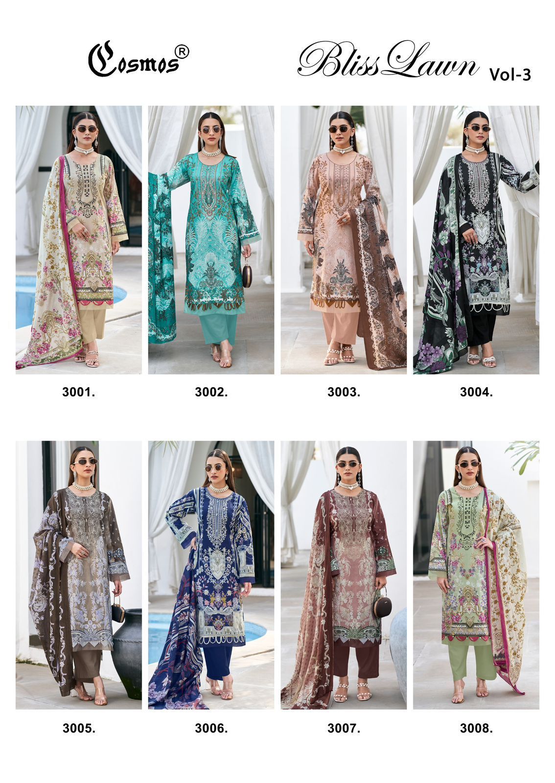 Cosmos Bliss Embroidery lawn Vol-3 Lawn Embroidery Dress Materials Wholesale Price 8 Pc Catalog