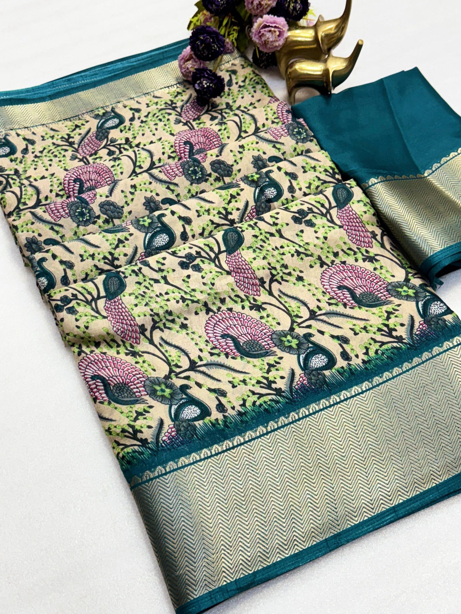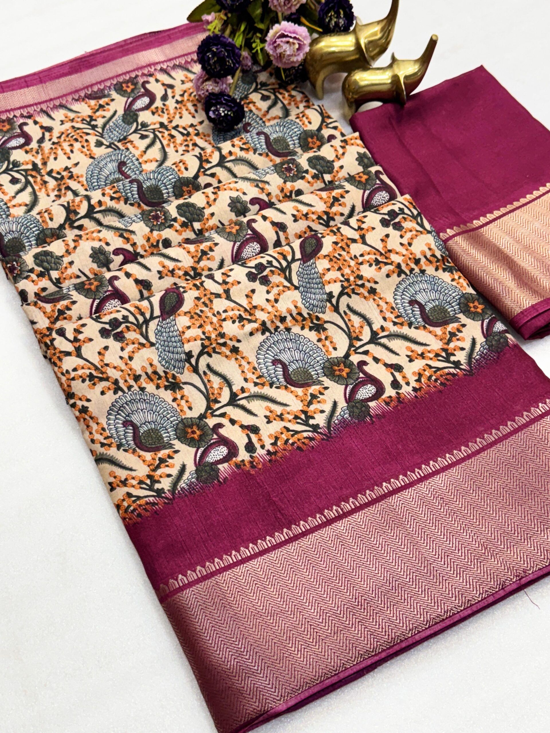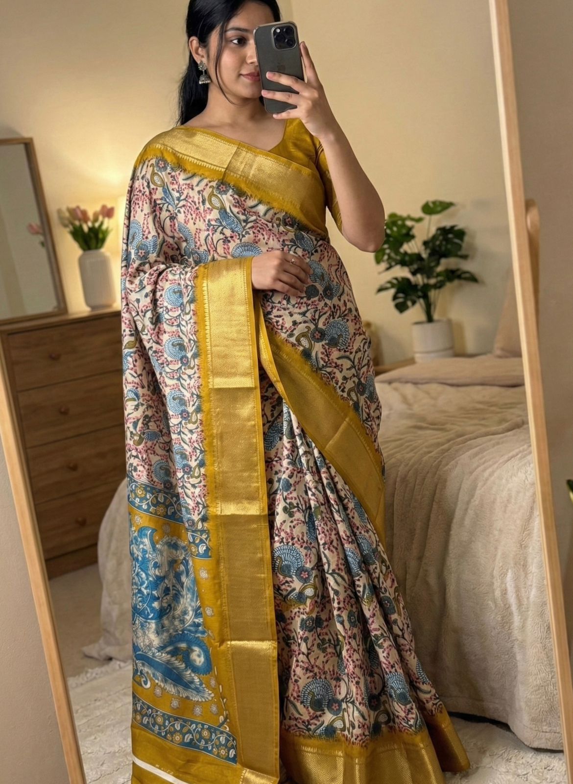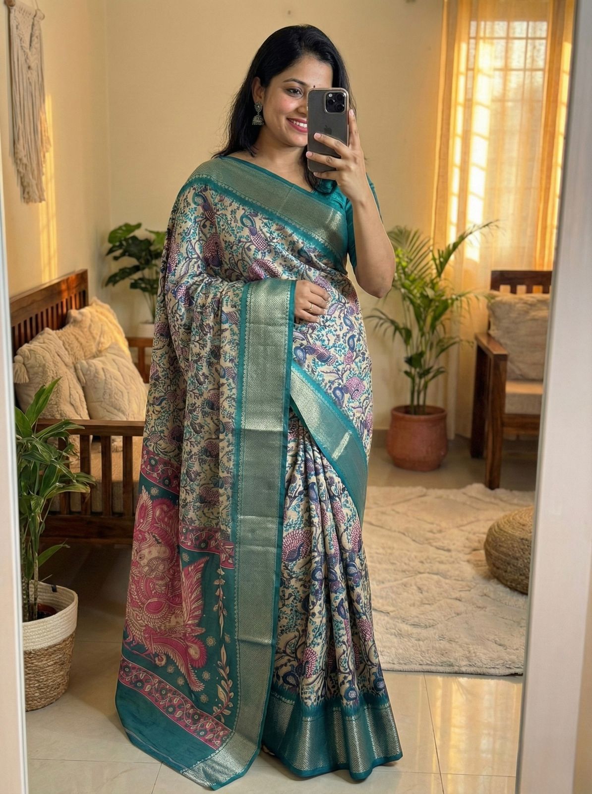 | Fabric: | Dola Silk Kalamkari Saree With Weaving Border |