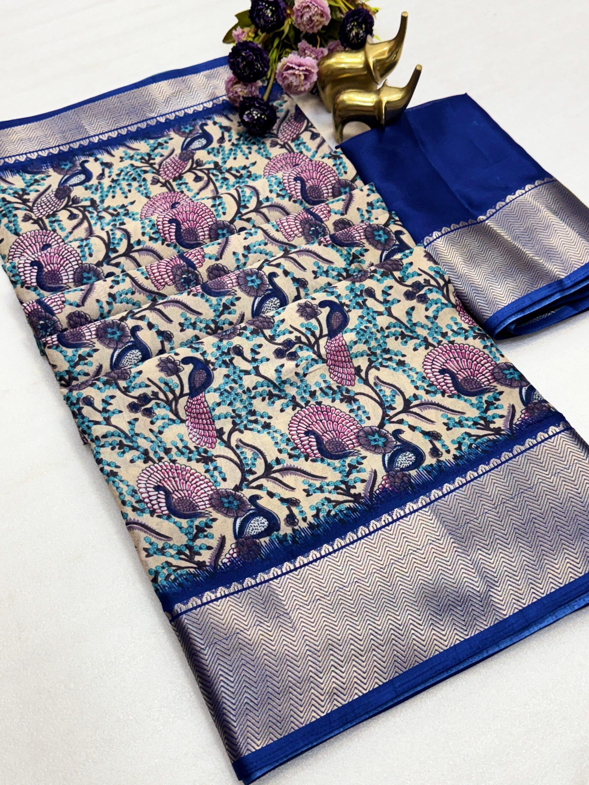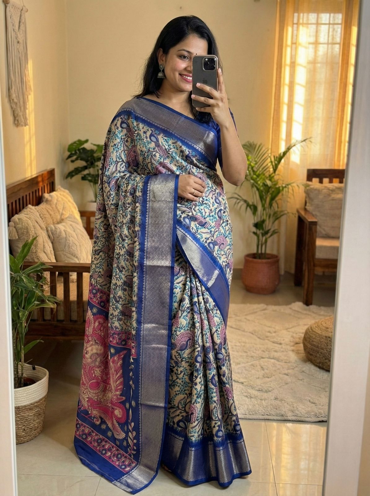 | Work: | Beautiful Dola silk sarees KALMKARI print |
