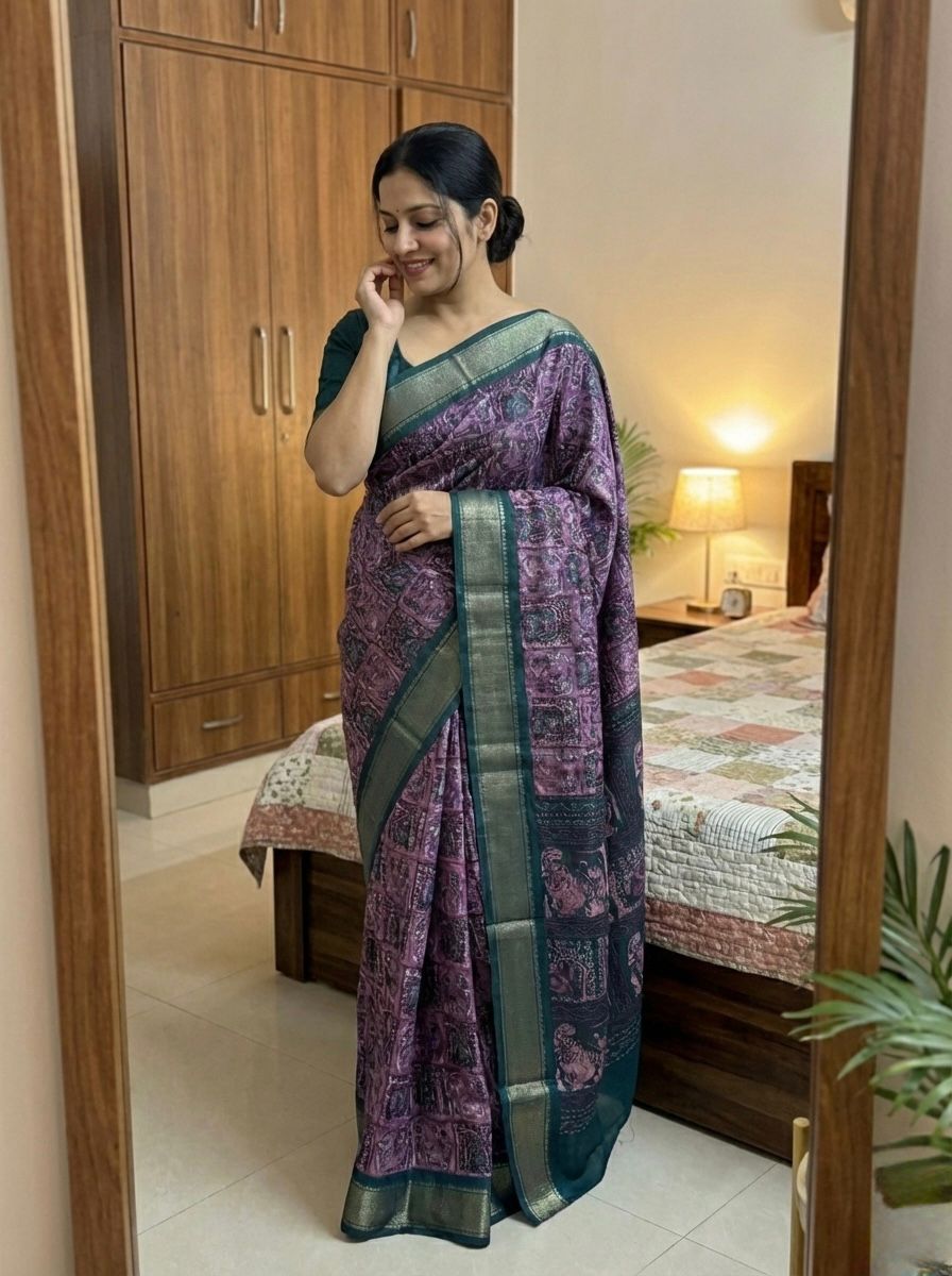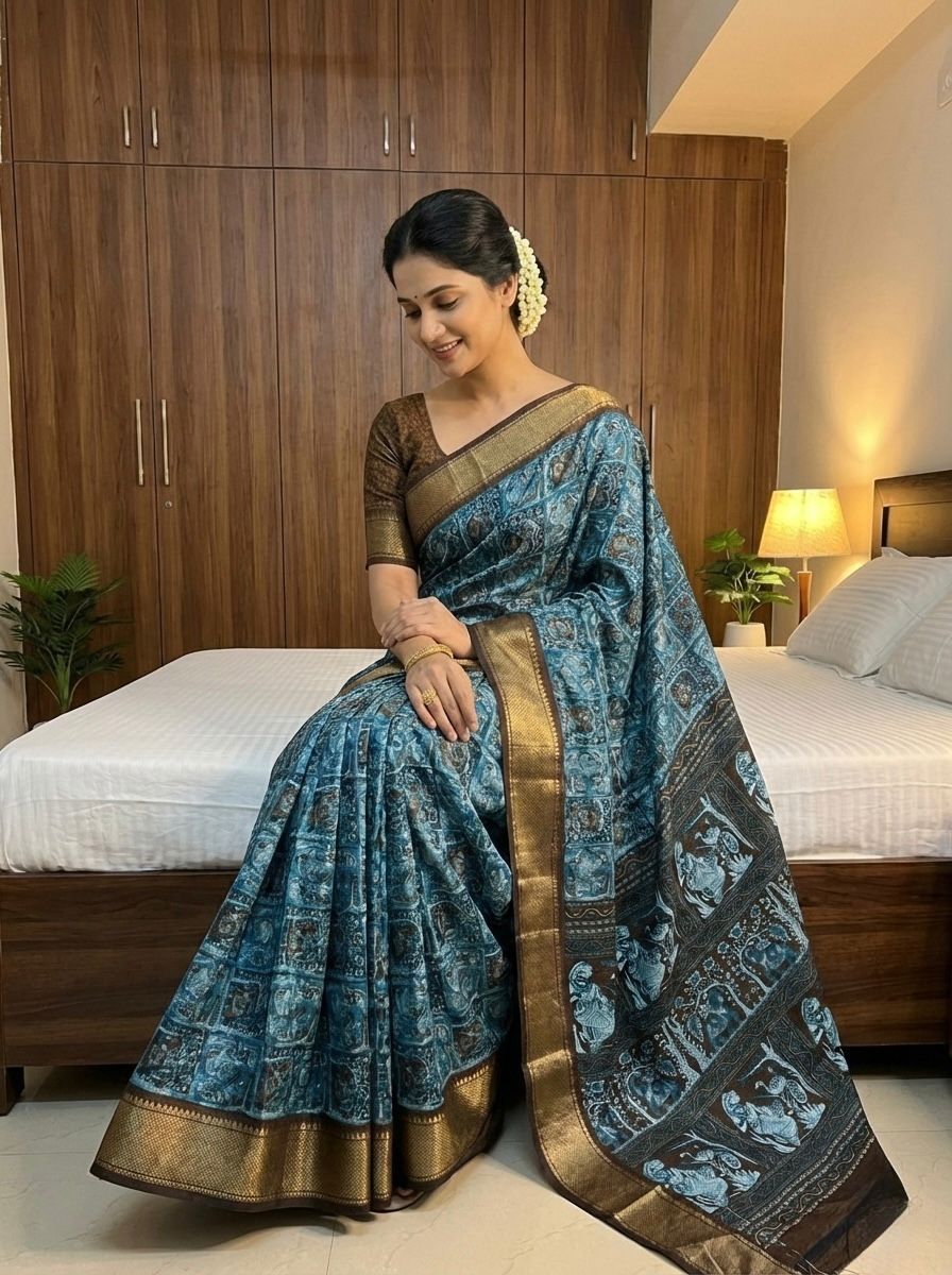 | Work: | Beautiful Dola silk sarees KALMKARI print |