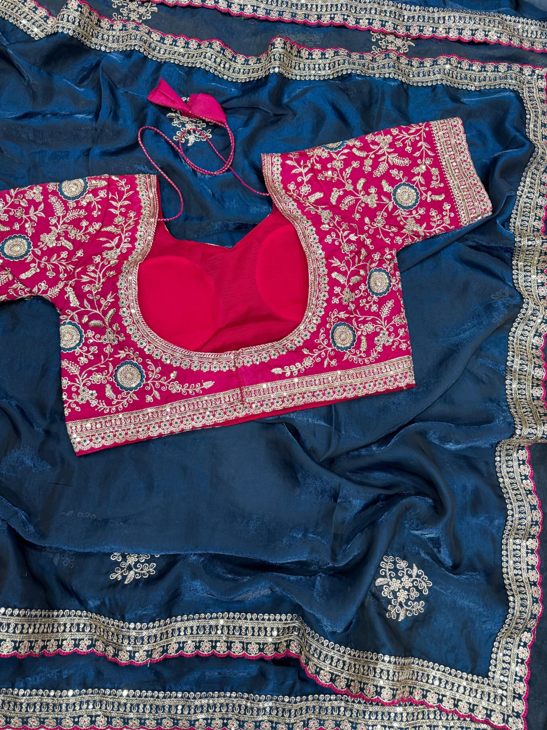 Name: Fendy Satin Sequance and Zari Embroidery Work Saree (5 Pc Set) Satin Silk saree