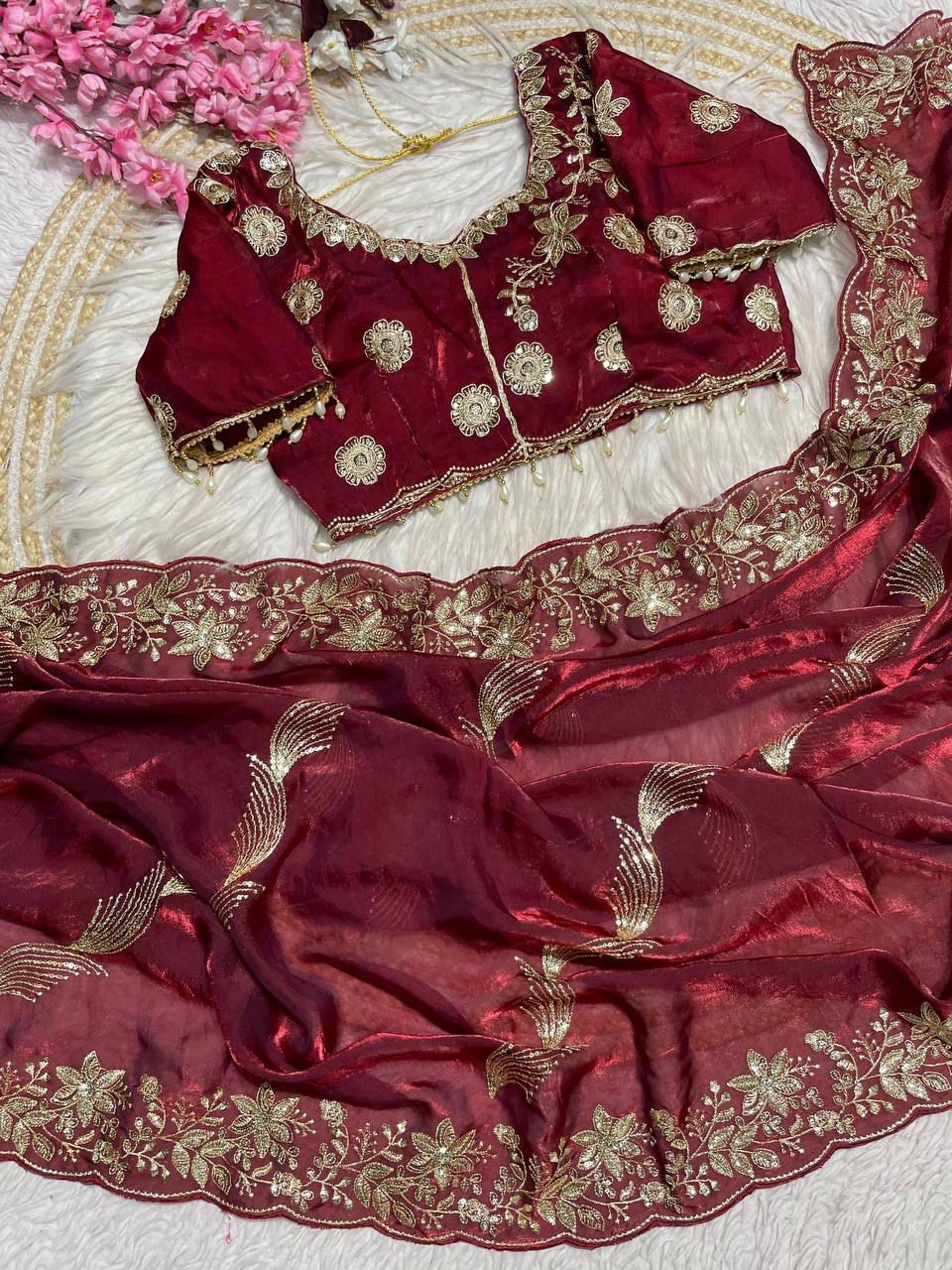To perfect your wedding attire, you can go for designer blouses that have been embroidered and embellished with stones and gems. You can also wear velvet blouses or sequence blouses as they are trending at the moment.