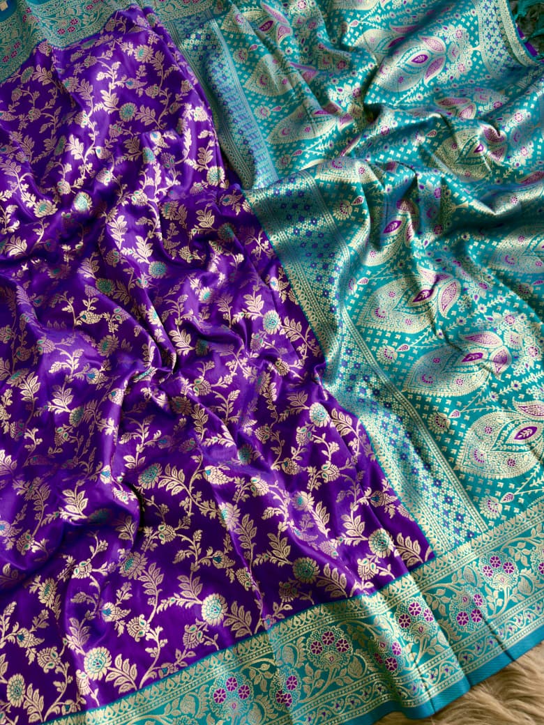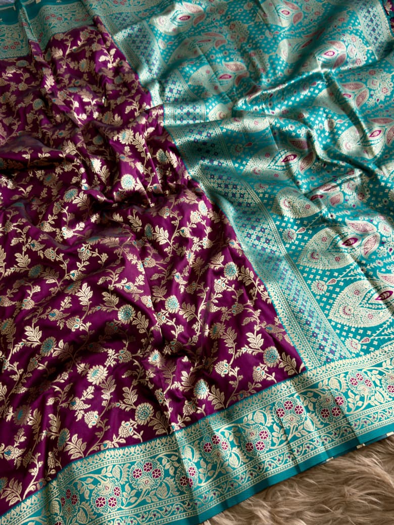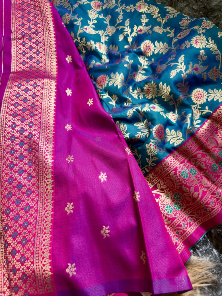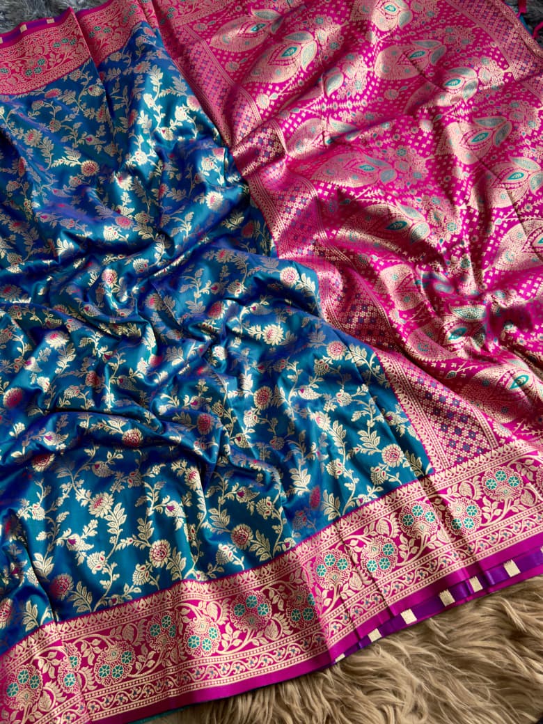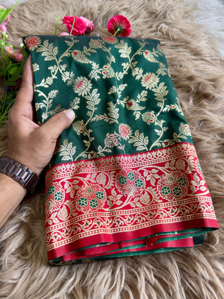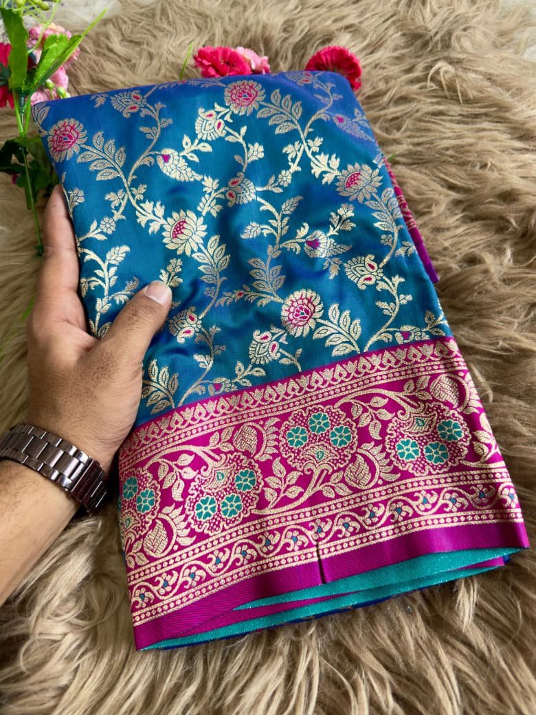 | Fabric: | The saree comes with contrast rich pallu with tassels a contrast border and a floral banarasi jal design all over the saree pairing it with a |