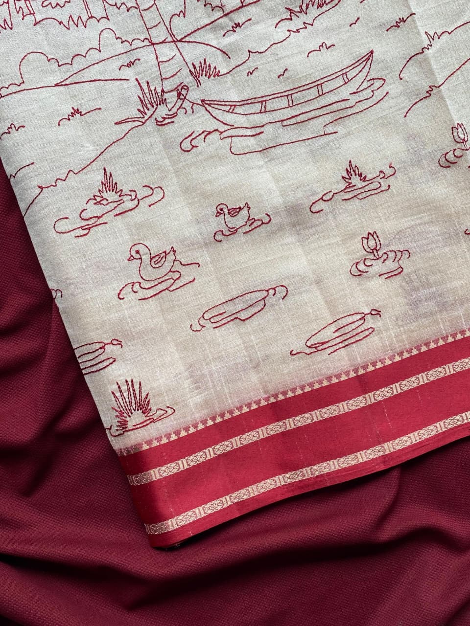| Fabric: | * Handloom Cotton Silk * Body: Subtle woven motifs * Border: Kalamkari-inspired scenic illustration * Pallu: Contrast stripes * Saree Length: 6.3 m * Care: Gentle hand wash |