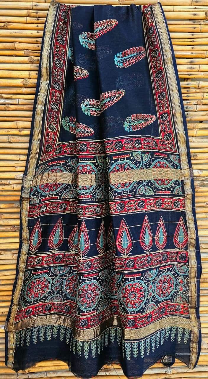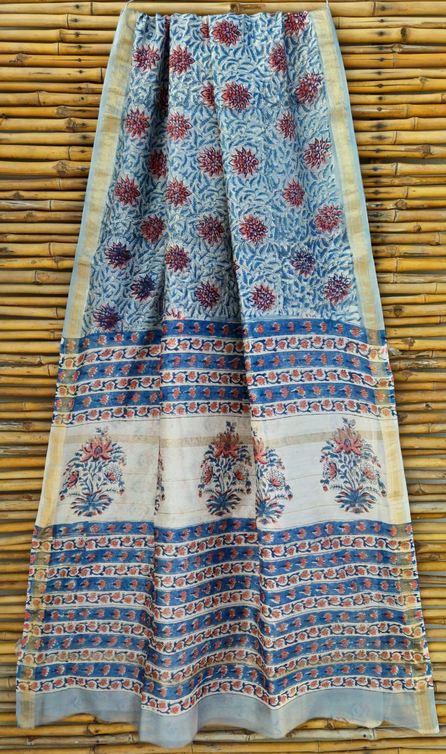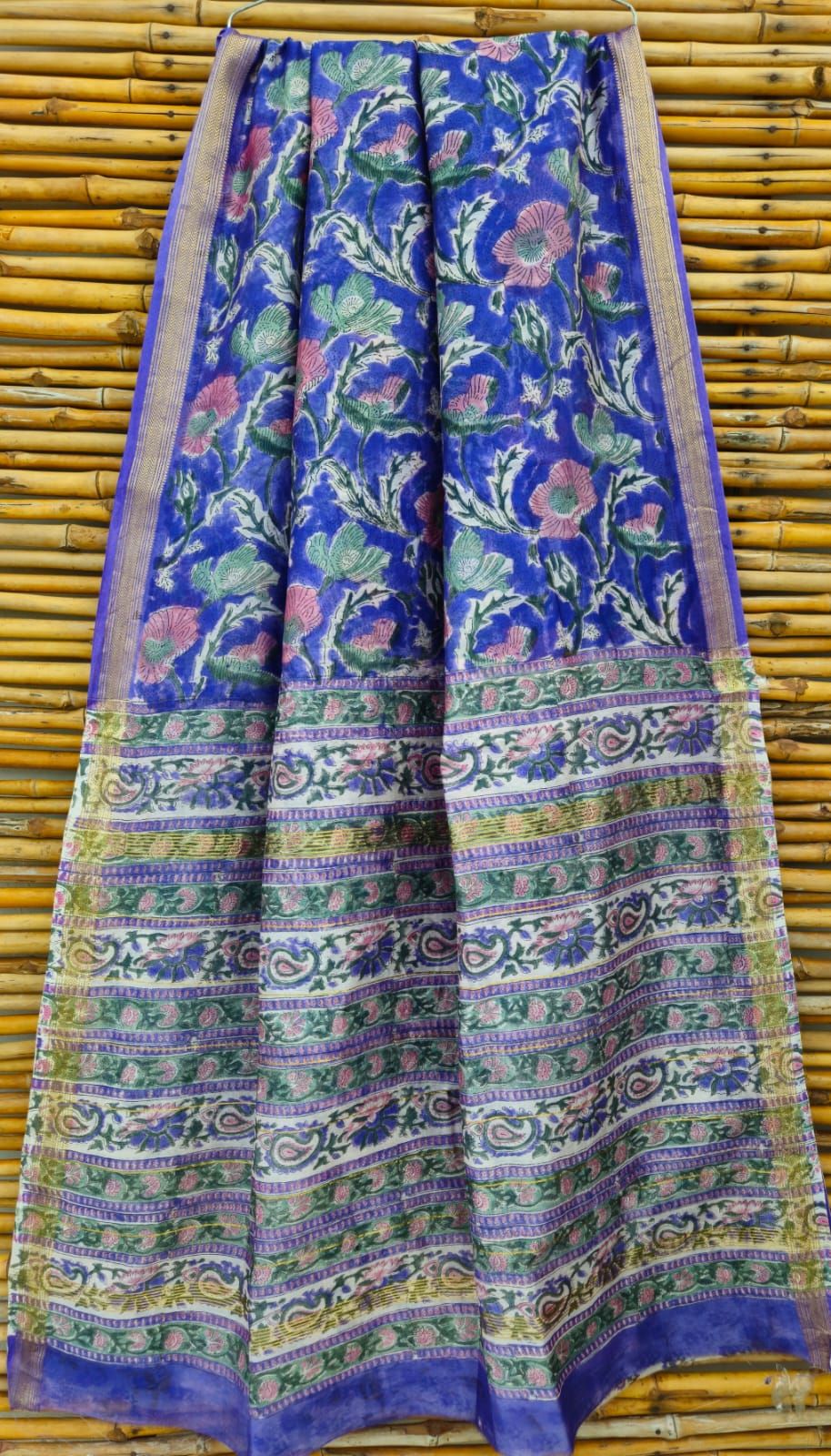 | Fabric: | Hand block printed Maheswari silk sarees with blouse |