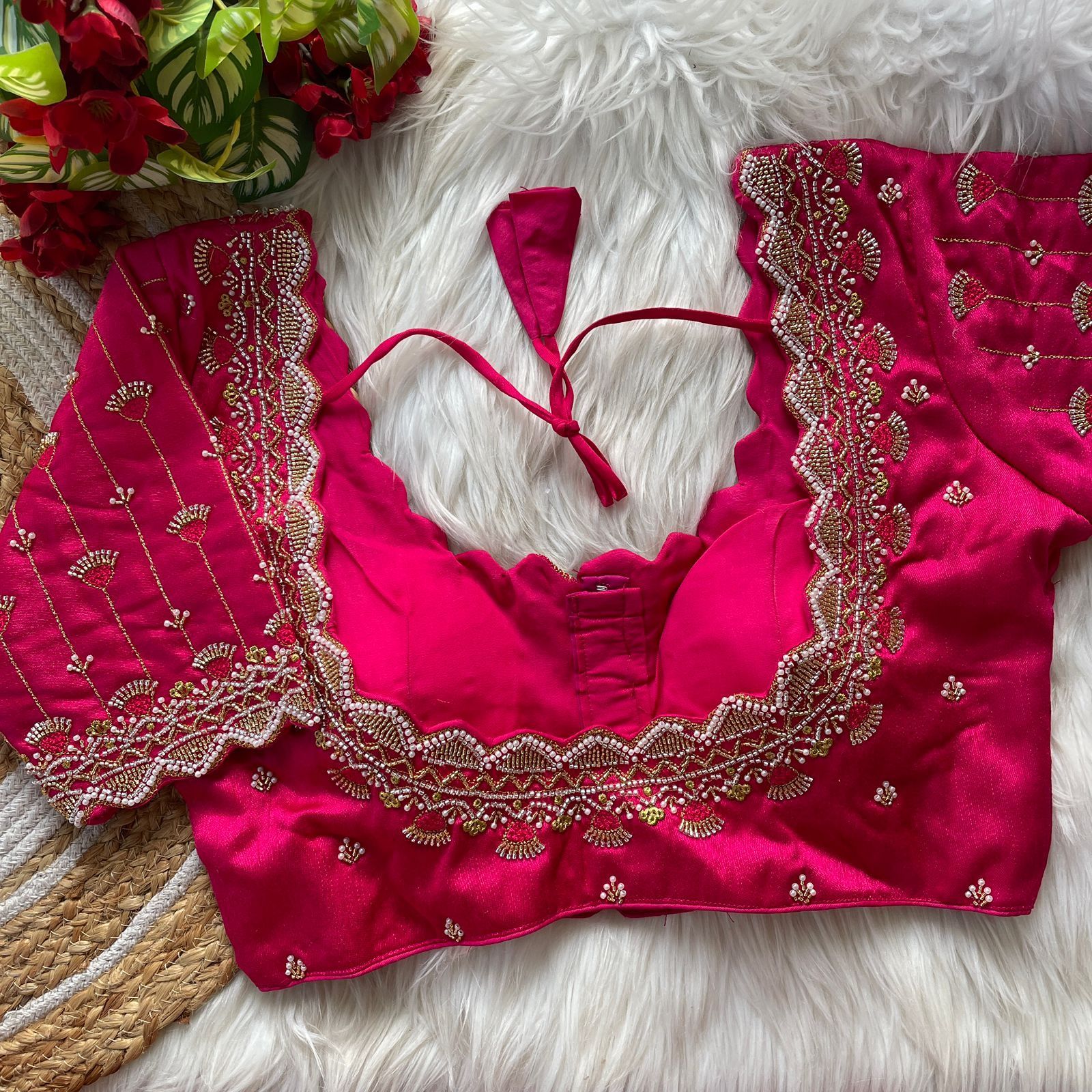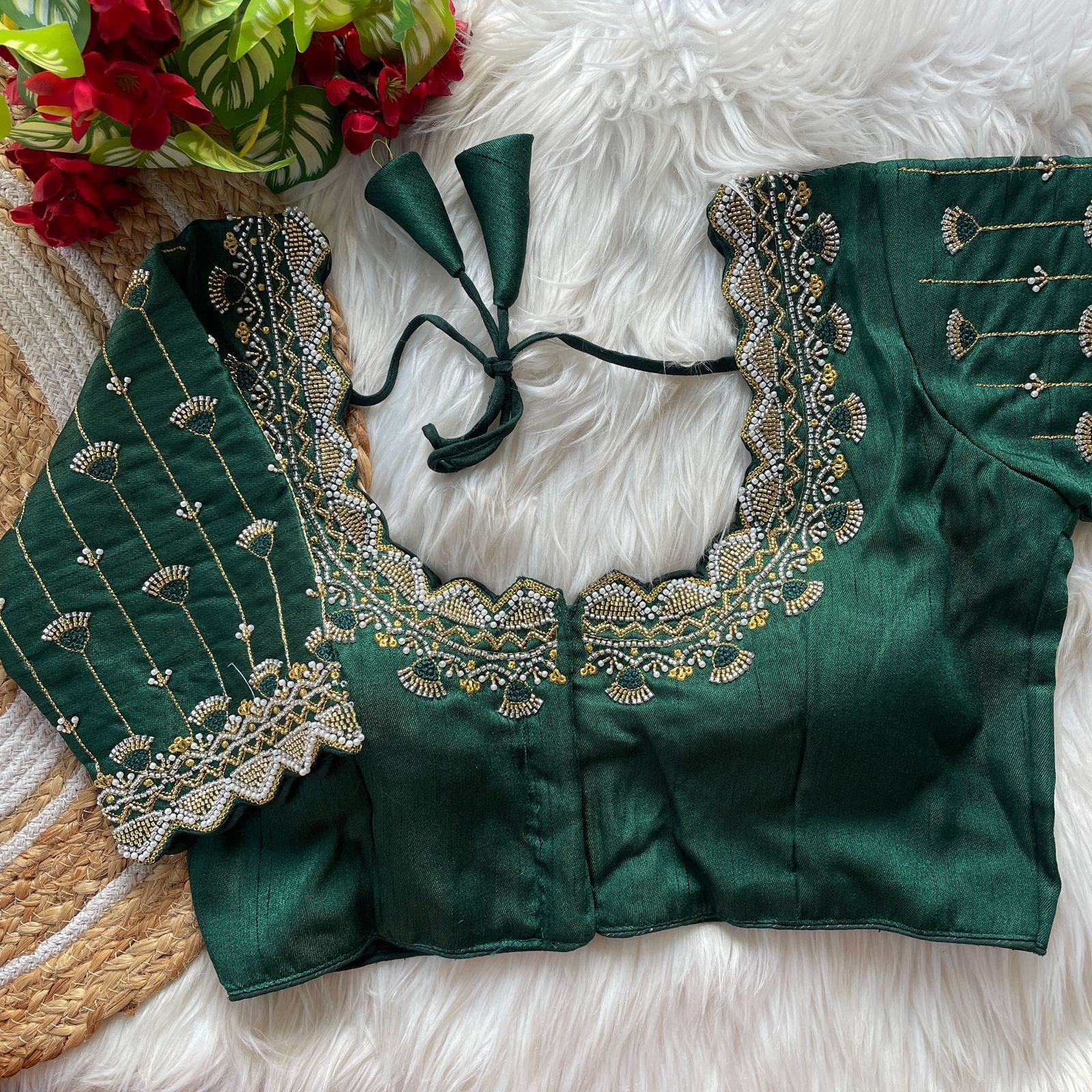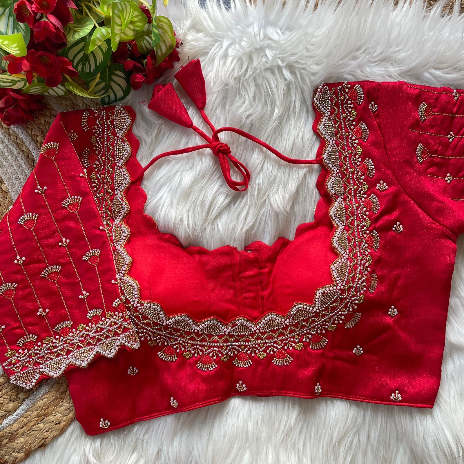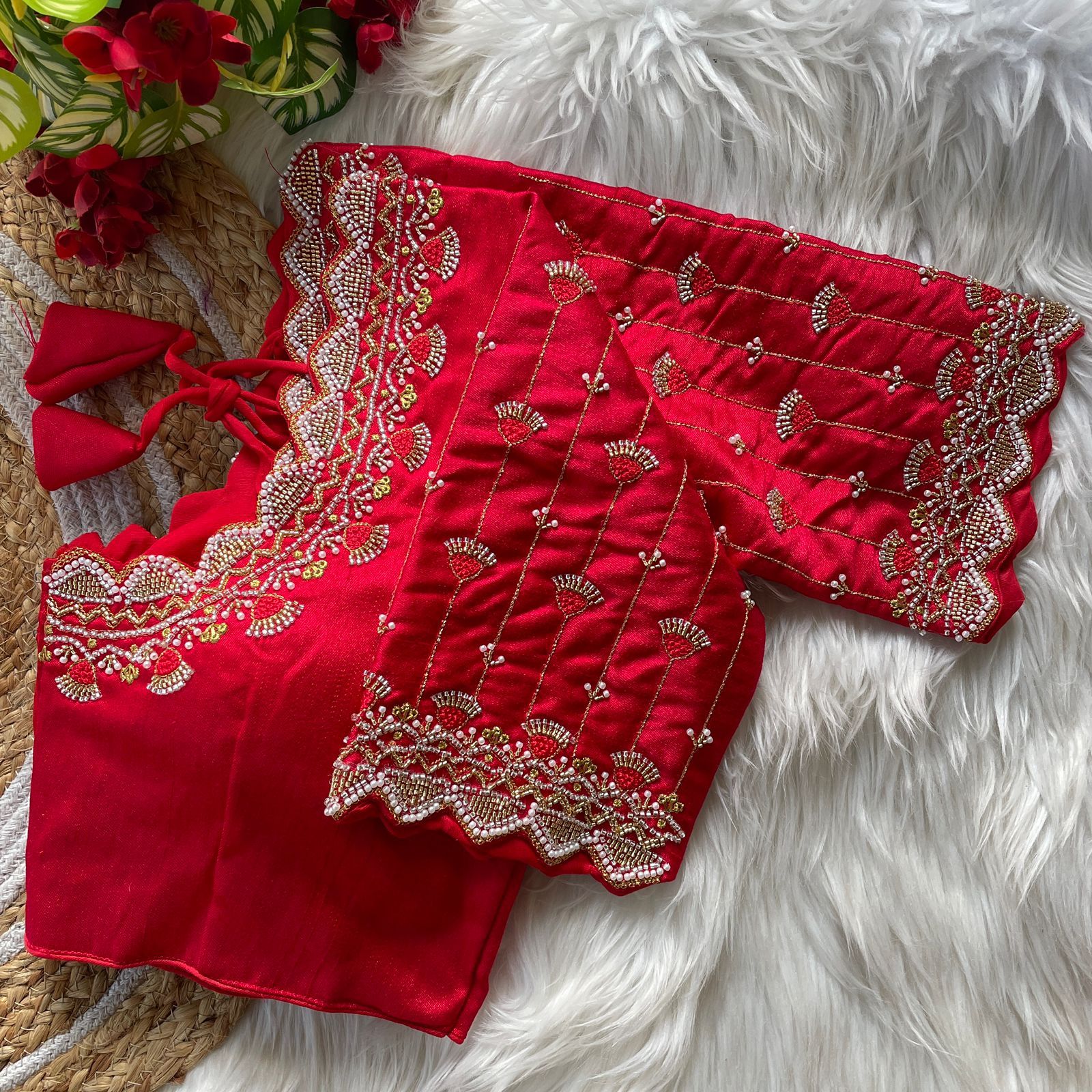 | Other Details | 12” Sleeves Beautiful Work Partywear desgine Heavy Stitching Heavy Padded Handmade Hooks With Beautiful Latkans Front open StylePRINC CUT HEAVY BEADS WORK BRIDAL BLOUSE |