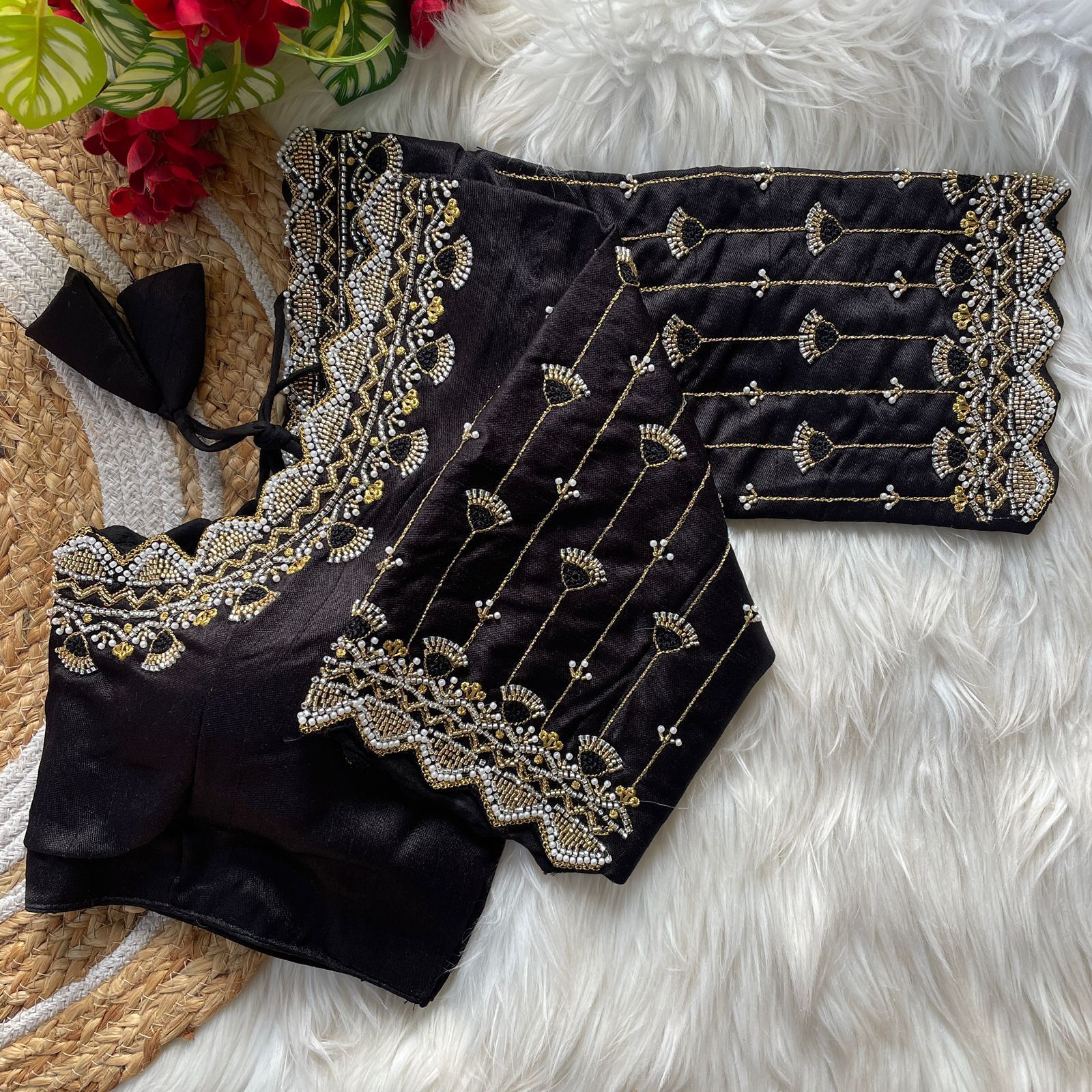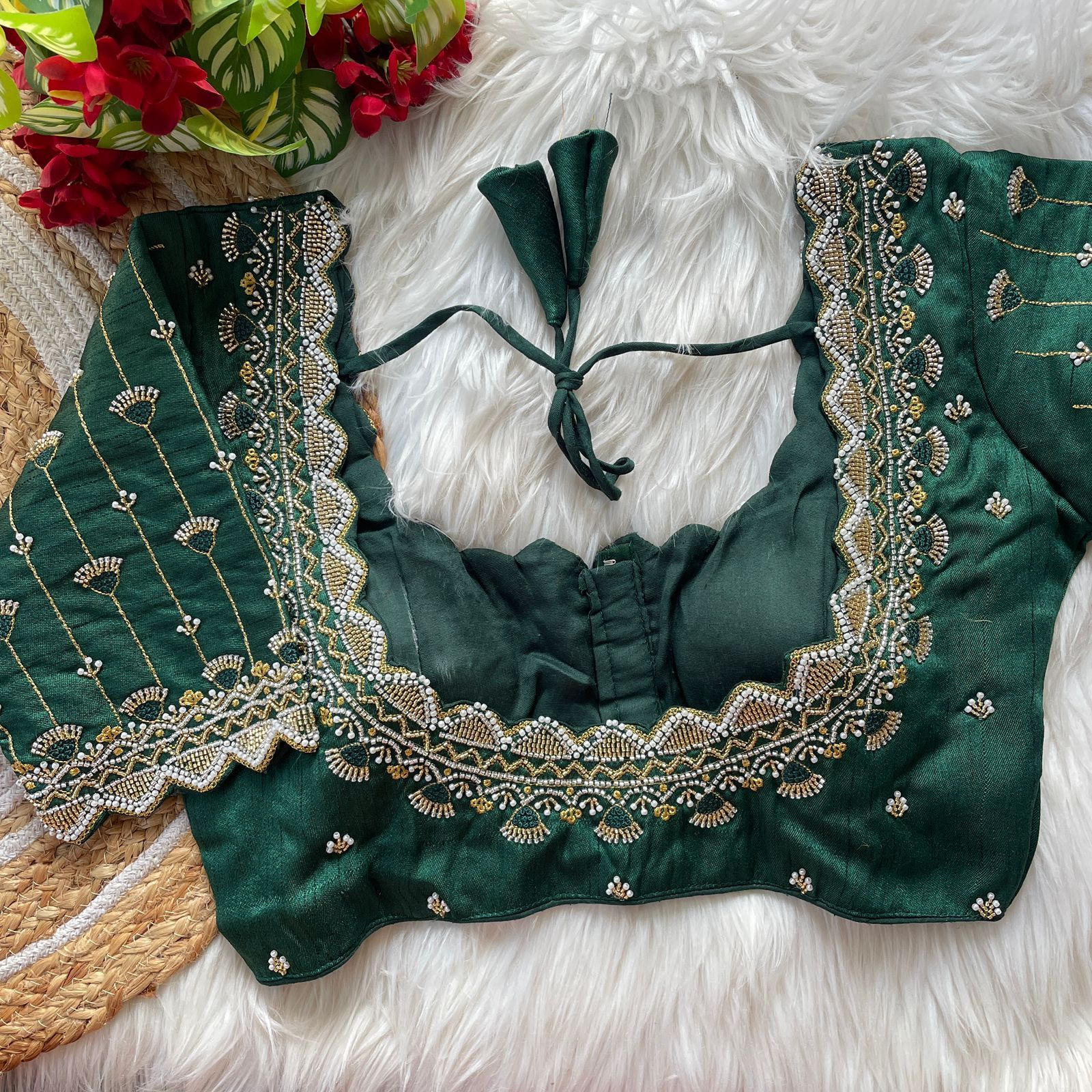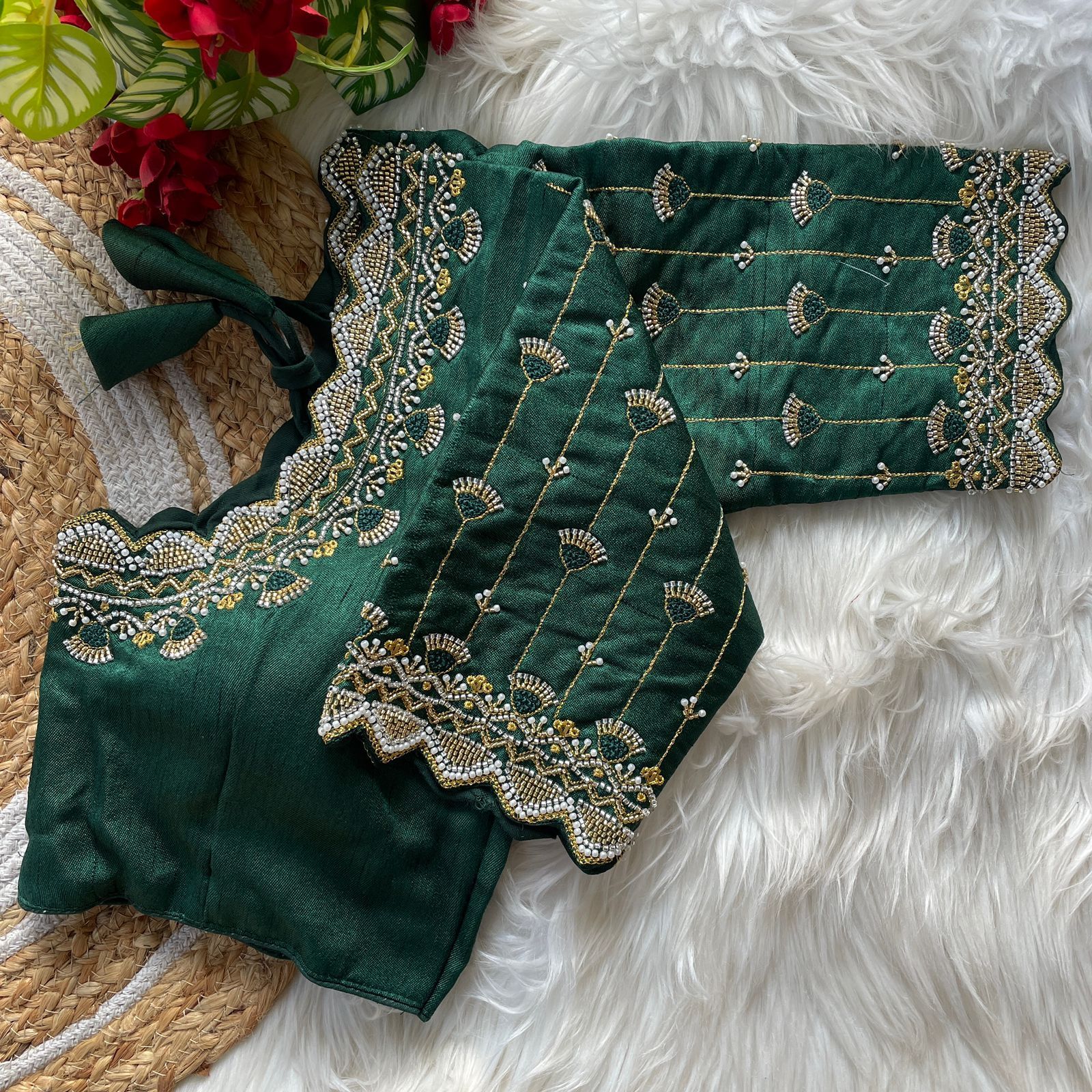 | Other Details | 12” Sleeves Beautiful Work Partywear desgine Heavy Stitching Heavy Padded Handmade Hooks With Beautiful Latkans Front open StylePRINC CUT HEAVY BEADS WORK BRIDAL BLOUSE |