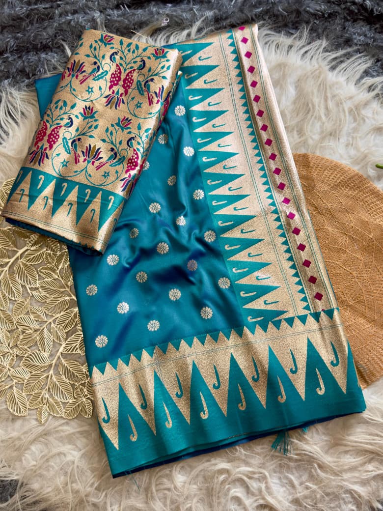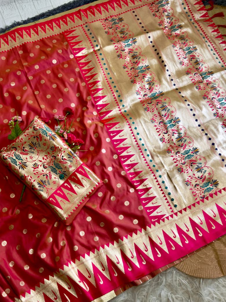 | Fabric: | A stunning Paithani silk saree featuring a rich golden pallu with colourful floral and peacock motifs, a bright body adorned with small zari buttas, and a vibrant multicolour muniya temple Paithani border. with delicate zari and meena work. |