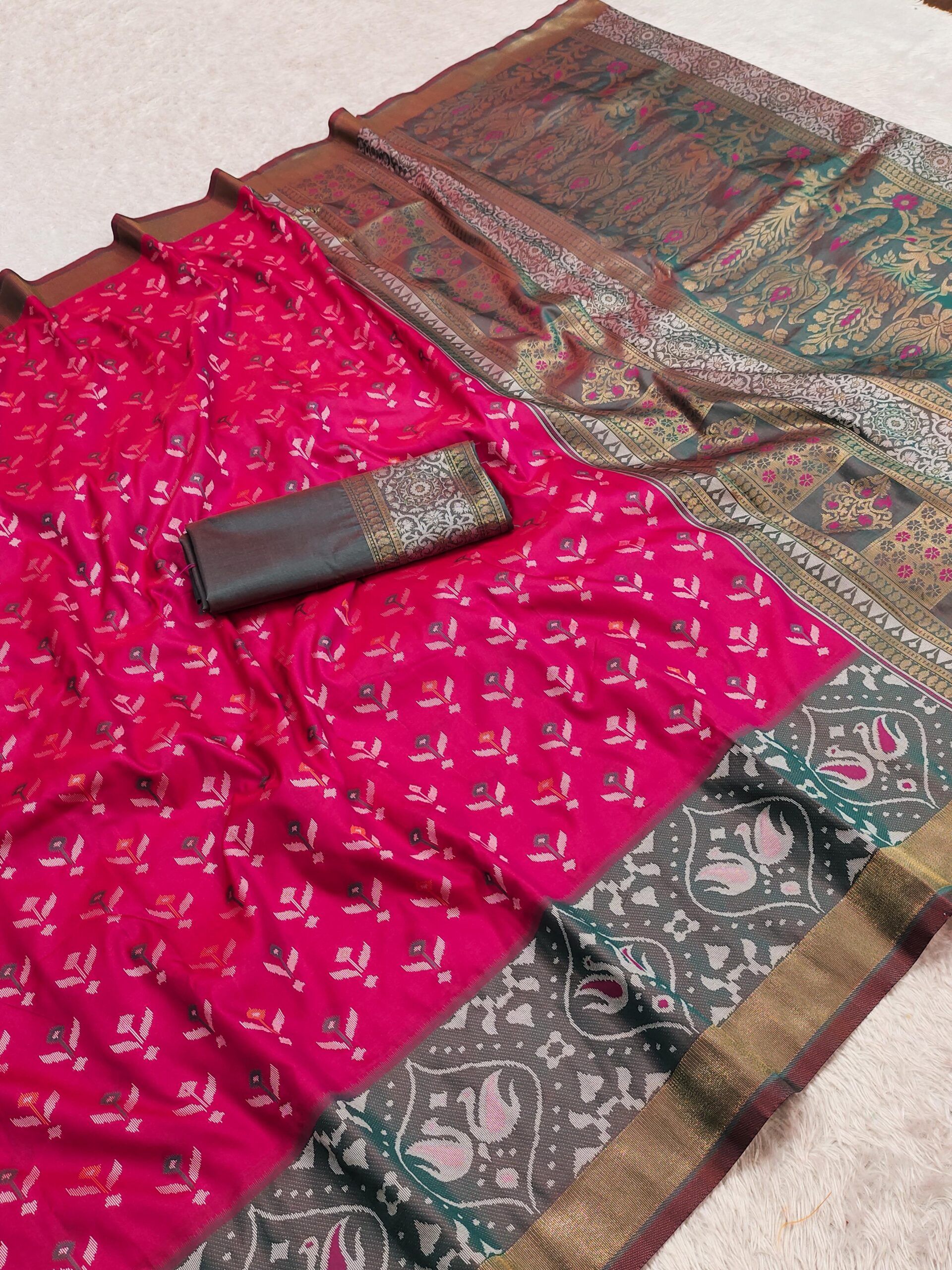 | Blouse: | Pochampalli silk weaving Brocade blouse piece with zari-woven sleeve border. |
