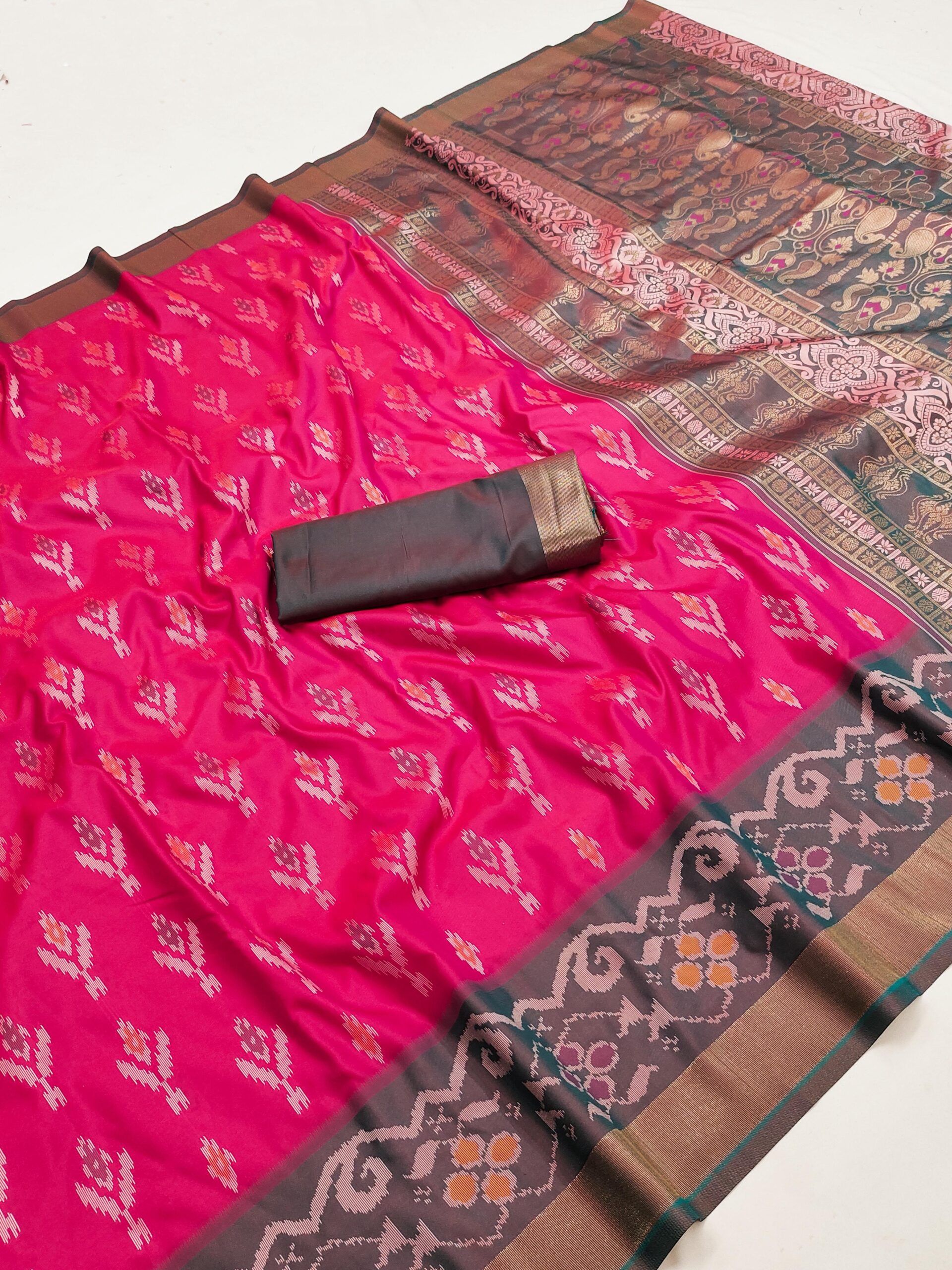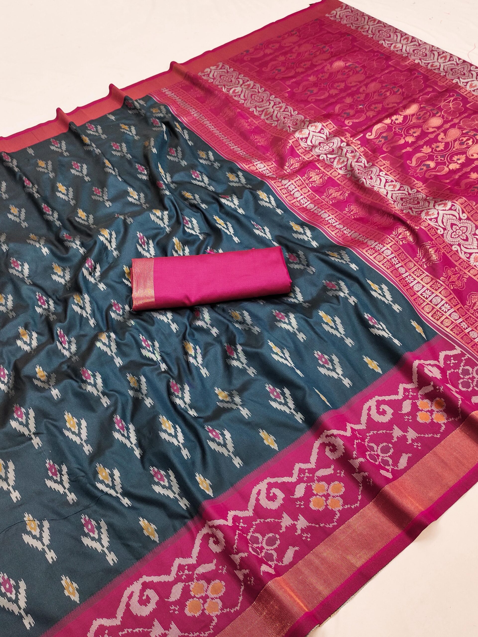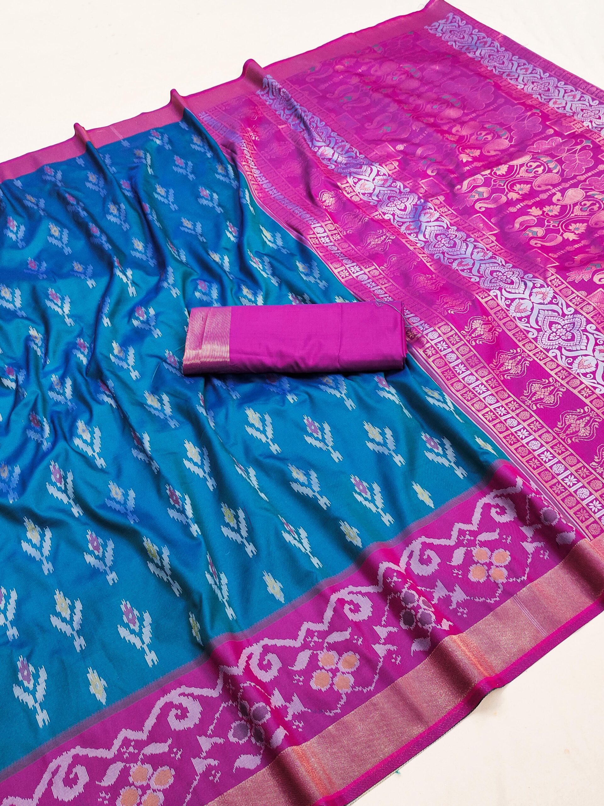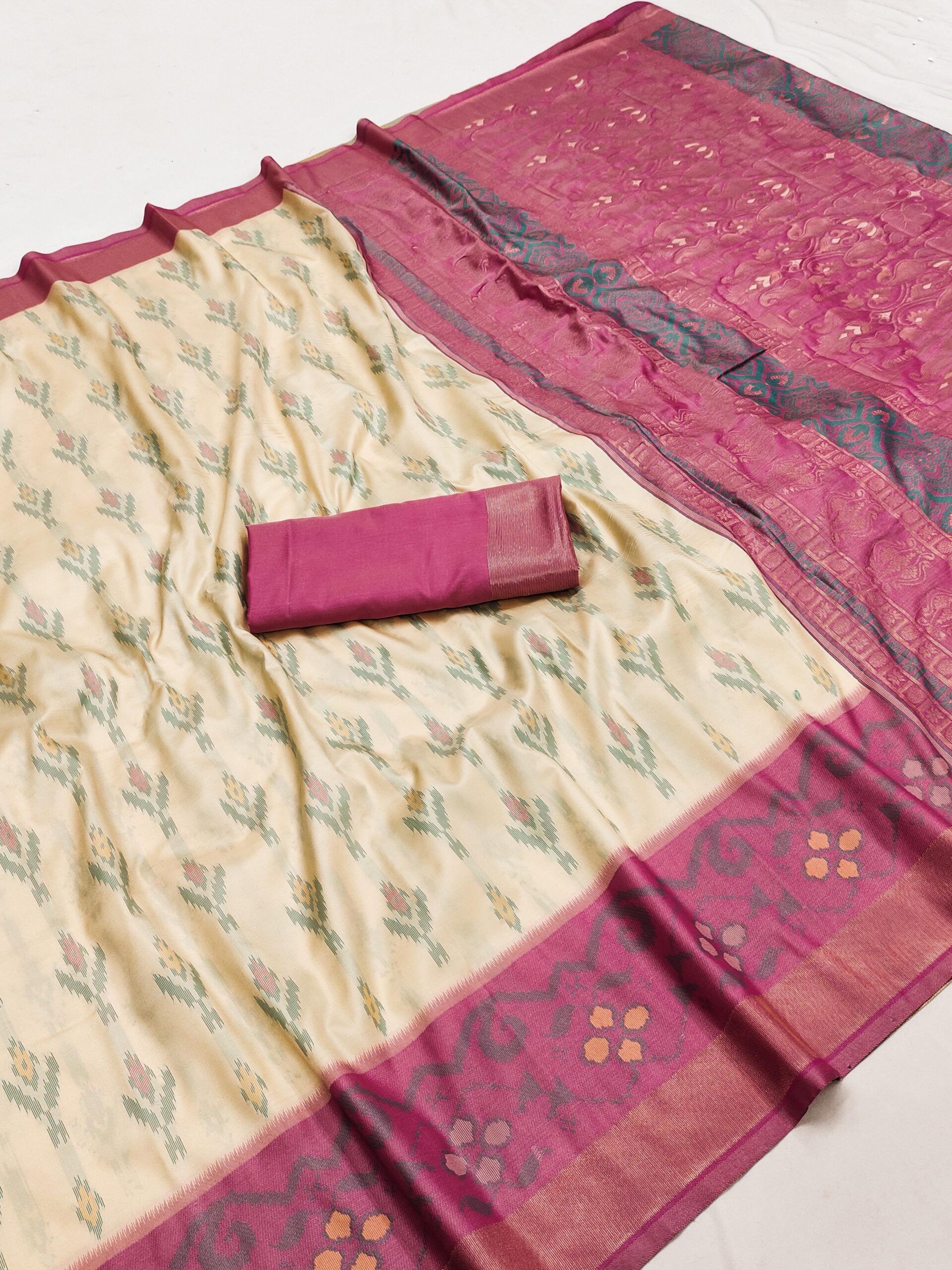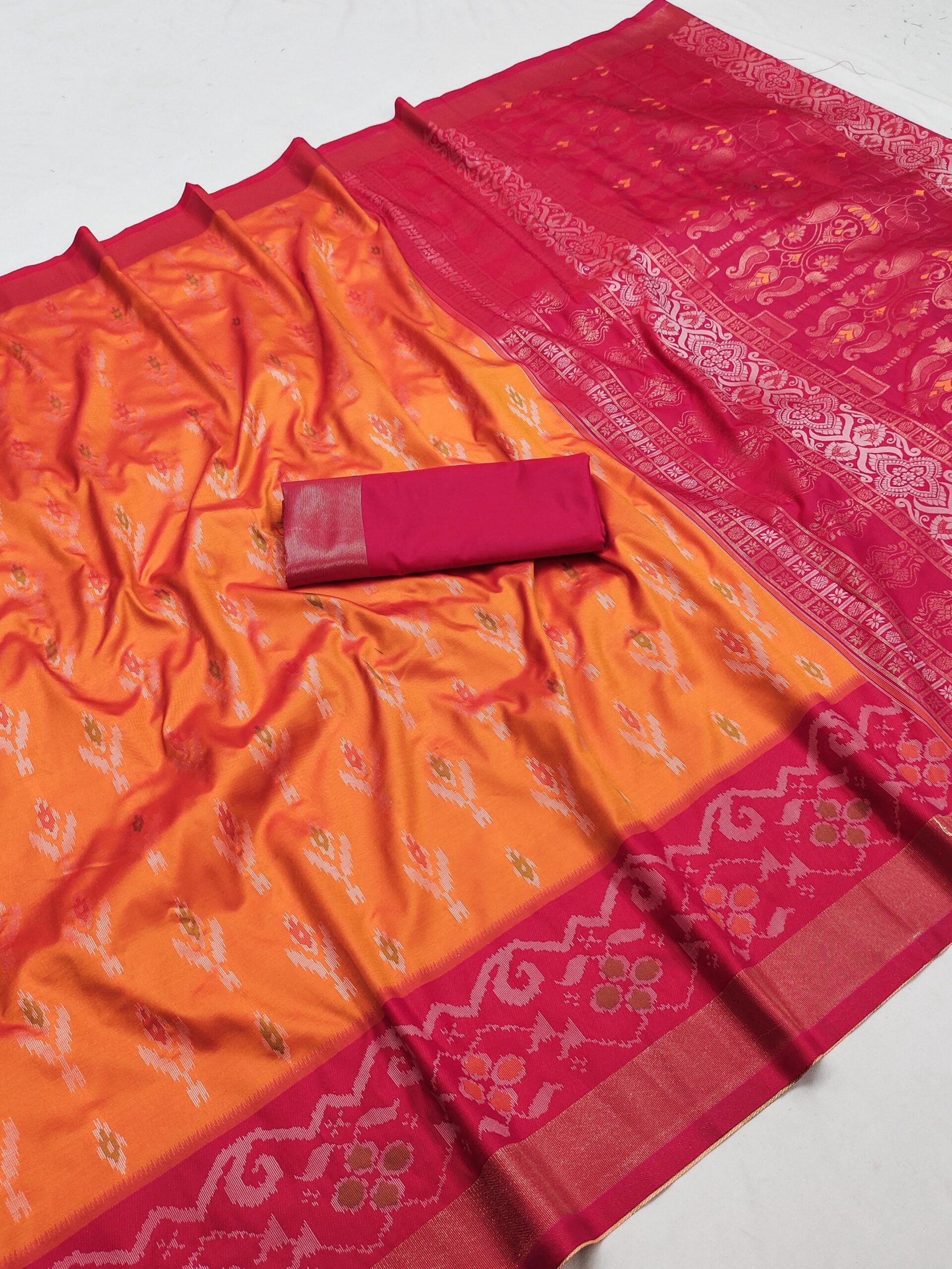 | Fabric: | Pochampalli silk blend for a lustrous yet soft drape With traditional Ikkat Pattern Contrast Border & Pallu with Zari Border which will give you a comfortable yet attractive look. The best part of this saree is its woven work. |