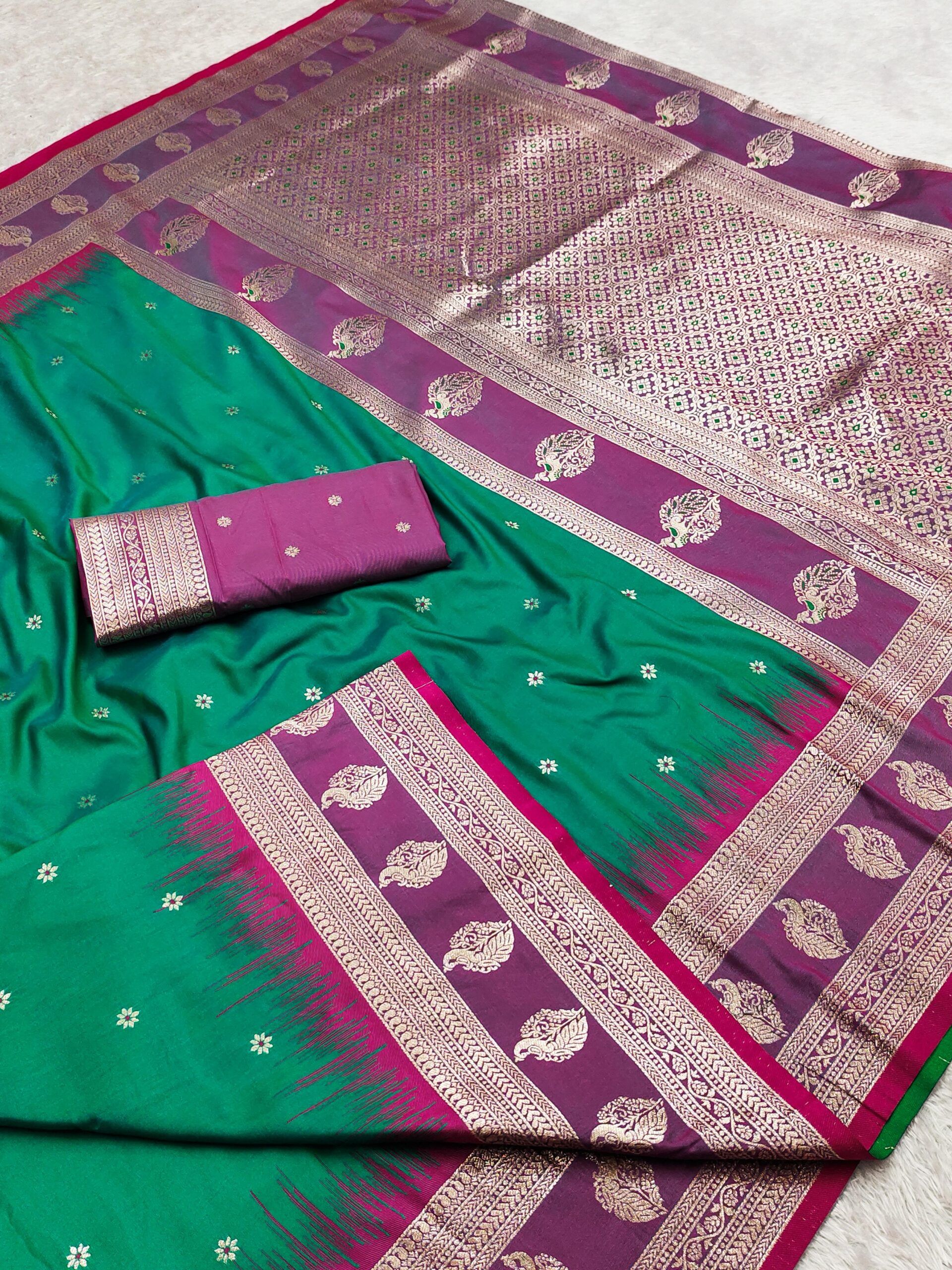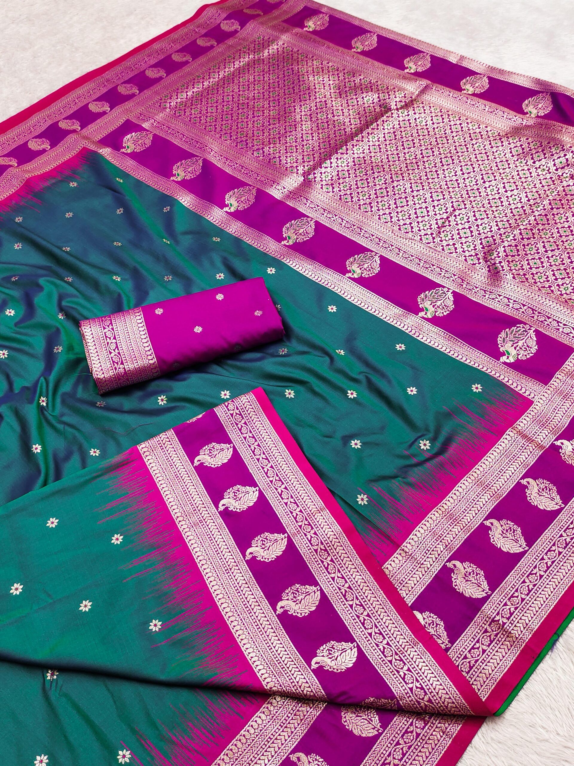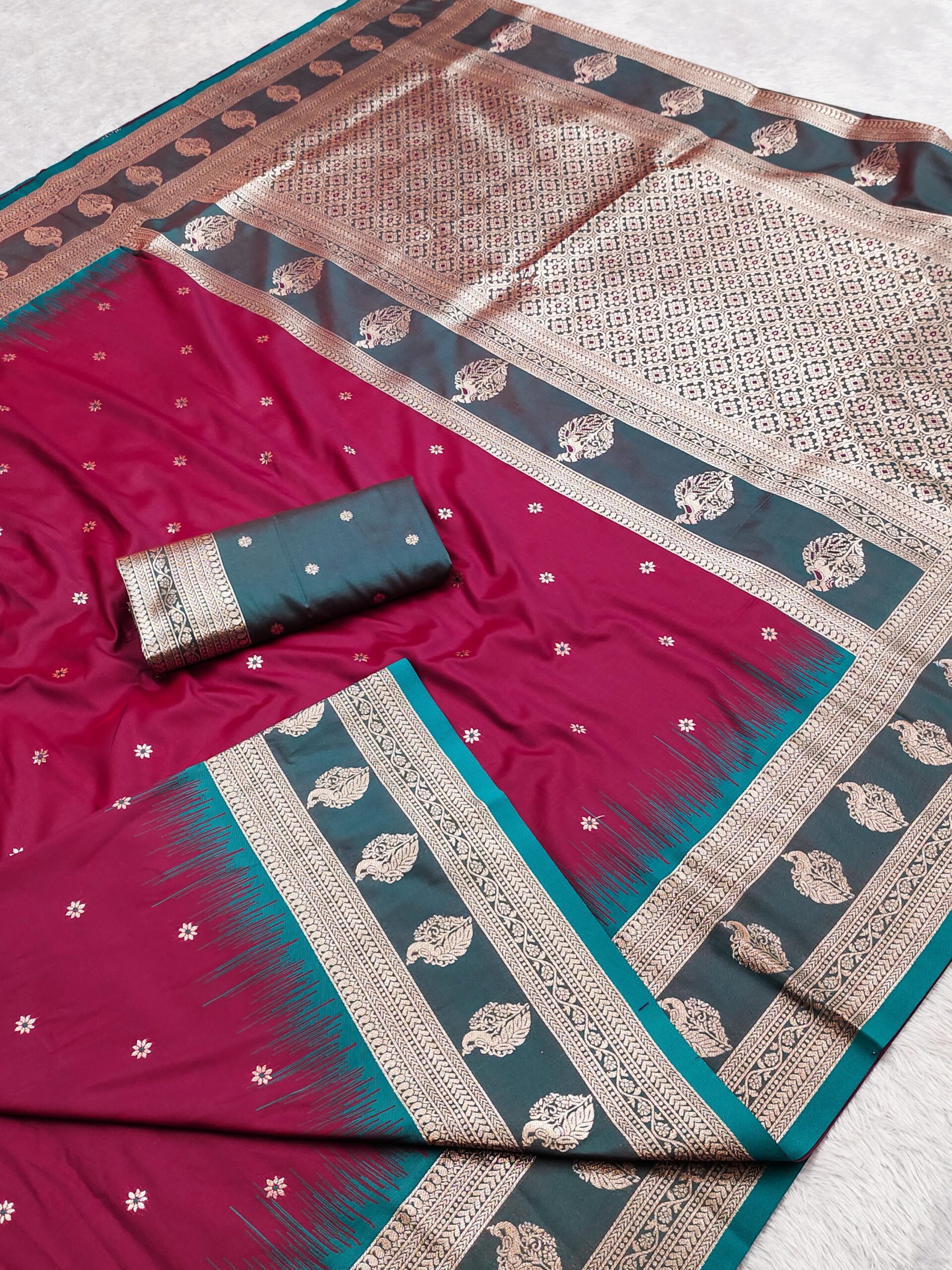 | Work: | The saree is beautifully highlighted with a contrast Banarasi border woven with traditional paisley motifs in rich gold zari And Comes with a grand Meenakari woven pallu. |