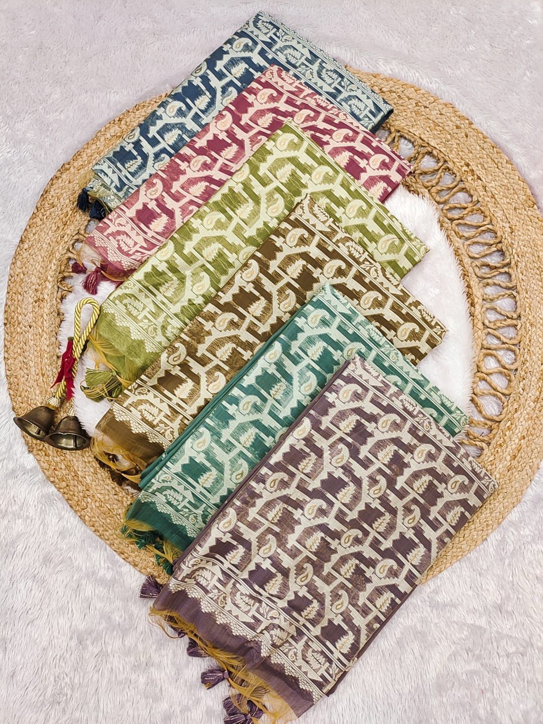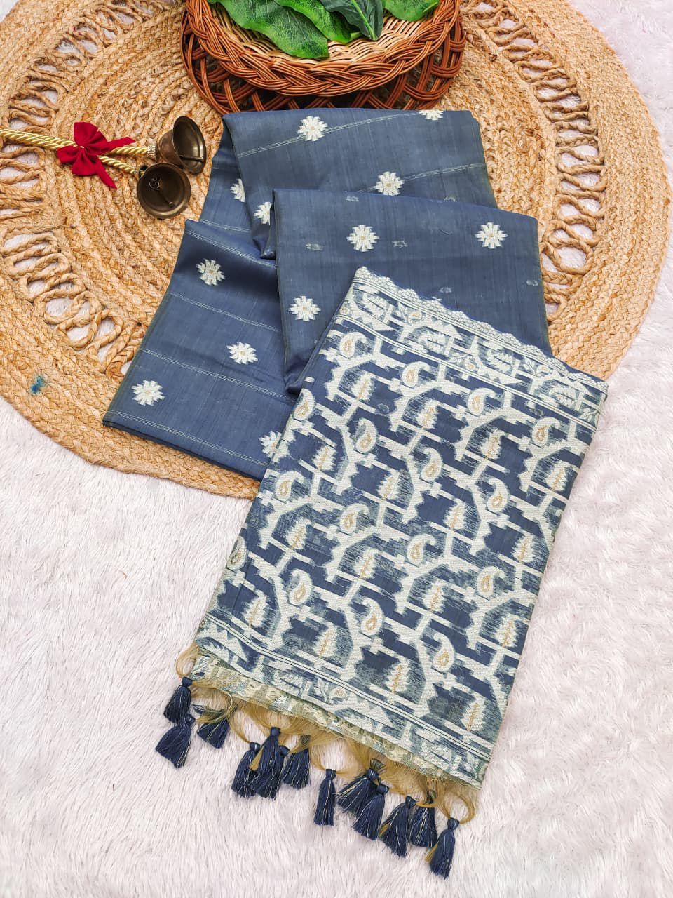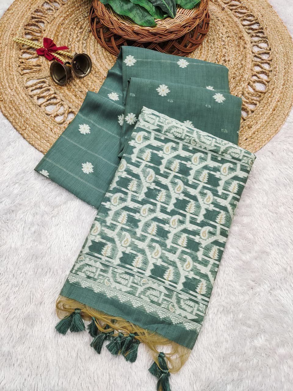 | Fabric: | Premium Soft Chanderi cotton saree with classic jamdani concept pallu and beautiful contrast border with all over weaving butties |