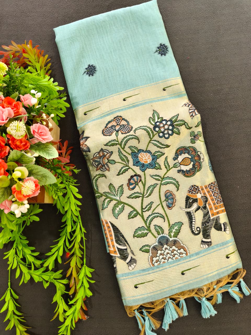 | Fabric: | Premium Soft moga cotton paithani saree with classic resham weaving paithani pallu and muniya weaving zari border with all over weaving butties and |