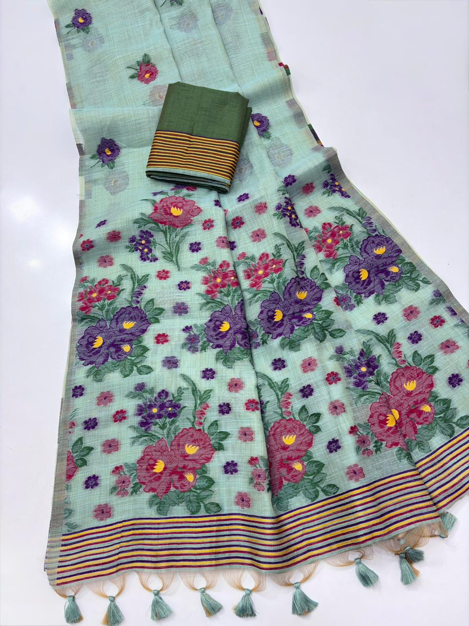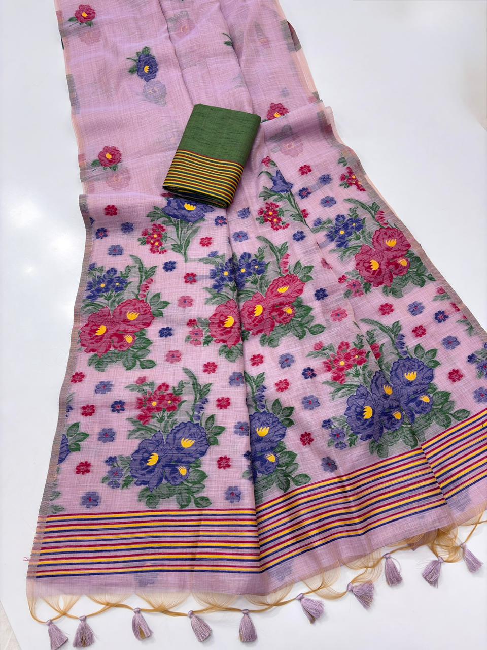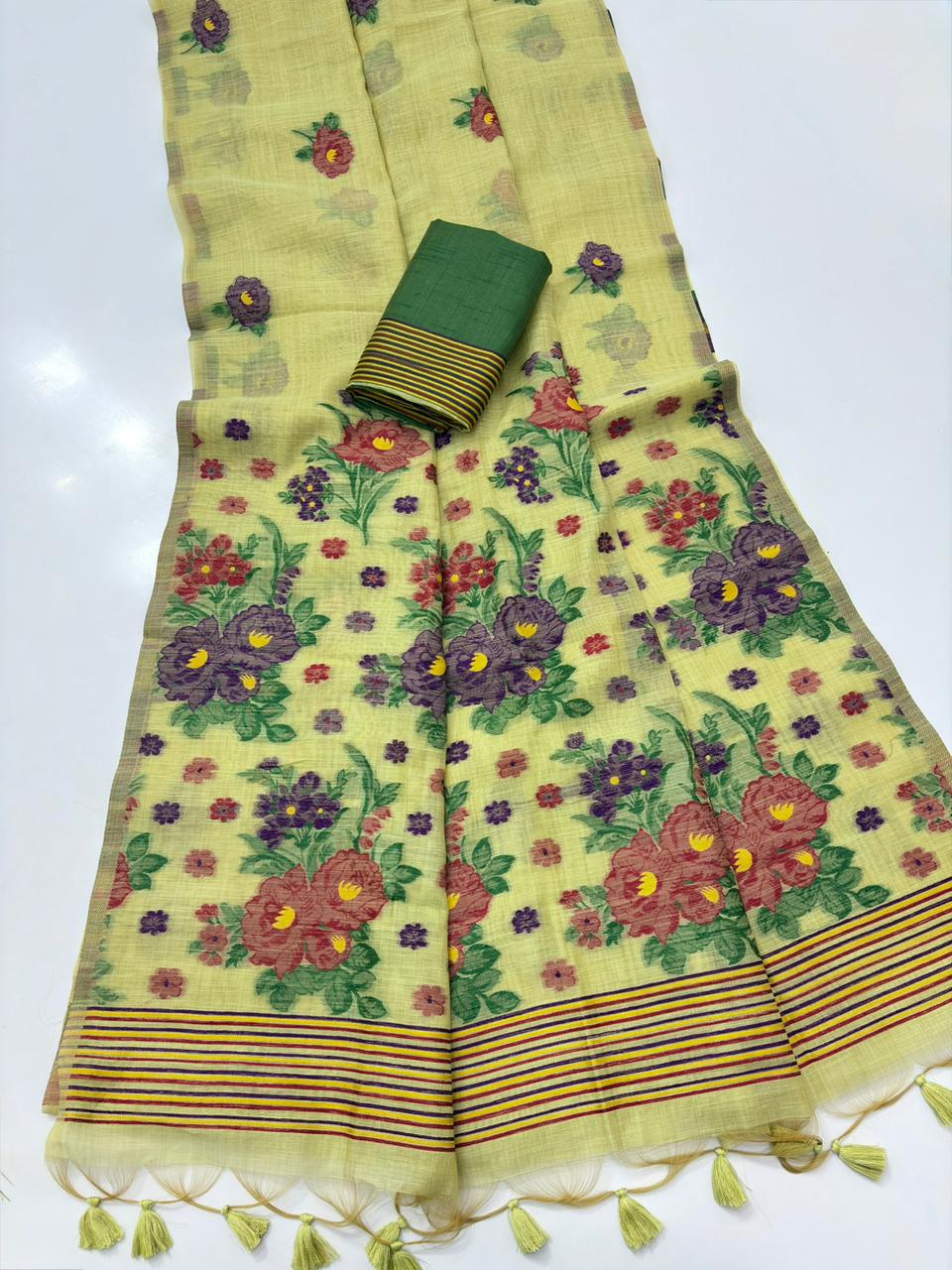 Fabric: Premium Soft Muga Cotton Saree With Meena Weaving Floral Design Jamdani Pallu & All Over Resham Weaving Buttas With Fancy Tassels And