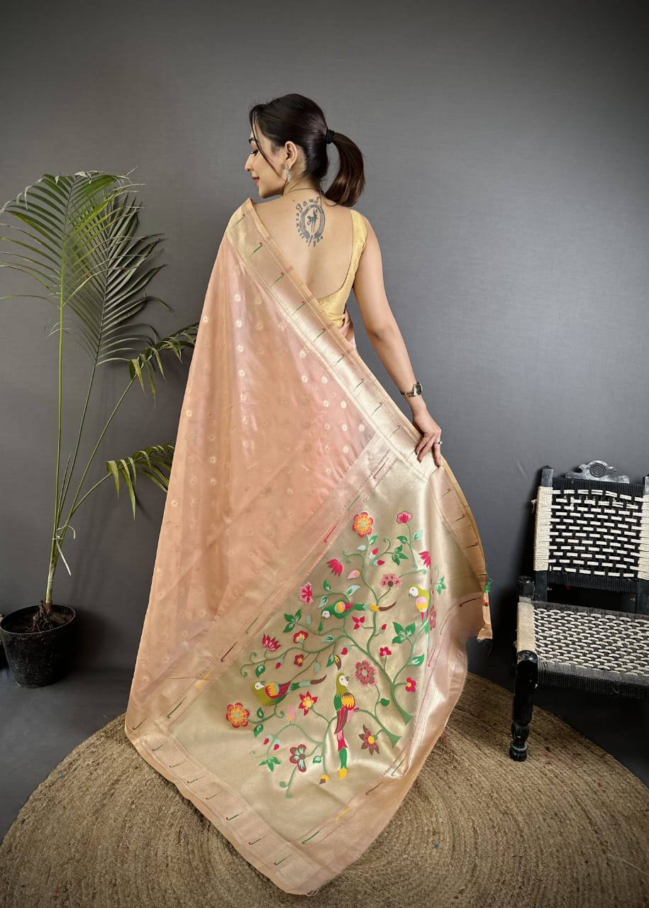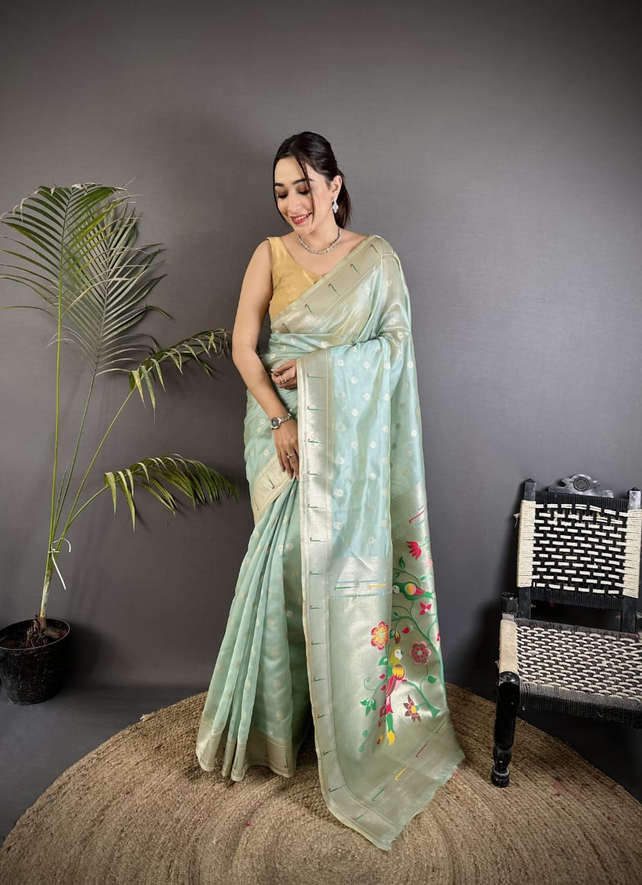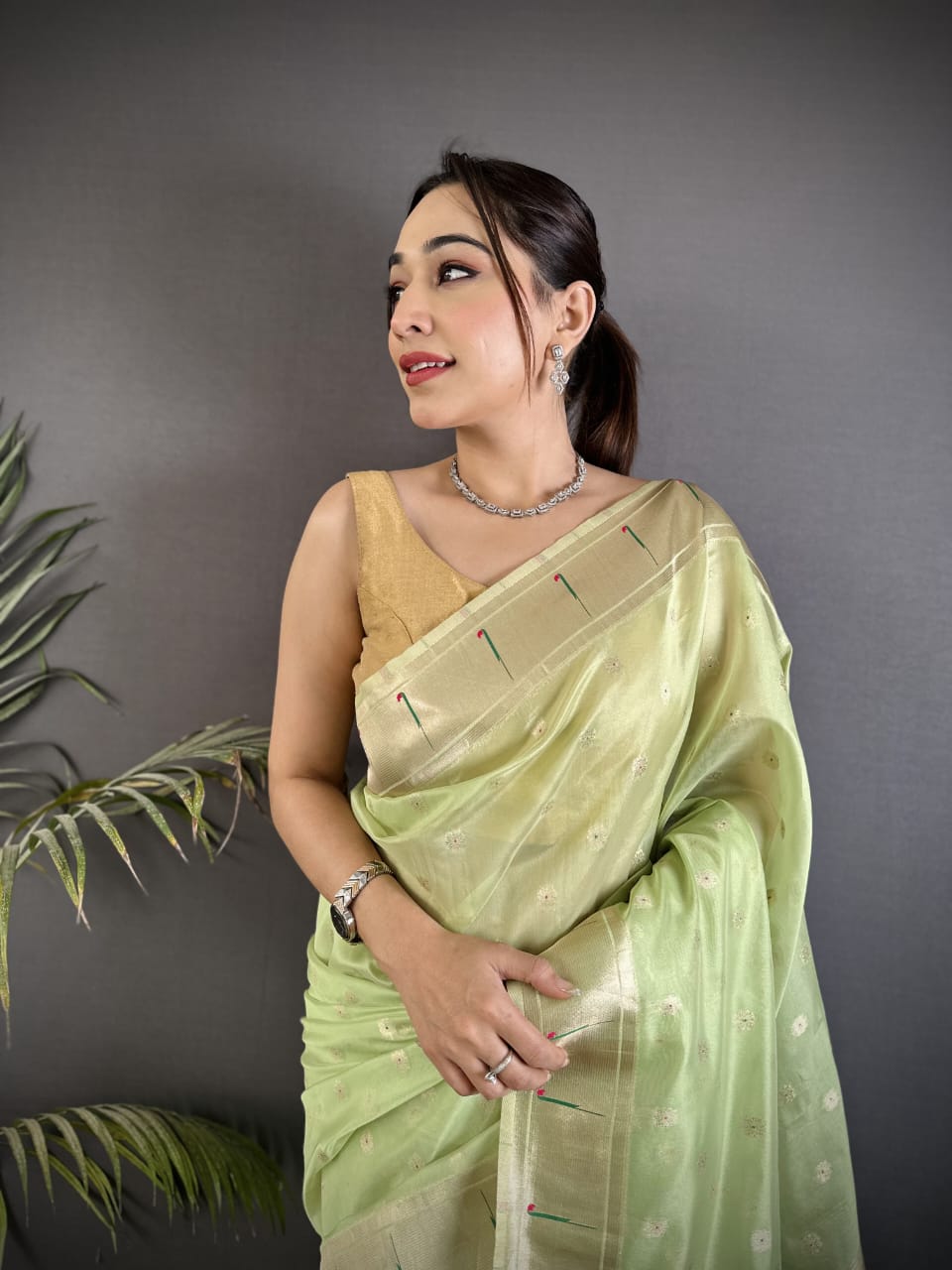 | Fabric: | Paithani saree Heavy Tissue mina butti with weaving Jari and attractive color combination Pallu. |
