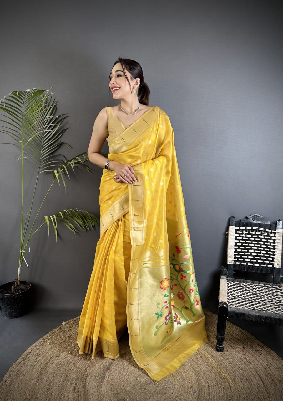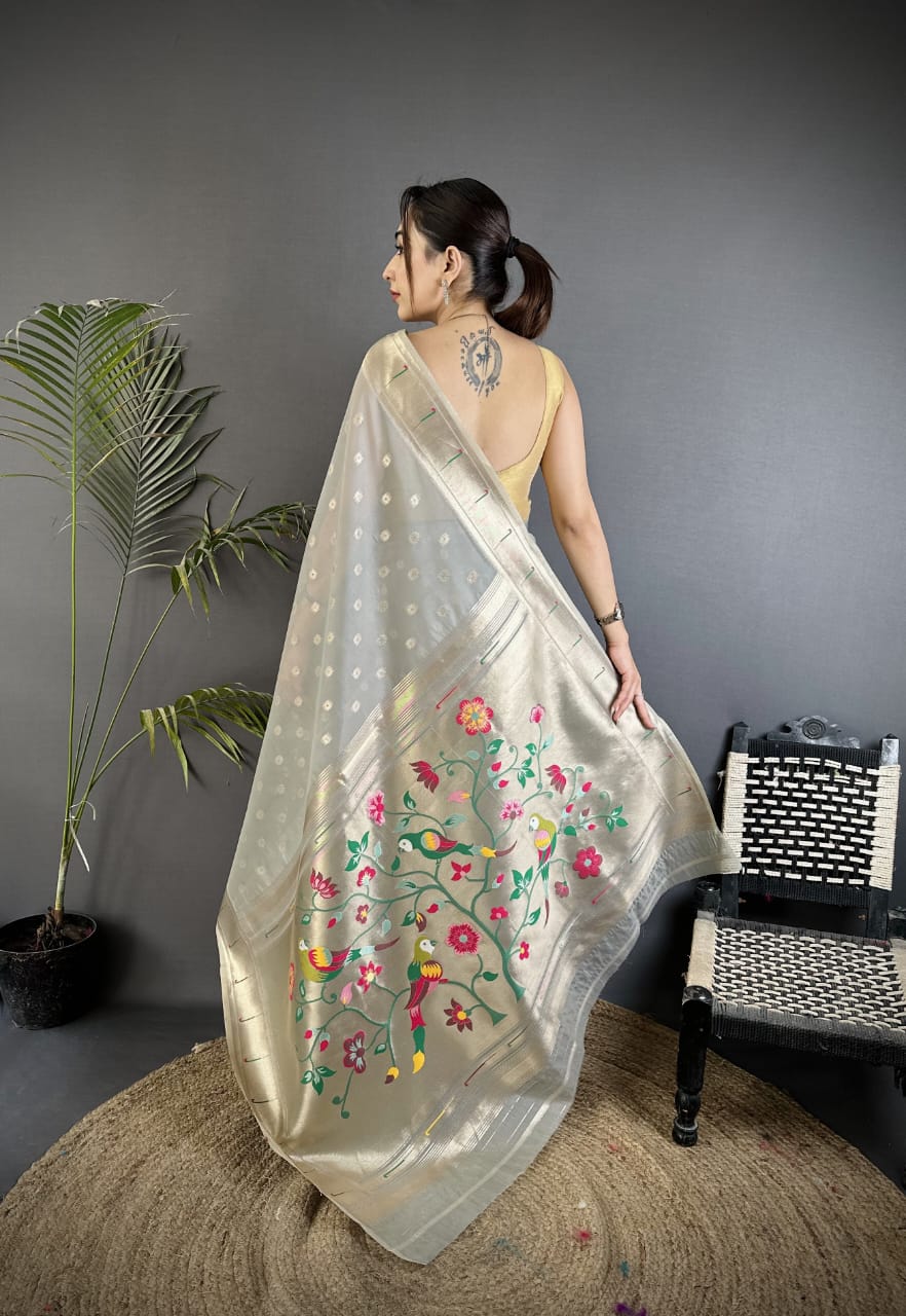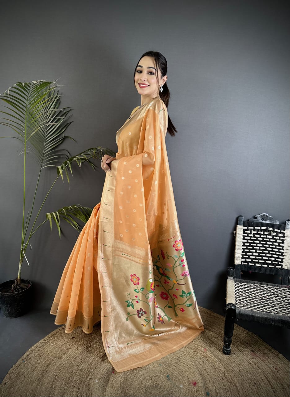 | Fabric: | Paithani saree Heavy Tissue mina butti with weaving Jari and attractive color combination Pallu. |
