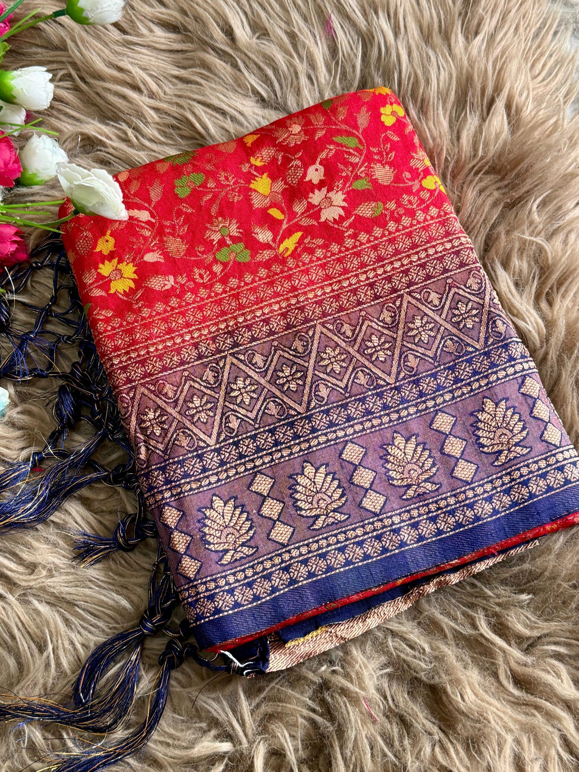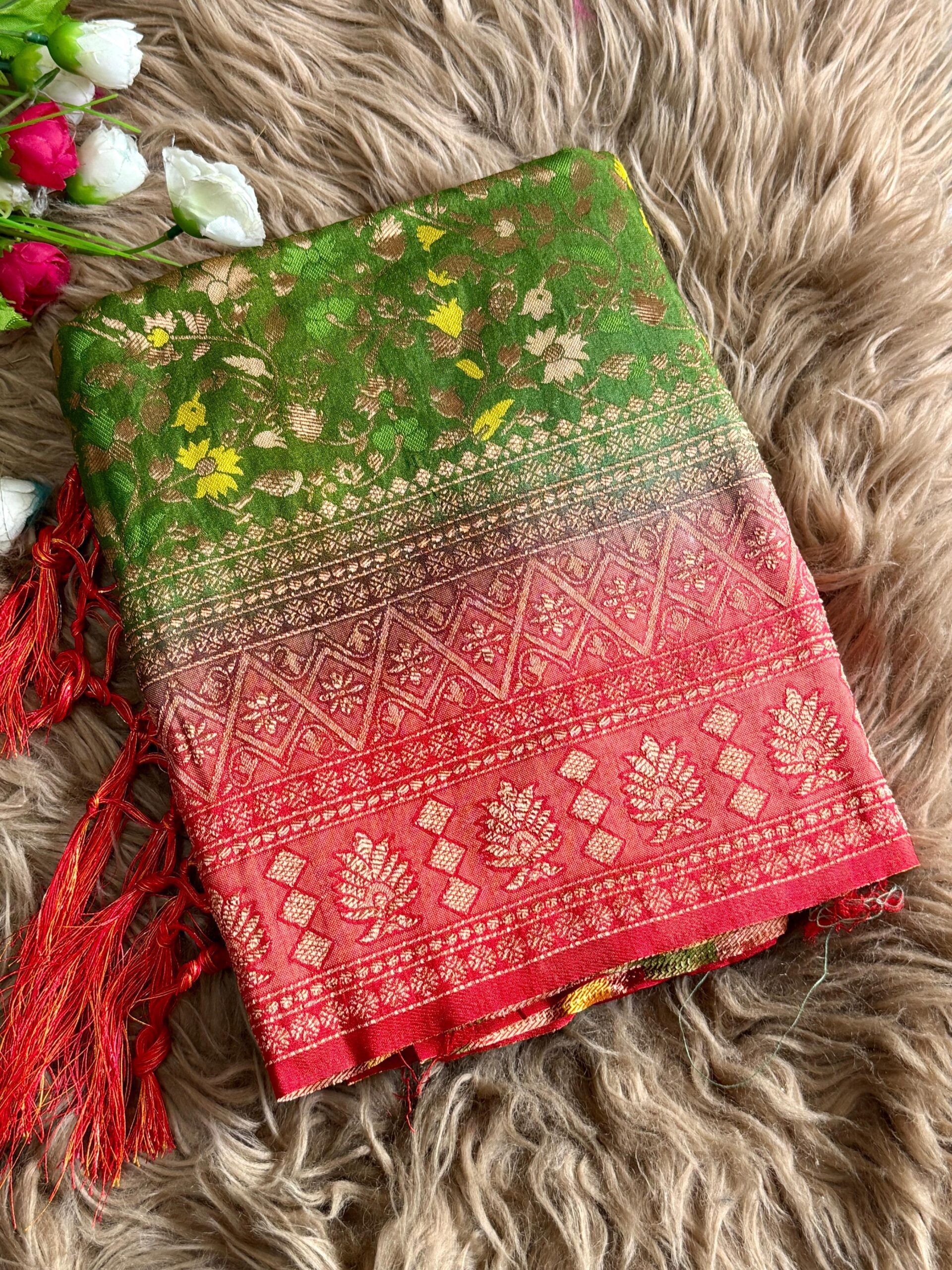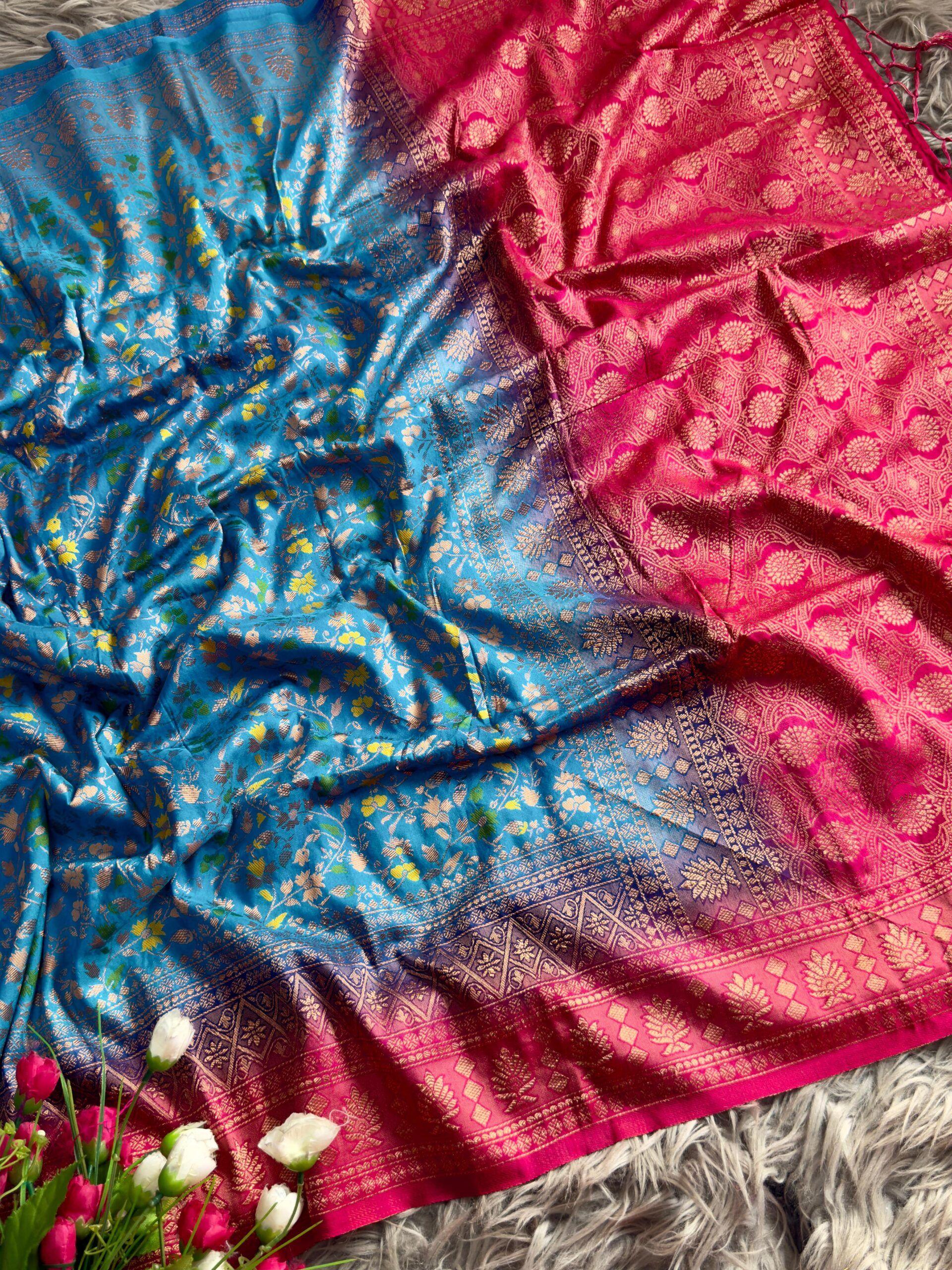 Fabric: Two-tone dyed Banarasi jal design saree in smooth nylon fabric, featuring a graceful jhalar on pallu. Finished with a rich contrast pallu, elegant border, and . Available in 10 beautiful colour options—perfect for festive and special occasions