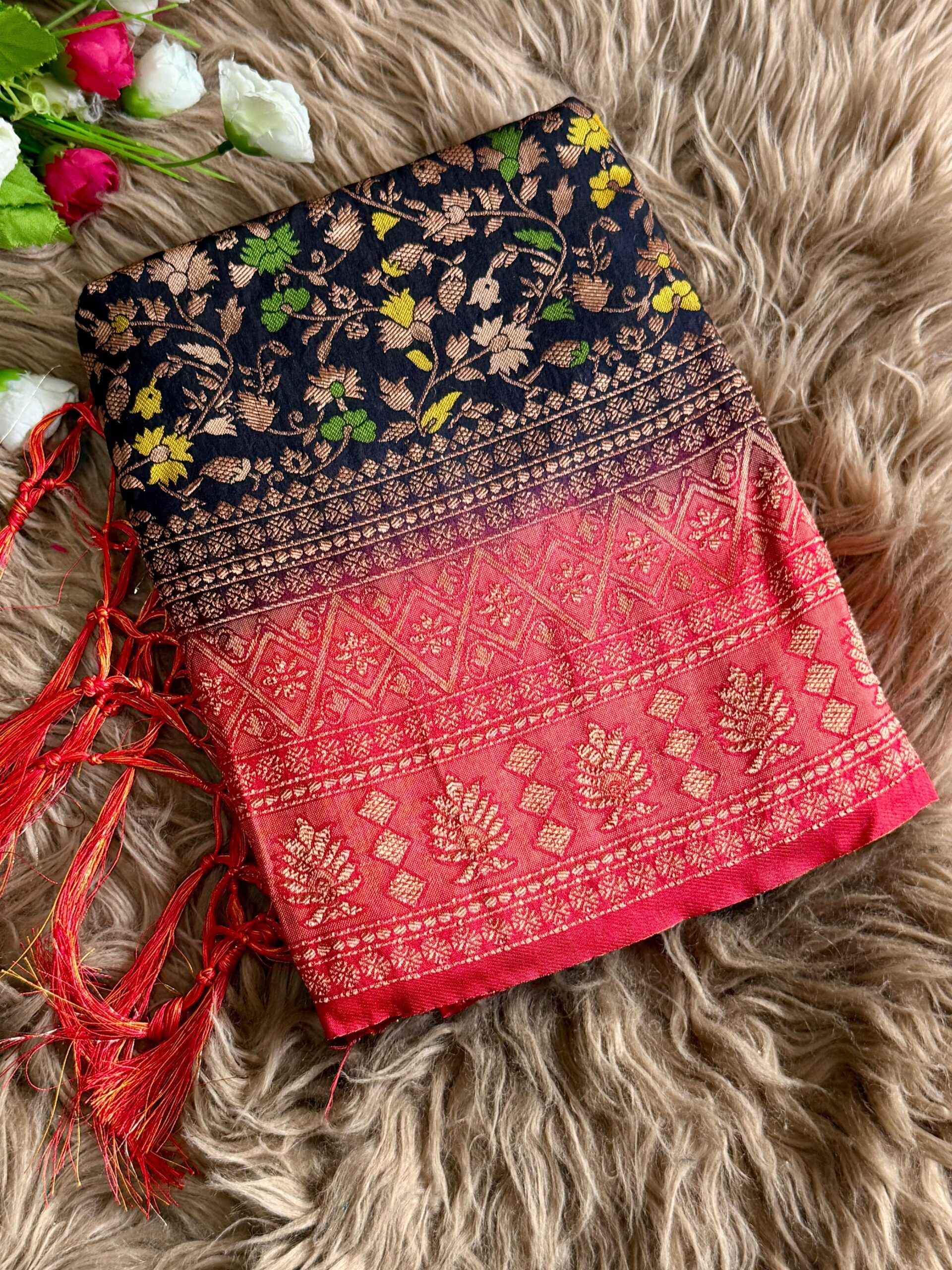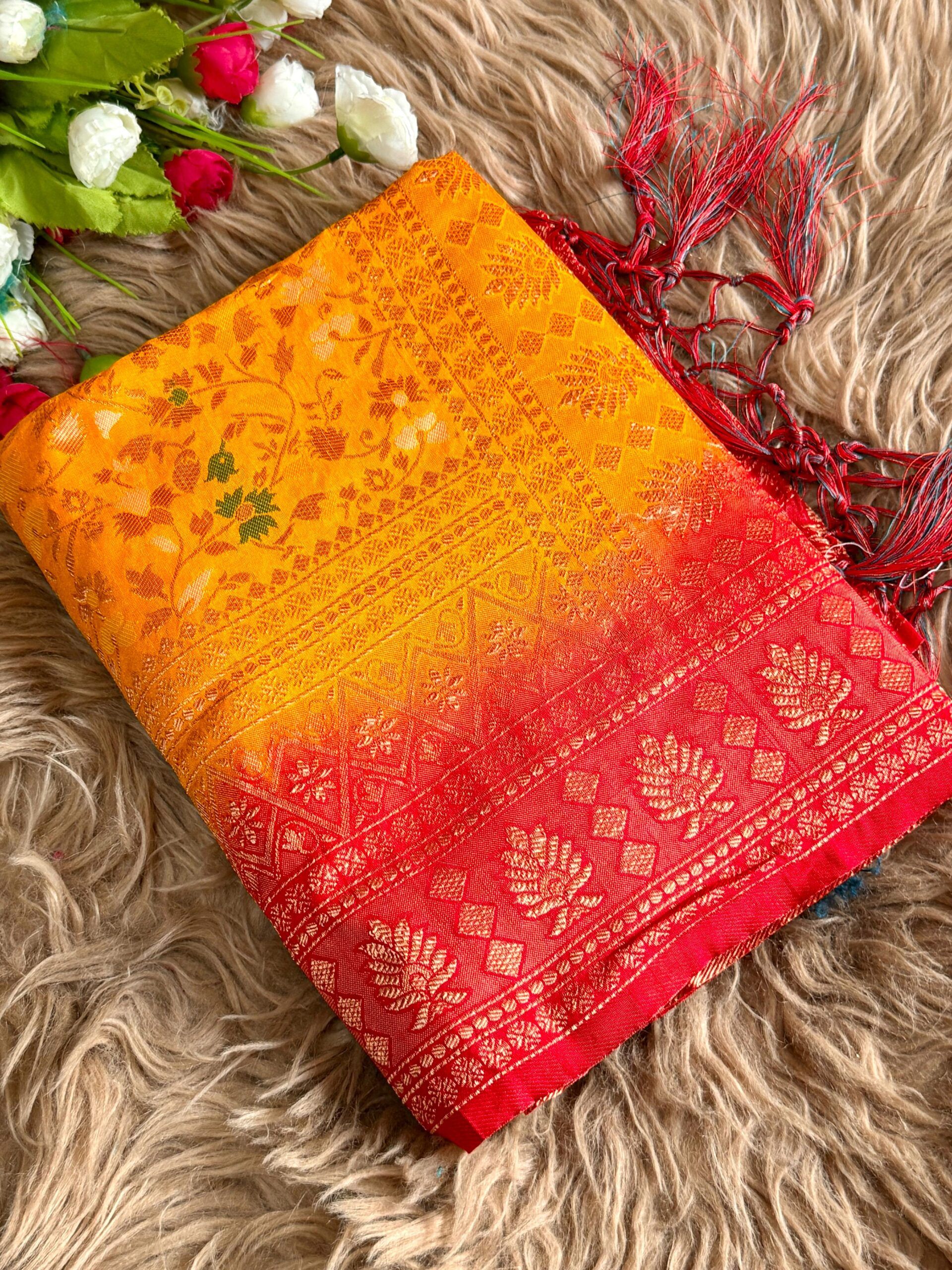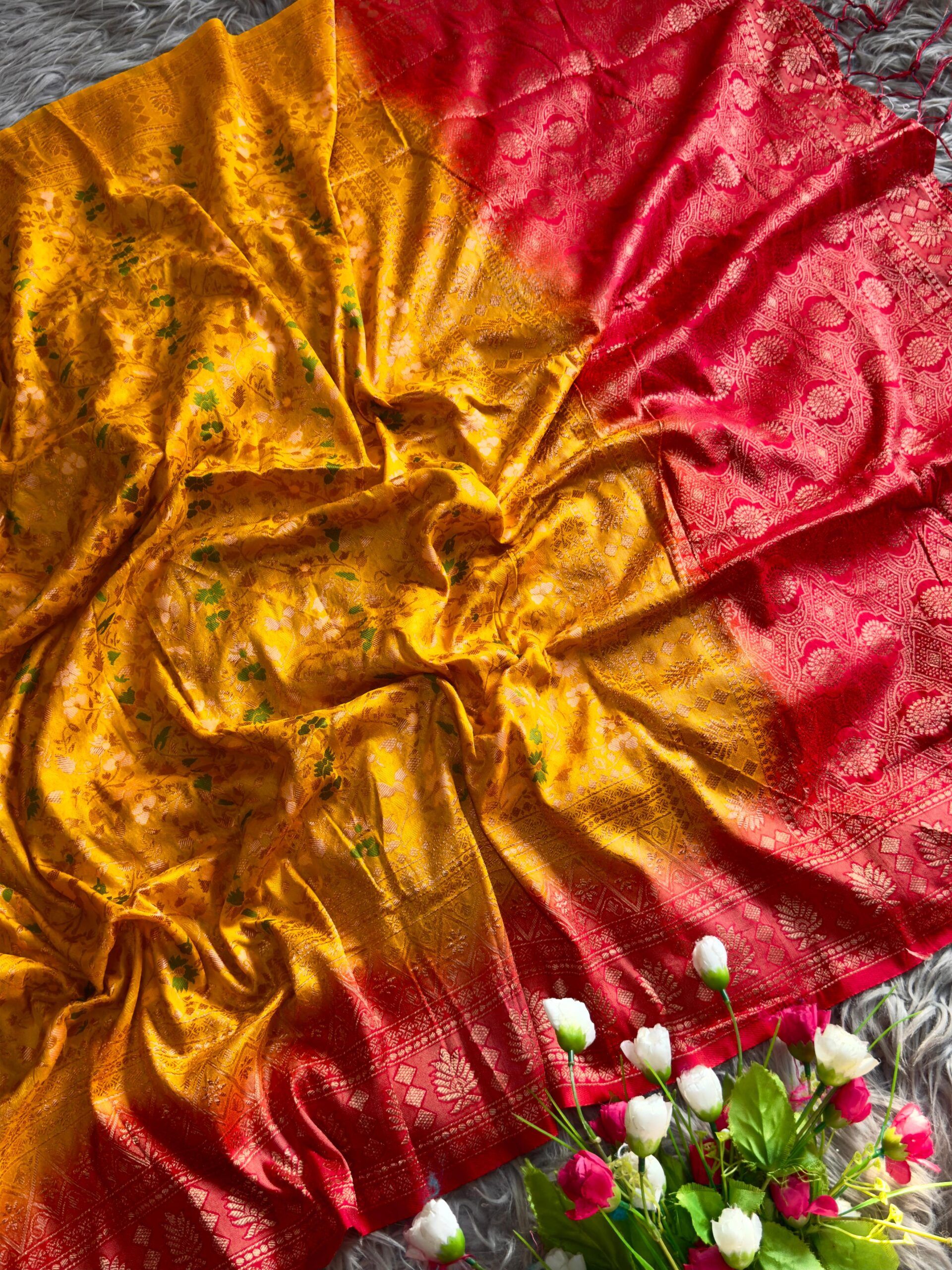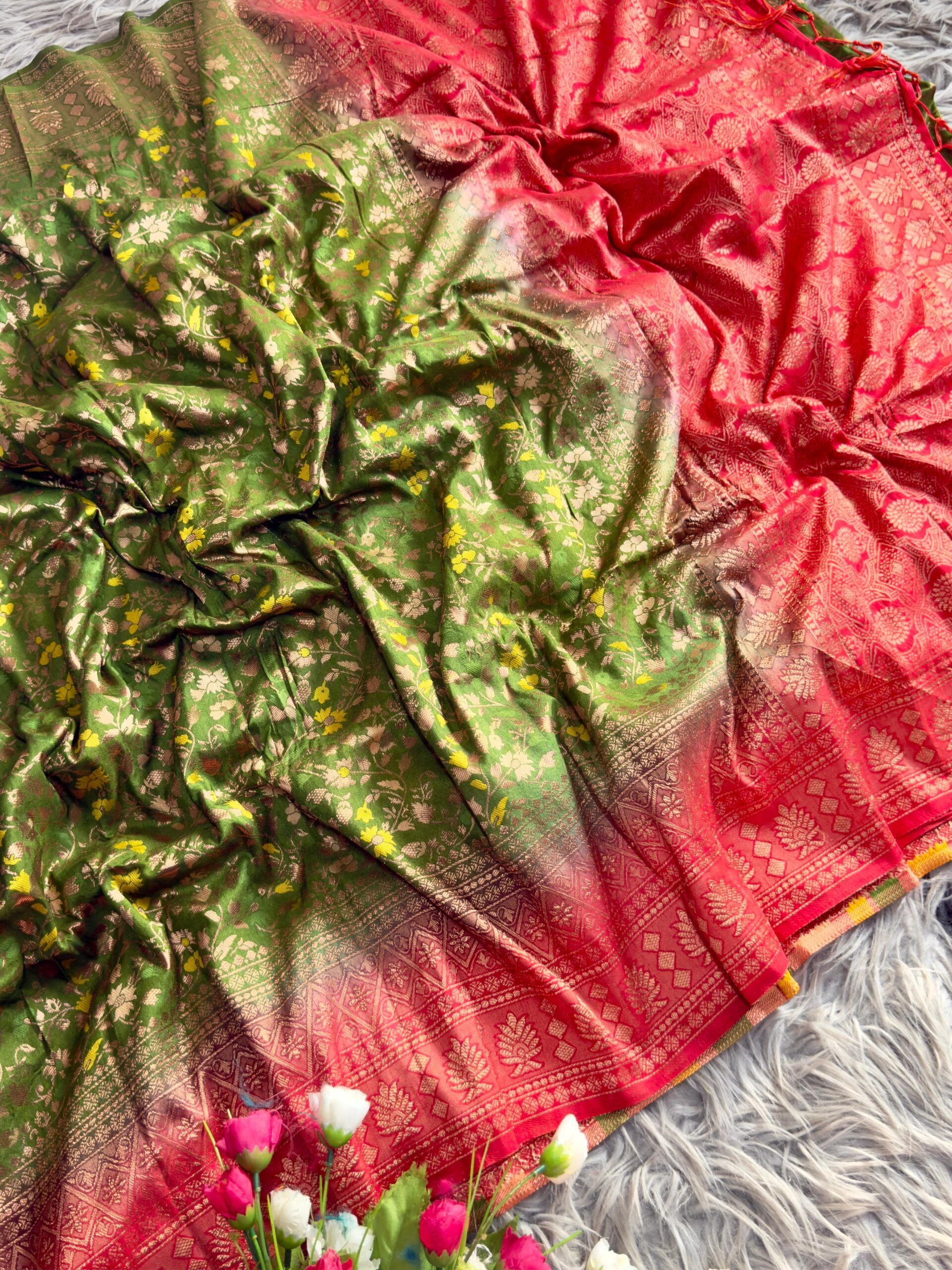 Fabric: Two-tone dyed Banarasi jal design saree in smooth nylon fabric, featuring a graceful jhalar on pallu. Finished with a rich contrast pallu, elegant border, and . Available in 10 beautiful colour options—perfect for festive and special occasions