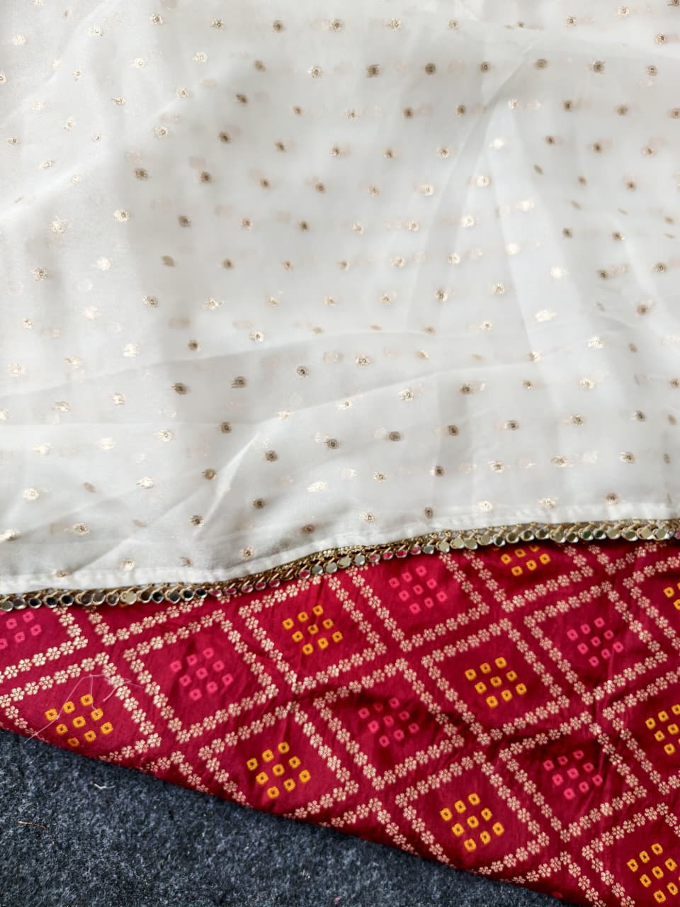 | Blouse: | Teamed with bandhani 1mtr weaved contrast blouse |