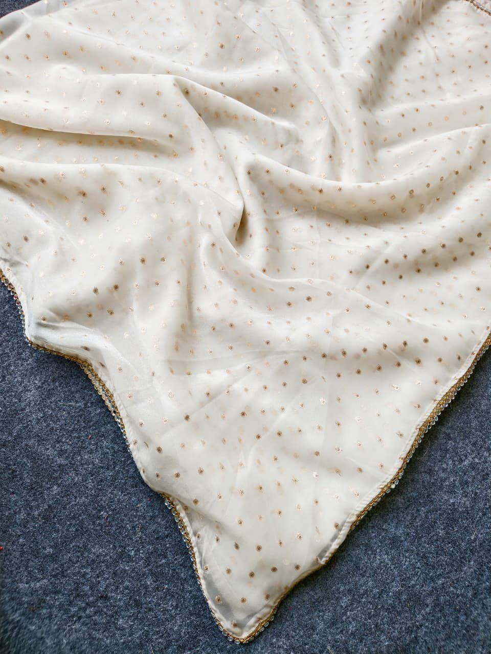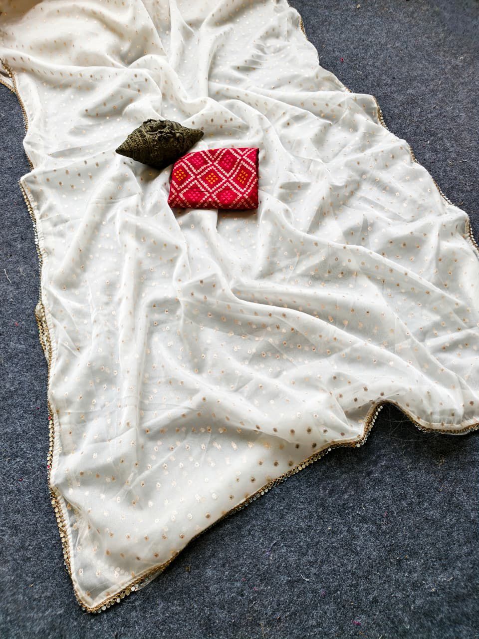 | Fabric: | Pure chiffon organza sarees with beautiful white colour with buttis all Over saree and a mirror lace attached |
