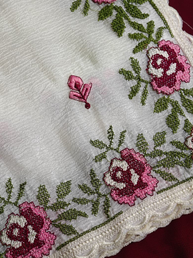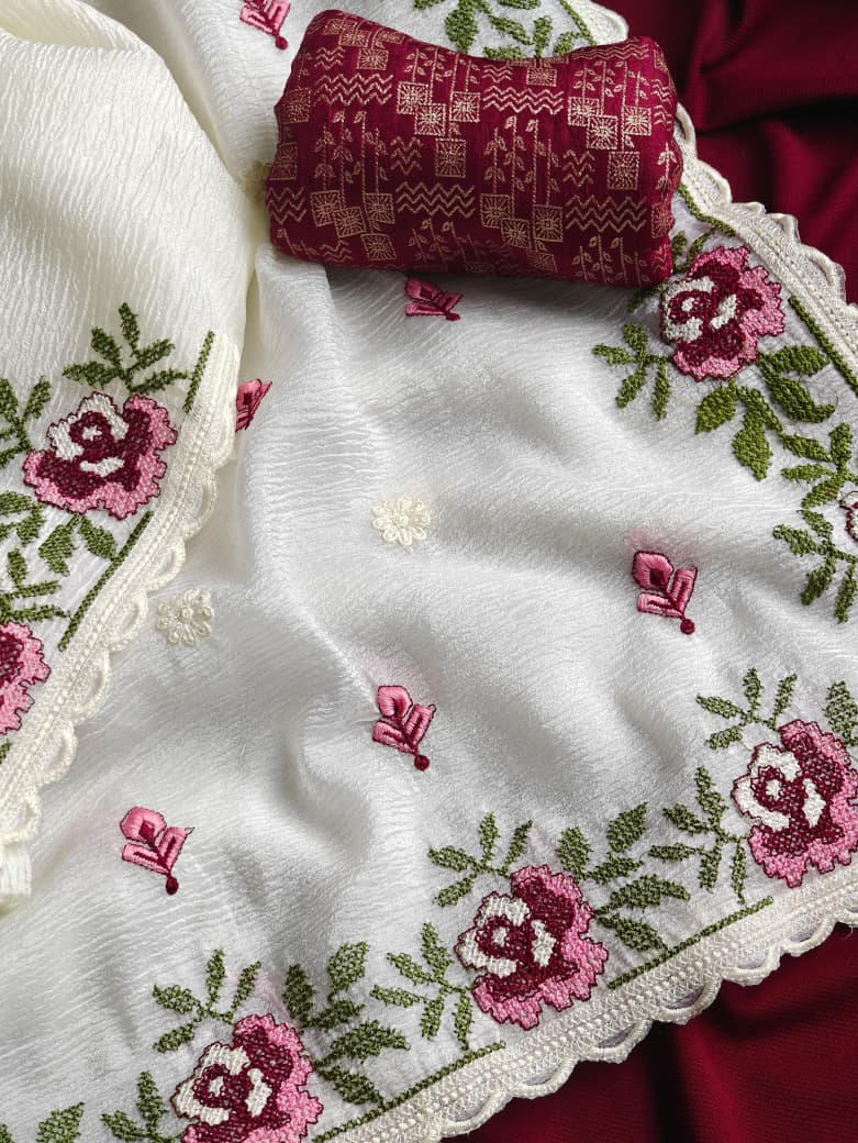 | Fabric: | Pure crush chiffon saree with beautiful multi thread embroidery work, flowers embroidery buttis with beautiful and cutwork border all over. |