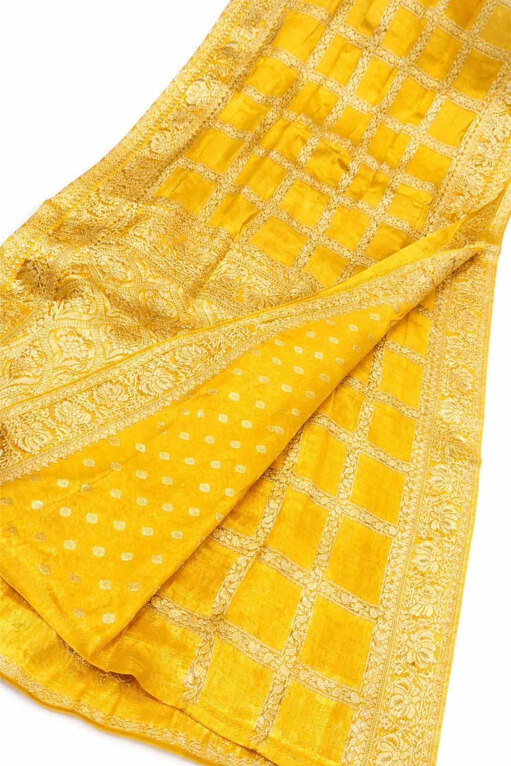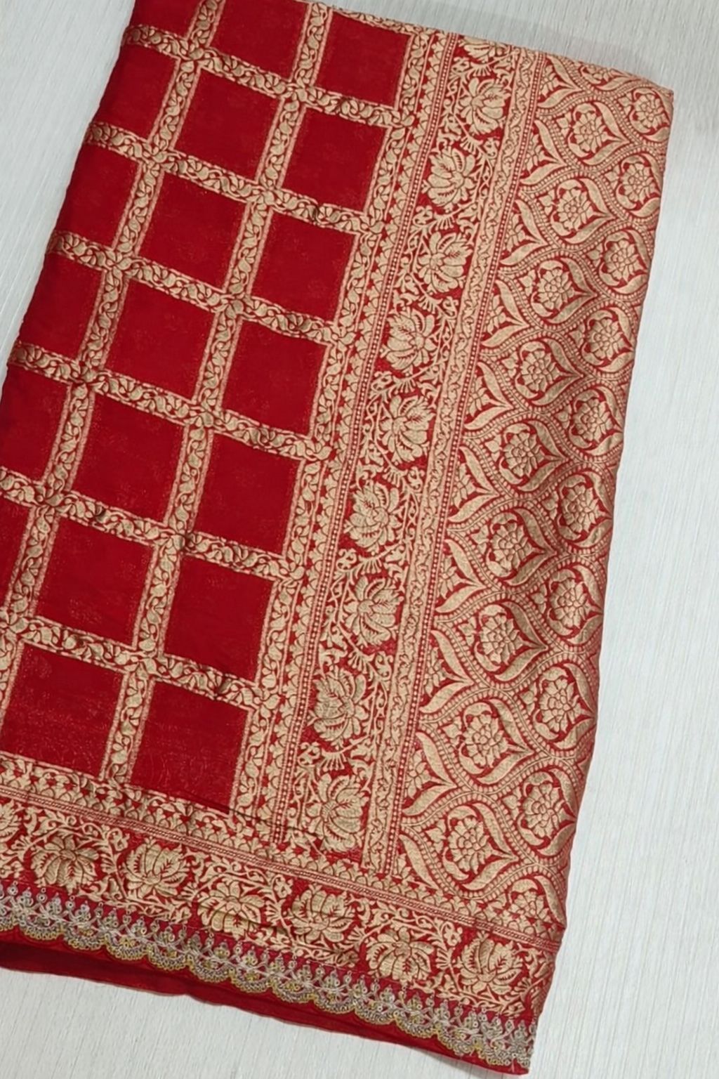 | Fabric: | Pure Dola Silk Weaving Saree With Rich Jari Weaving Pallu having Checks Weaving All over Body With Rich Jari Wooven Border With Scalloped Border on Both Side |