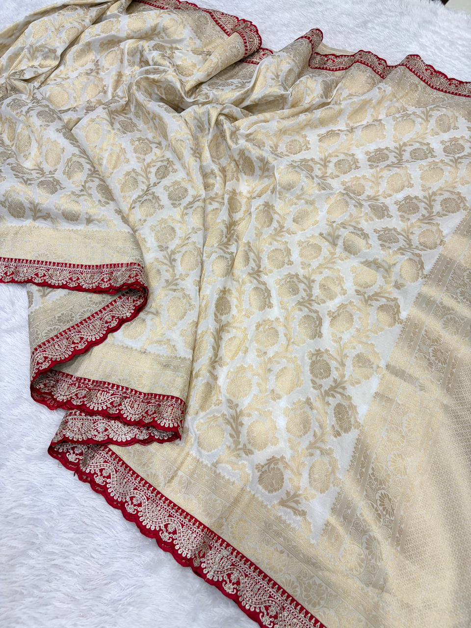 | Fabric: | dorn yourself in this beautiful and charming pure khaddi georgette and dolla designer saree in sabyasachi scallop intricate big work borders kanchi borders meets the tradition |