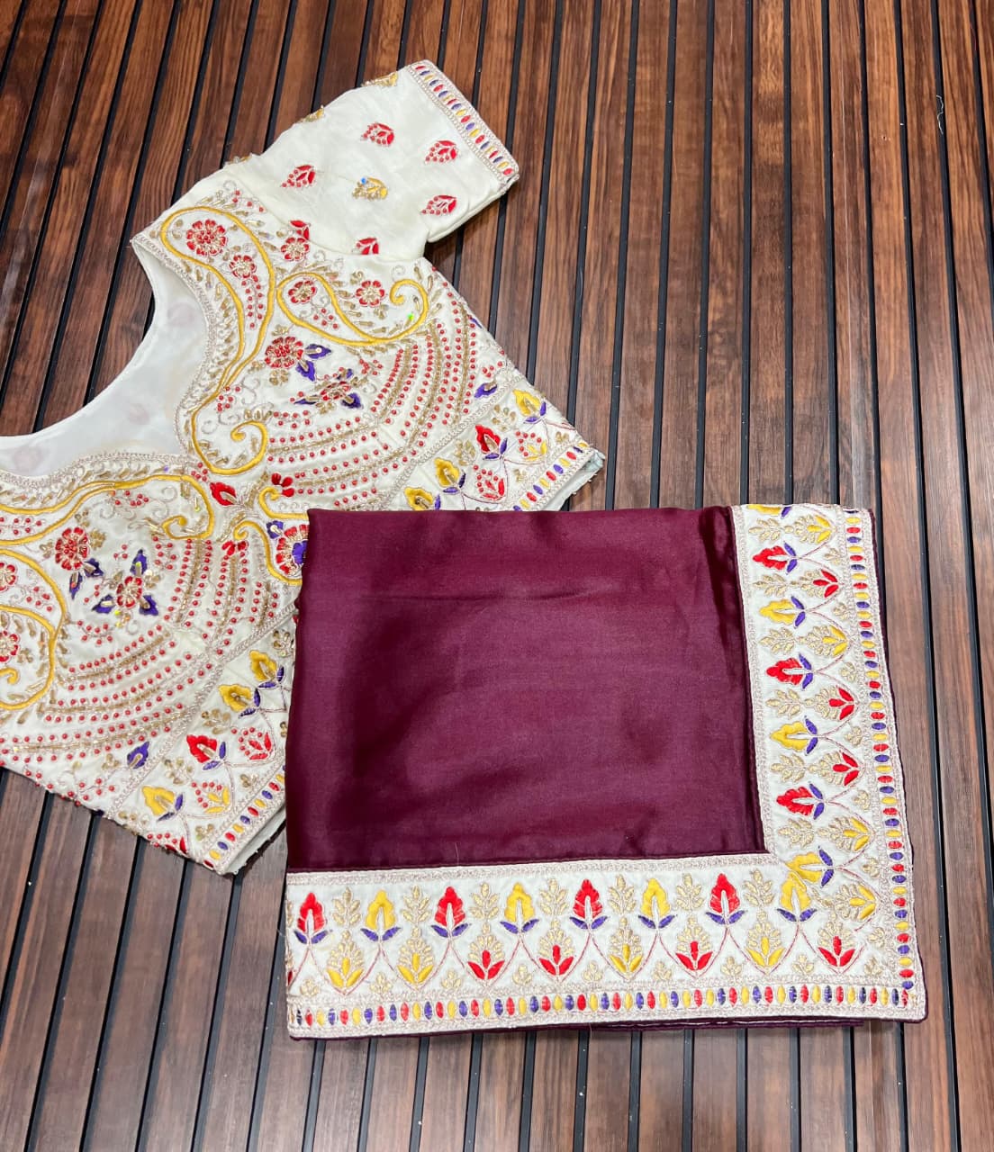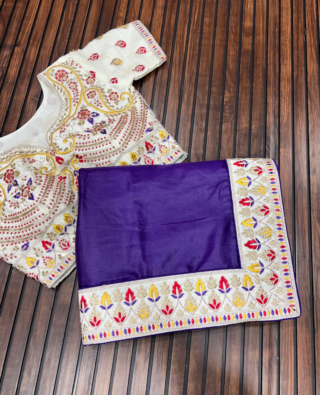 To perfect your wedding attire, you can go for designer blouses that have been embroidered and embellished with stones and gems. You can also wear velvet blouses or sequence blouses as they are trending at the moment.