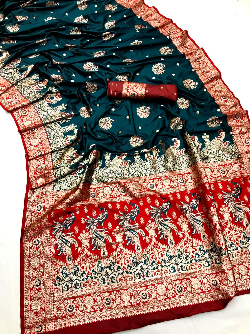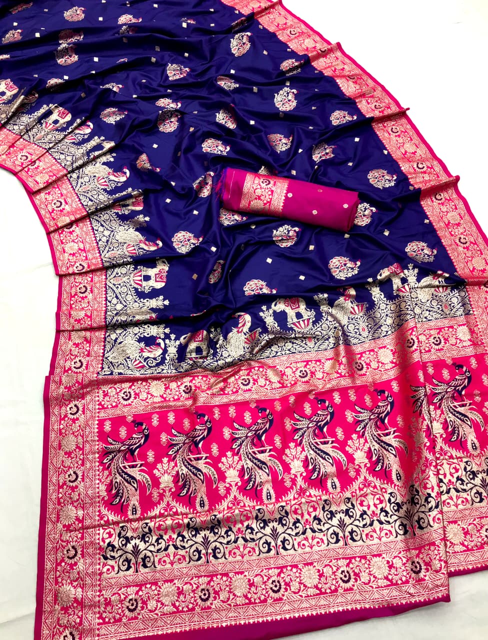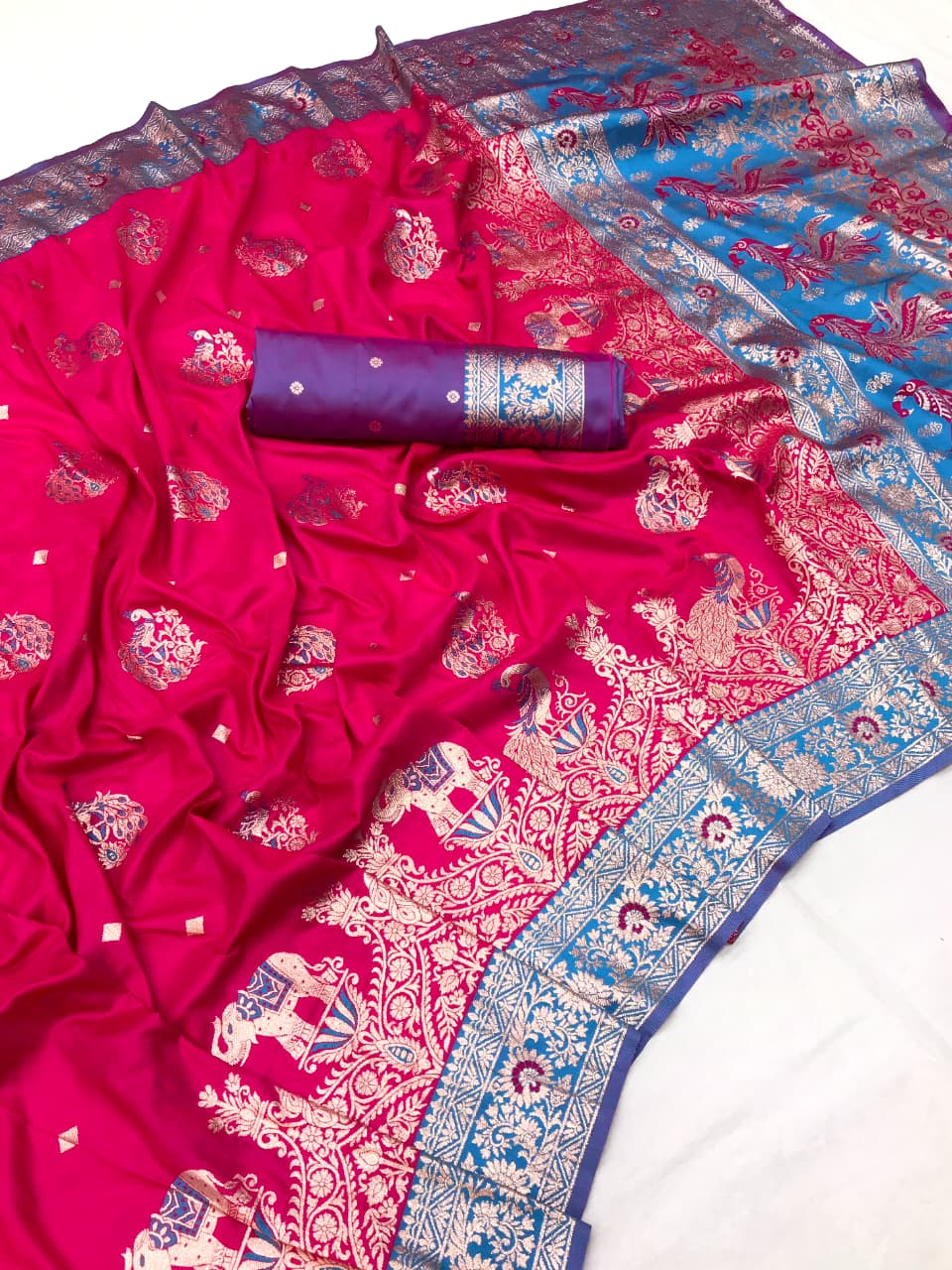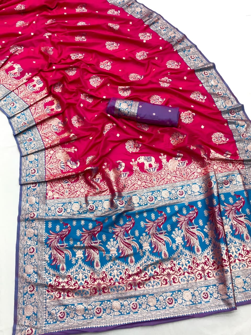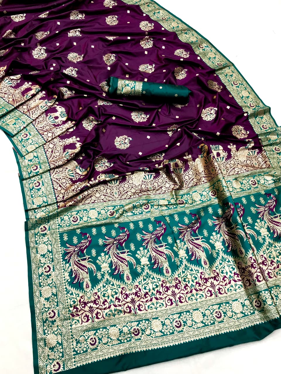 | Fabric: | Pure paithani type Banarasi silk saree with goldn zari weaving Meenakari picok design all over the saree & Meenakari weawing Rich pallu with Meenakari weawing border & attached at Pallu End. |