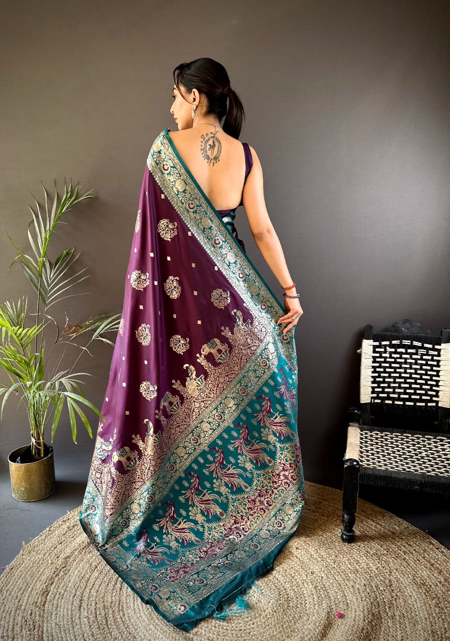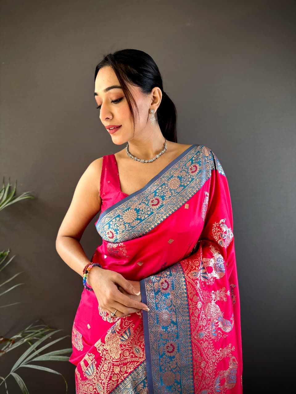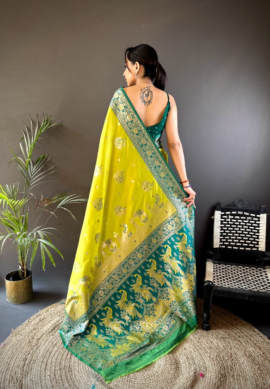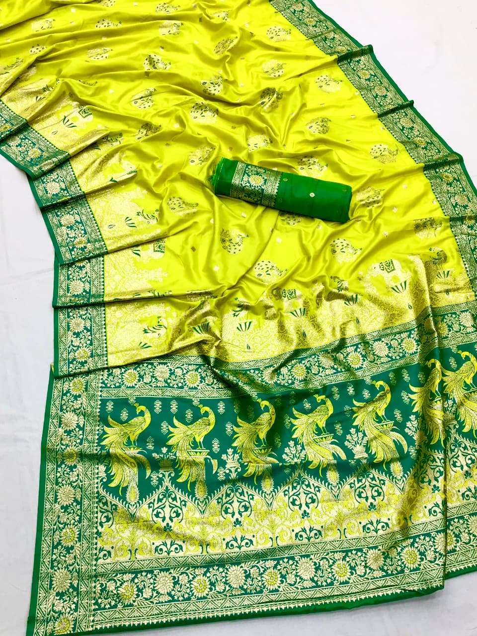 | Fabric: | Pure paithani type Banarasi silk saree with goldn zari weaving Meenakari picok design all over the saree & Meenakari weawing Rich pallu with Meenakari weawing border & attached at Pallu End. |