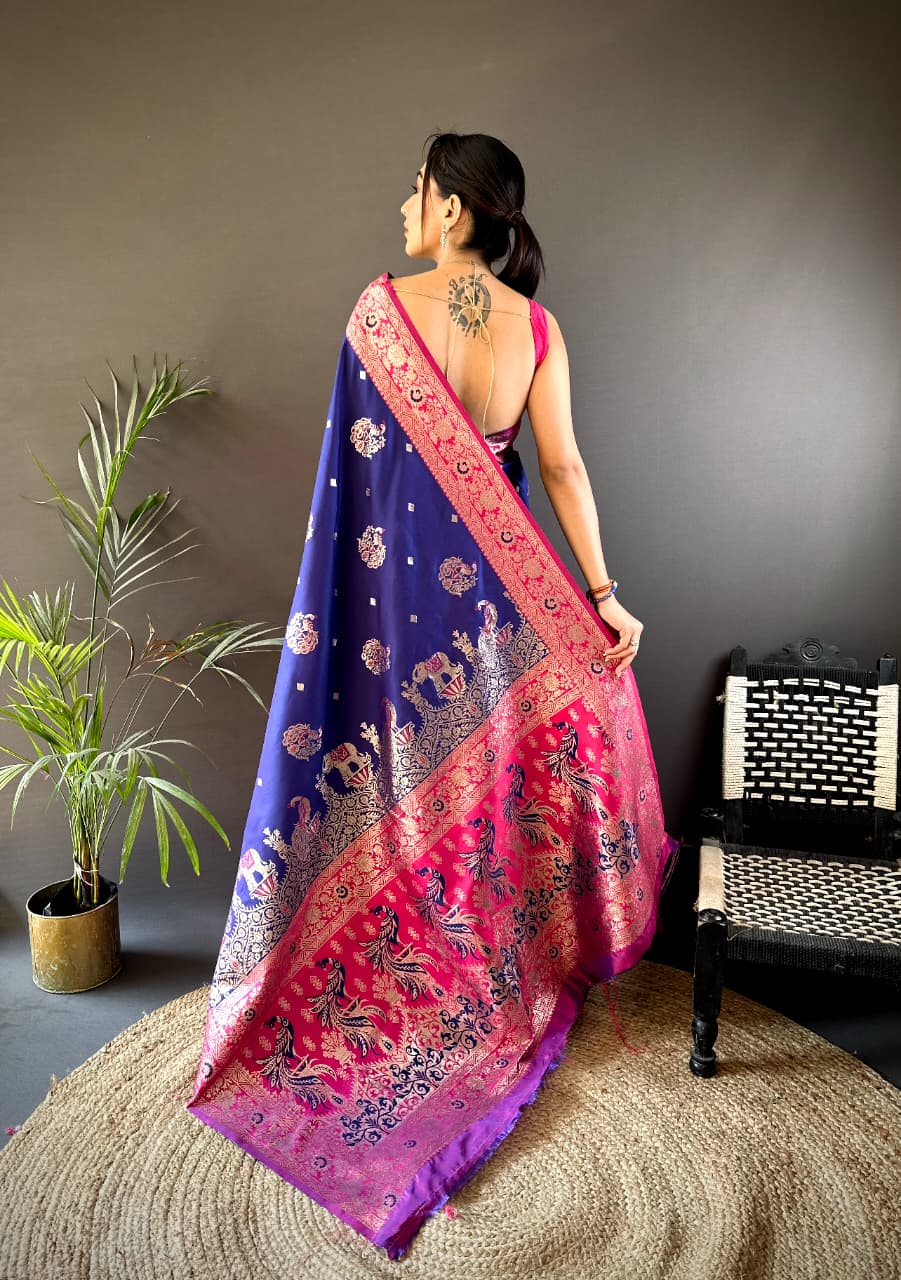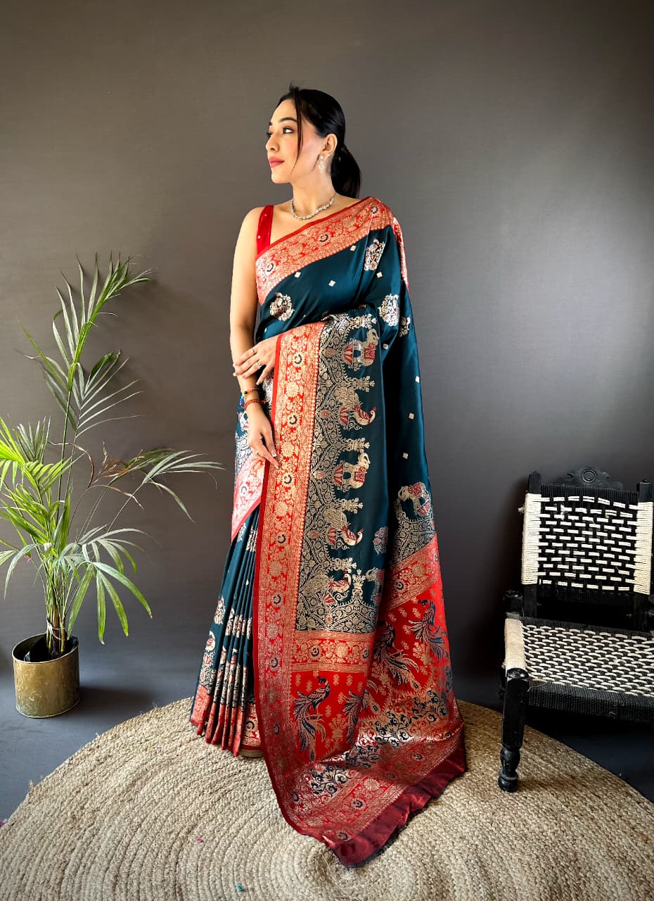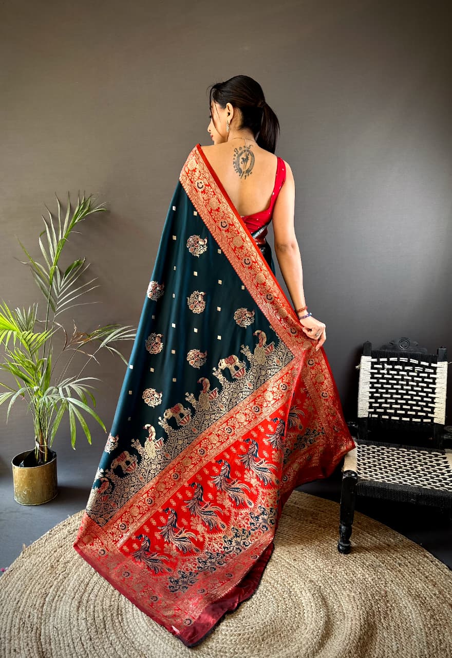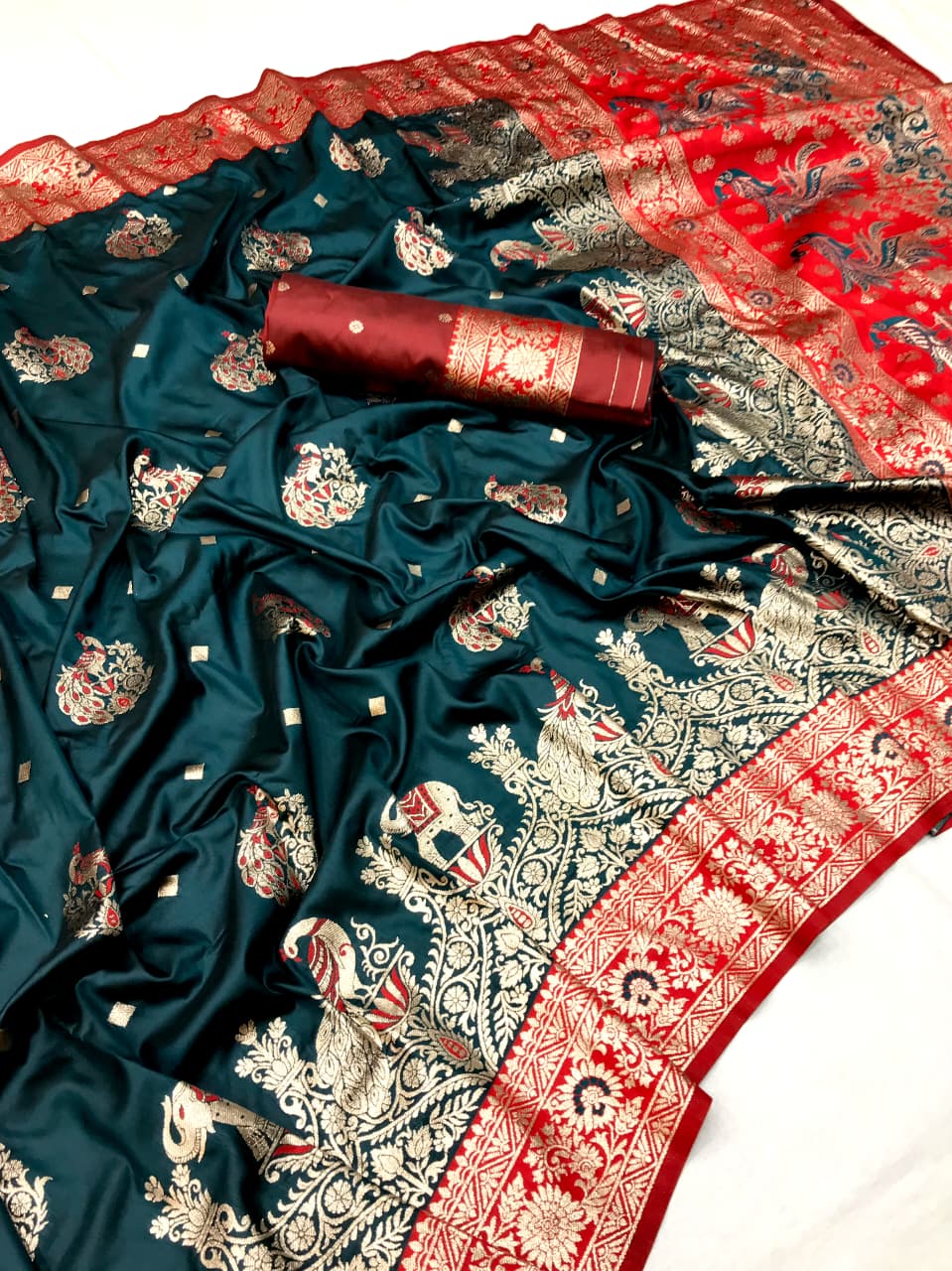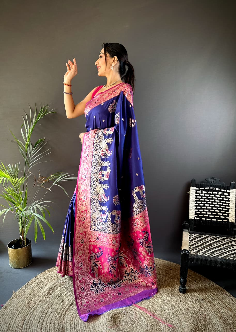 | Fabric: | Pure paithani type Banarasi silk saree with goldn zari weaving Meenakari picok design all over the saree & Meenakari weawing Rich pallu with Meenakari weawing border & attached at Pallu End. |