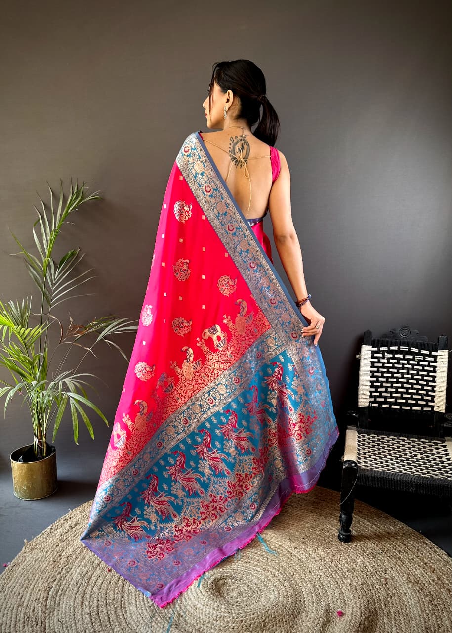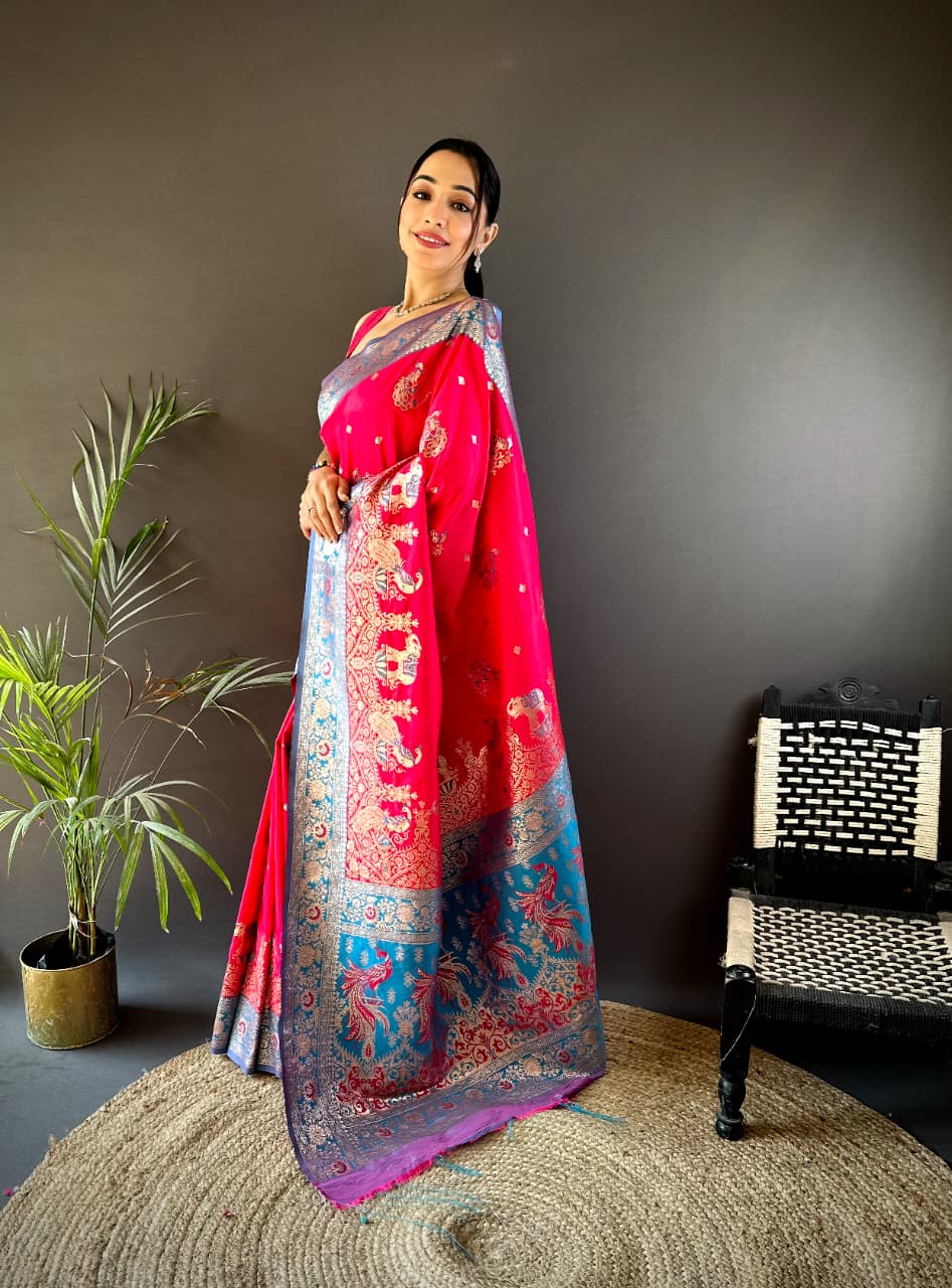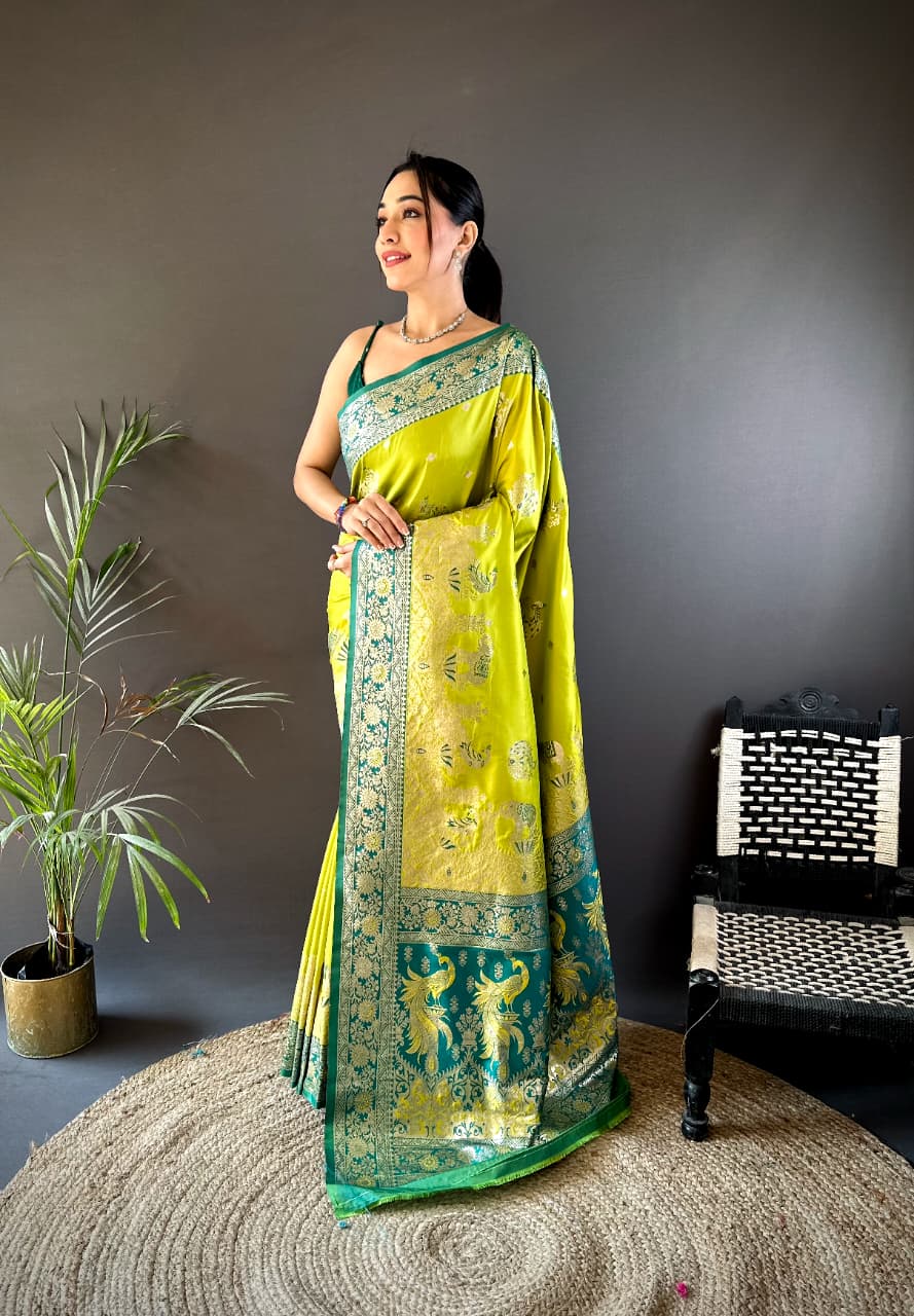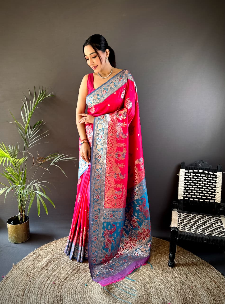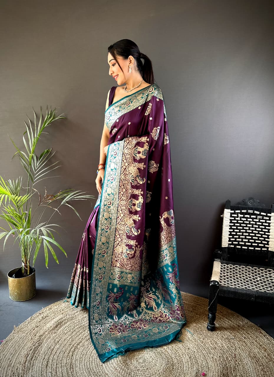 | Fabric: | Pure paithani type Banarasi silk saree with goldn zari weaving Meenakari picok design all over the saree & Meenakari weawing Rich pallu with Meenakari weawing border & attached at Pallu End. |
