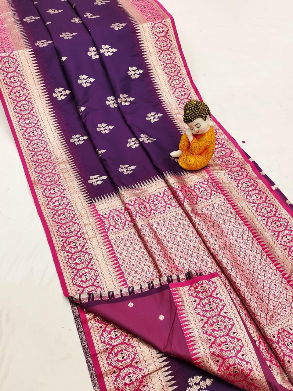 | Work: | Â Rich Mina Work Pallu With All Over Buttan Dijain And Heavy Contrast Boder |
