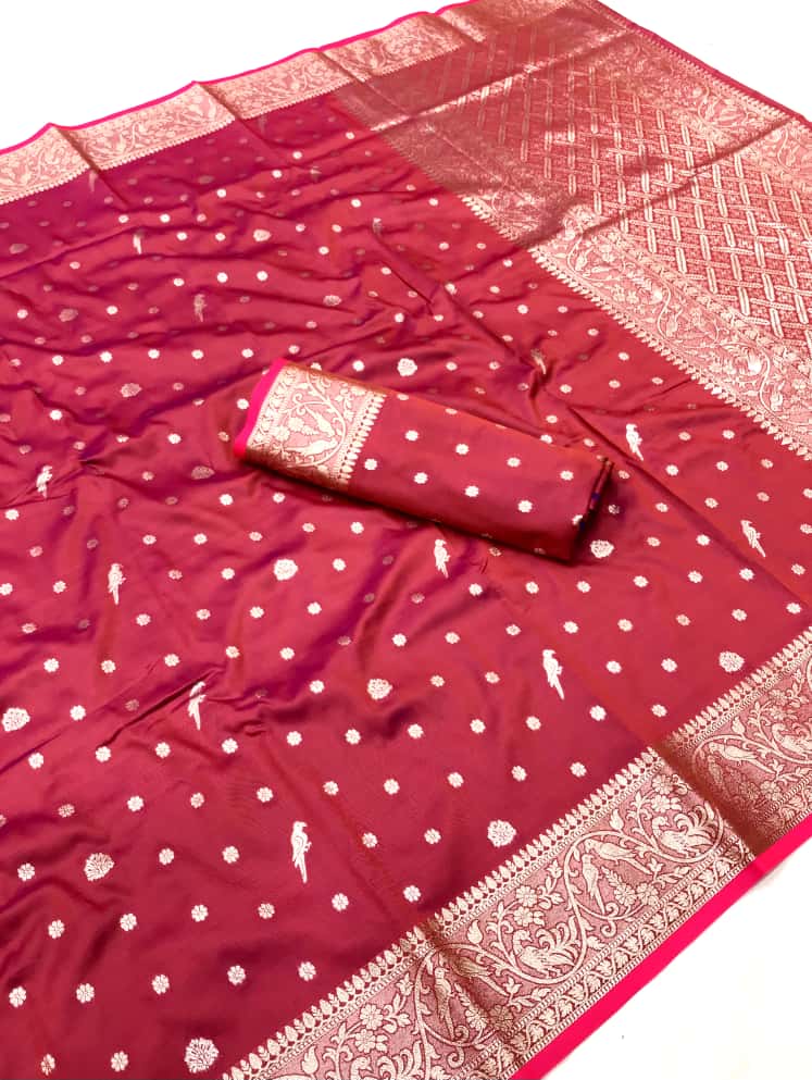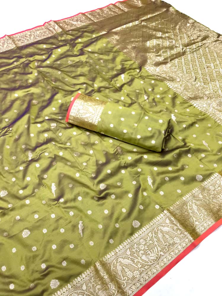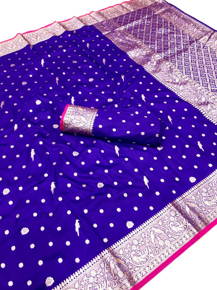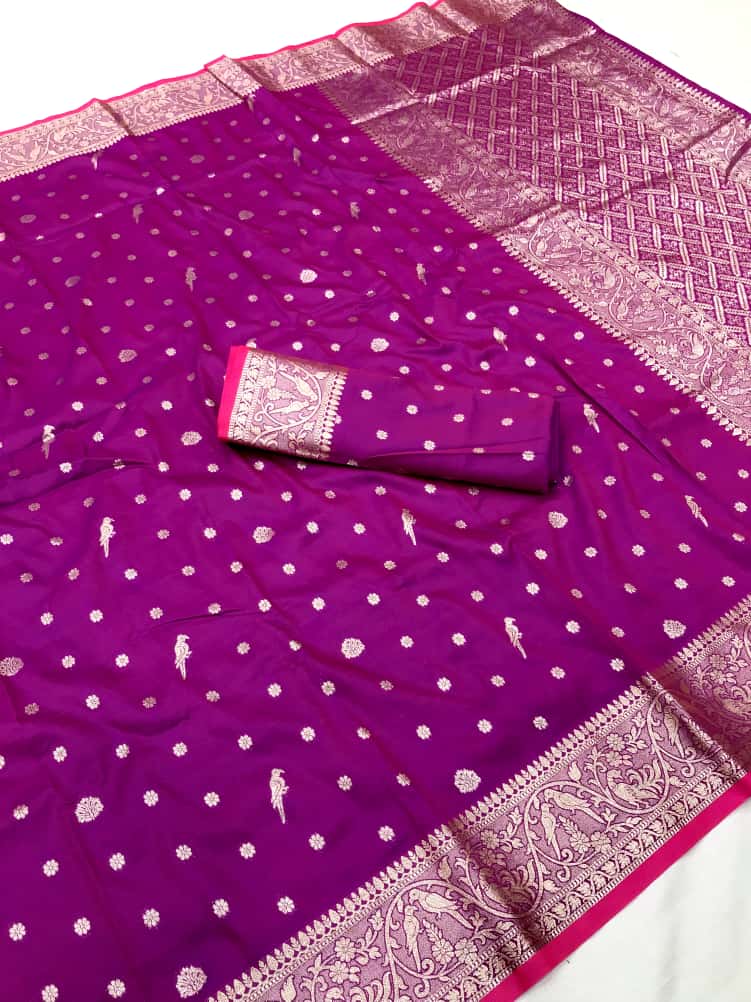 | Fabric: | Pure Soft banarasi silk saree. Original pure Banarasi jari and rich pallu with all over design and heavy border. |