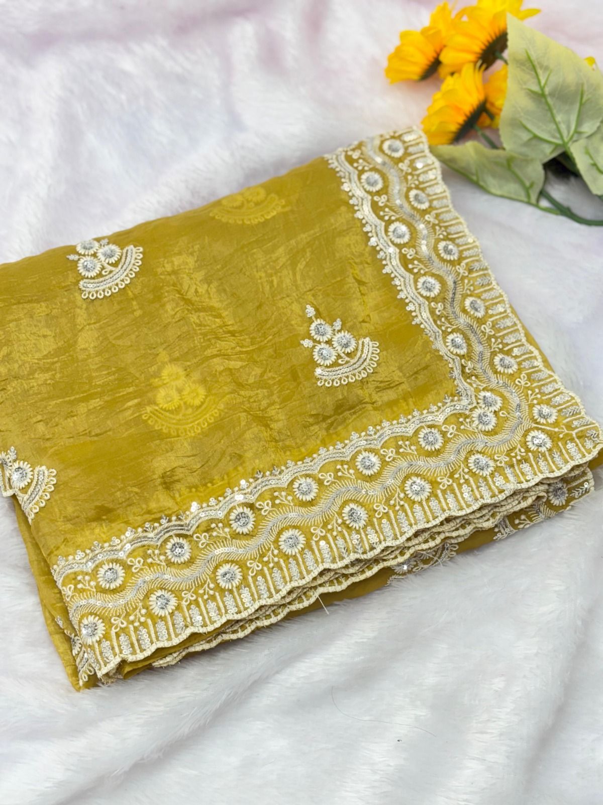 | Fabric: | -Pure Soft gold crush cotton thread embroidery with sequence work |