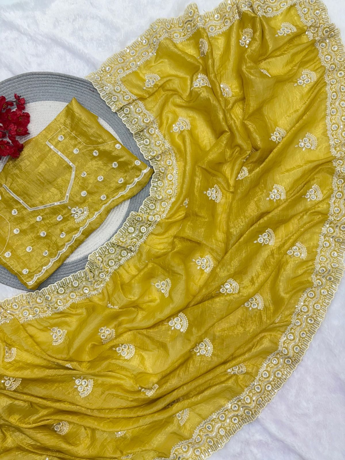 | Blouse: | Pure Soft gold crush cotton thread embroidery with sequence work |