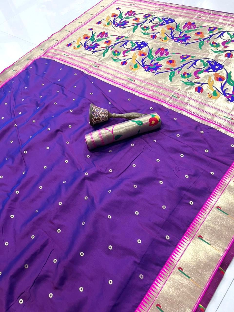 | Fabric: | Pure Soft Kanchivram Pethani Silk Original Pure Zari Wiwing And Both Side Muniya Boder Heavy Mina Zari Weaving Pallu |