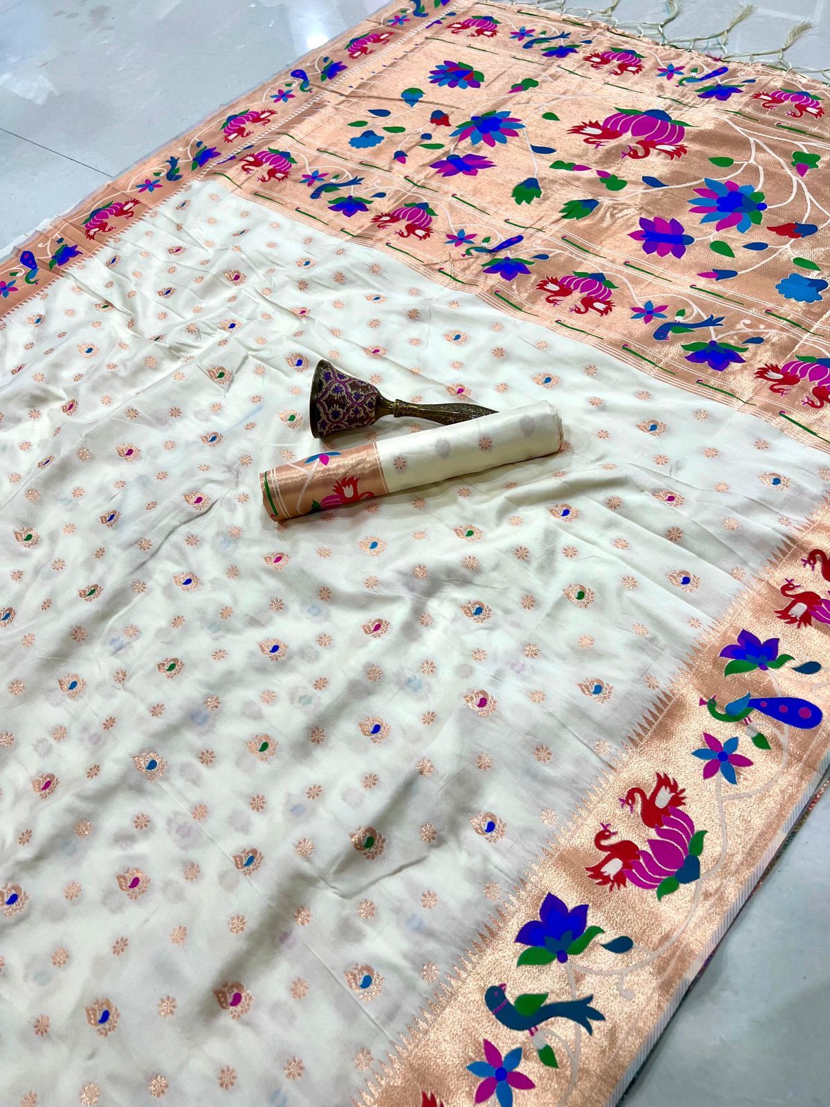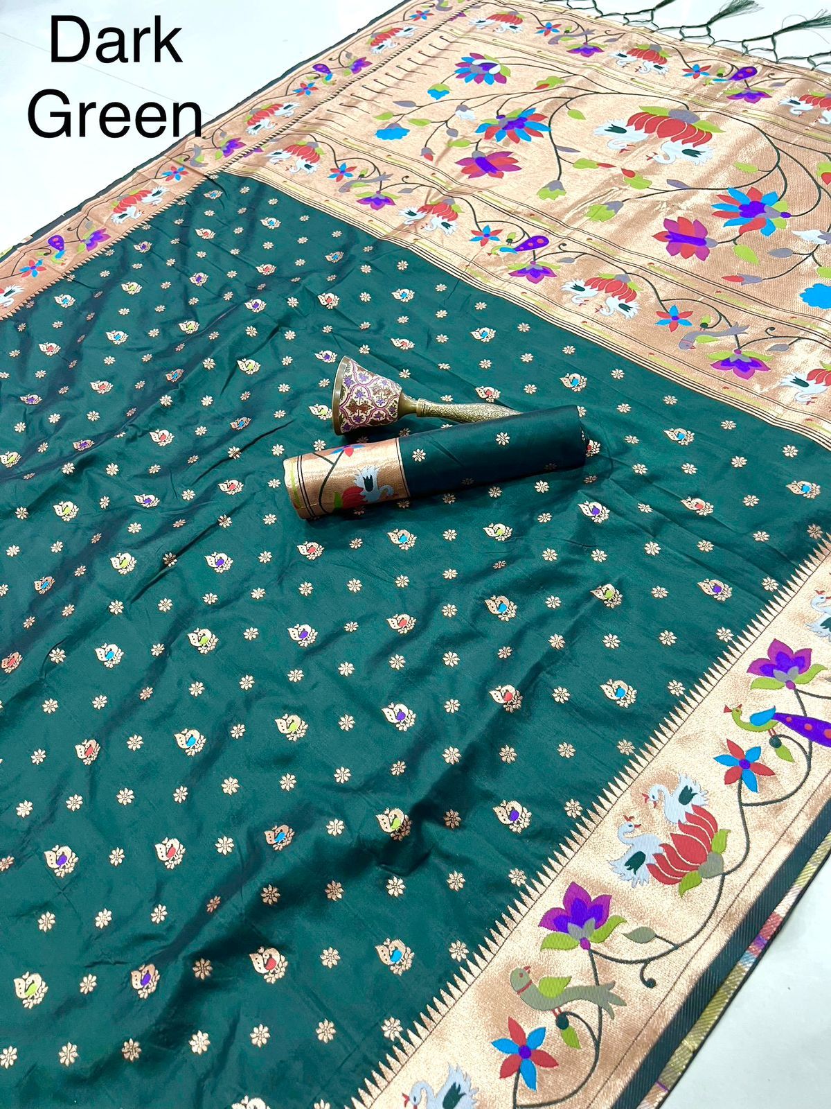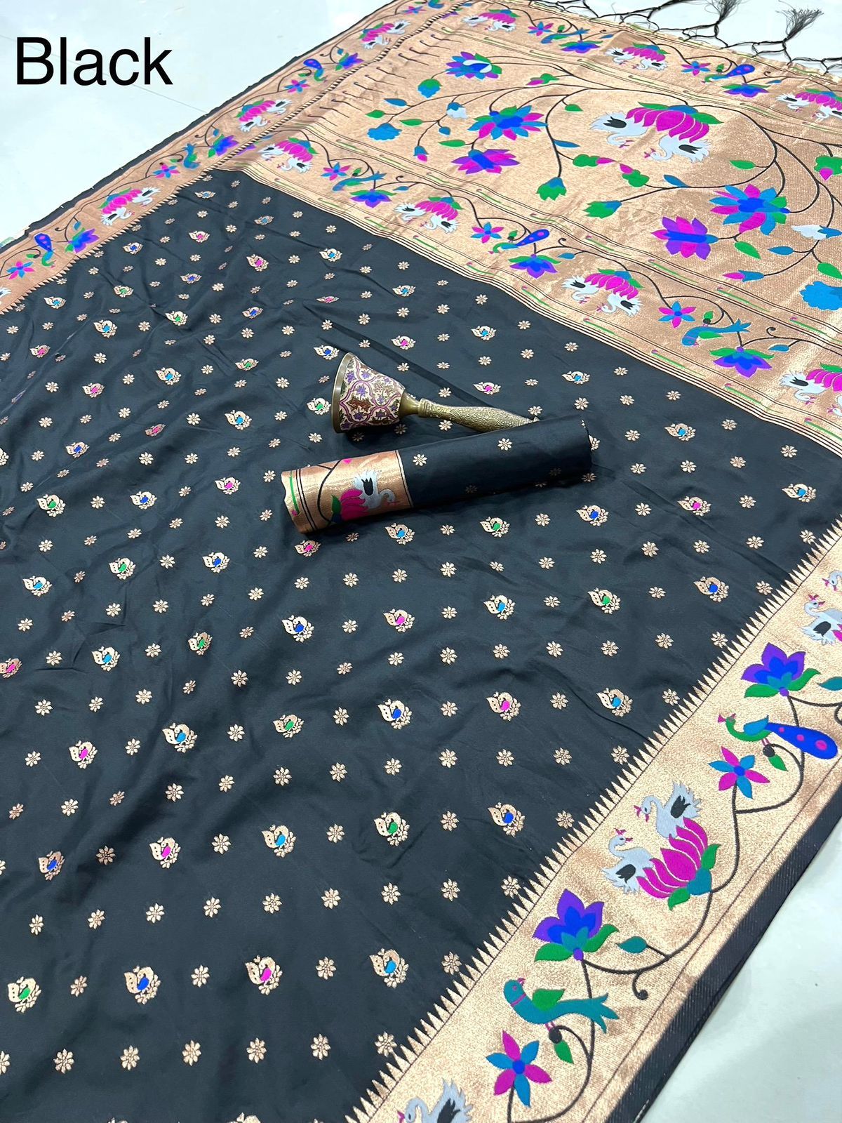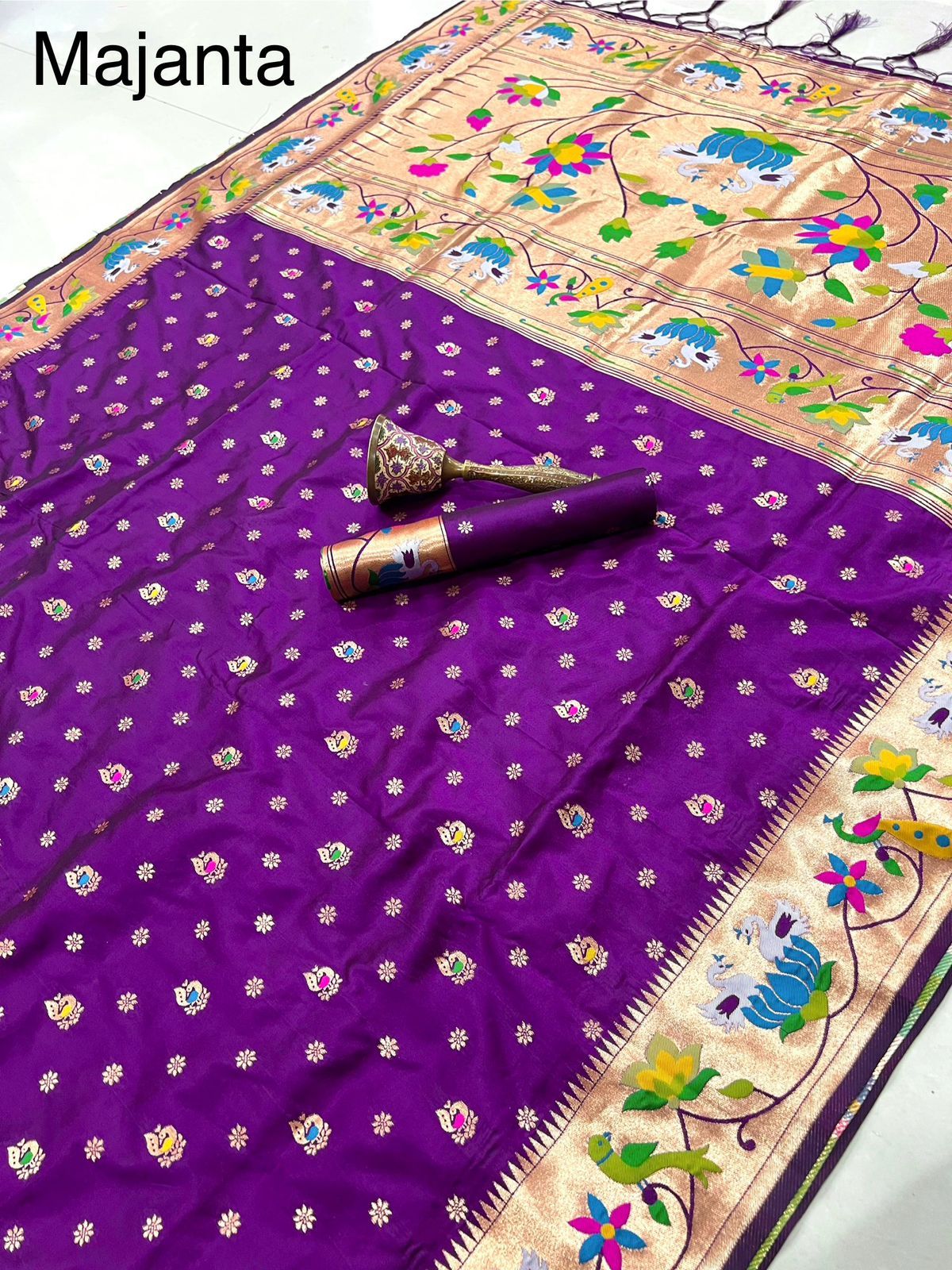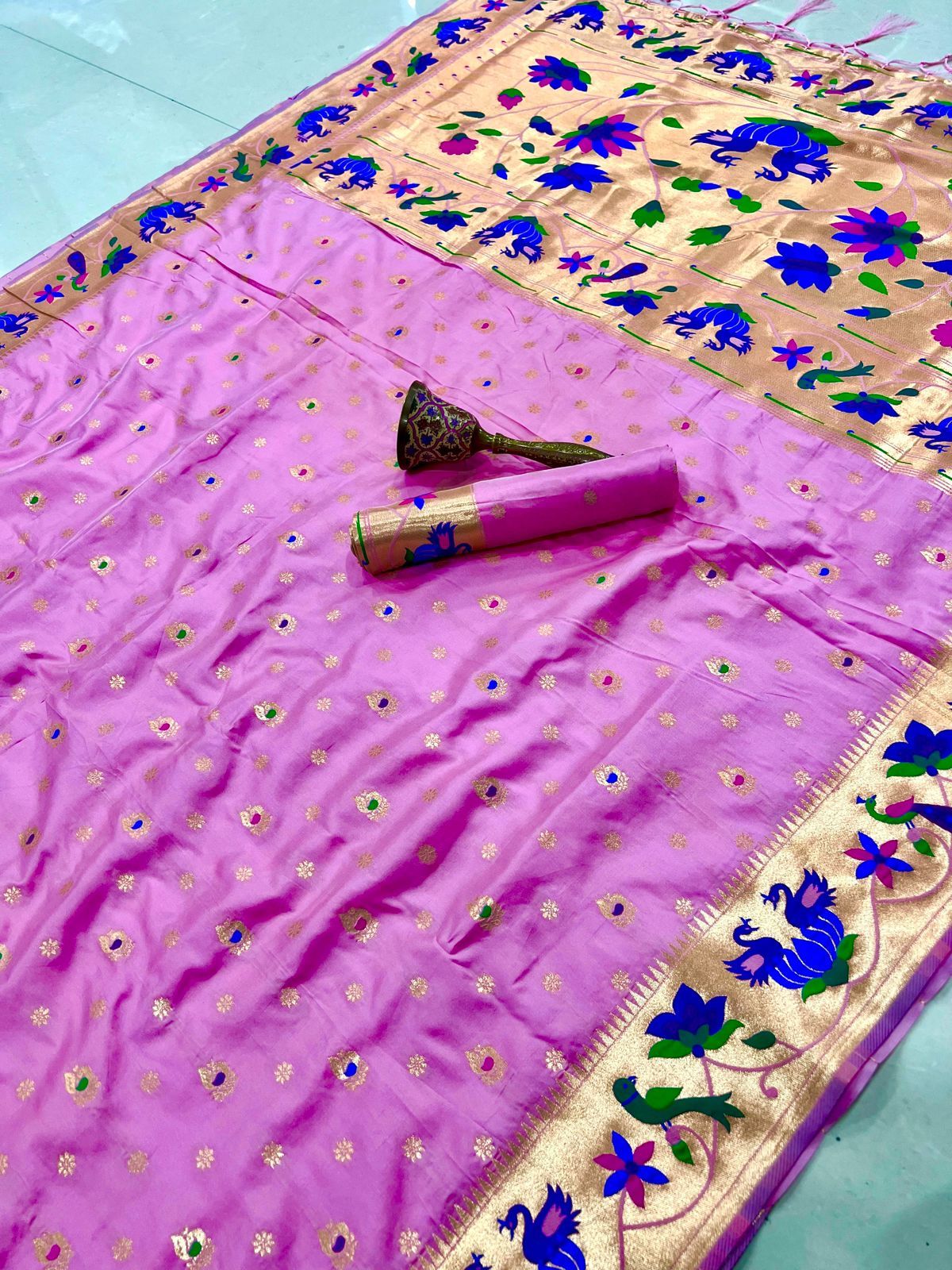 | Fabric: | Pure Soft Kanchivram Pethani Silk Original Pure Zari Wiwing And Both Side Minakari Boder Heavy Mina Zari Weaving Pallu |