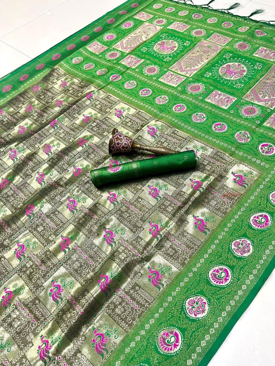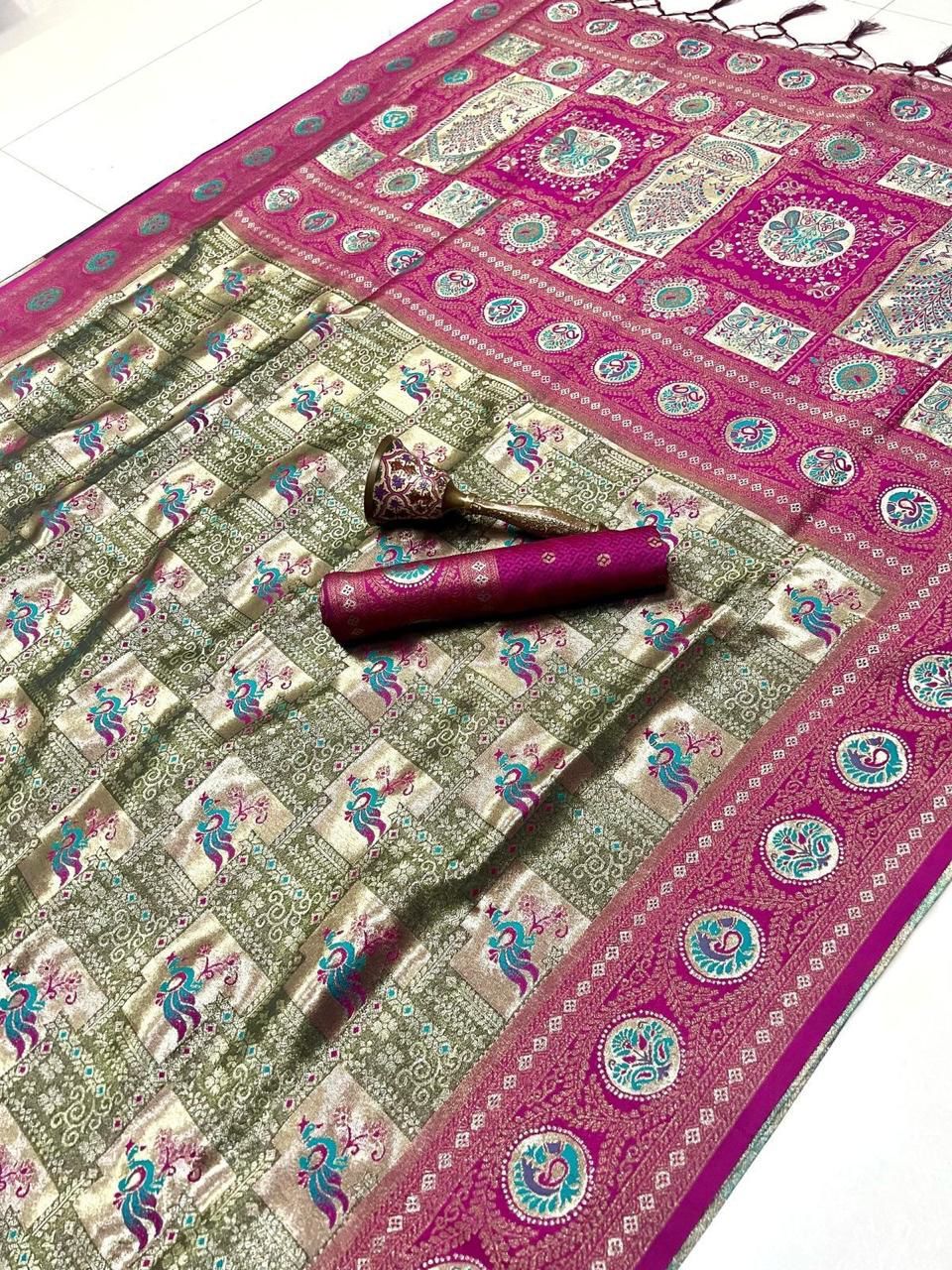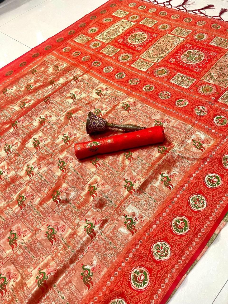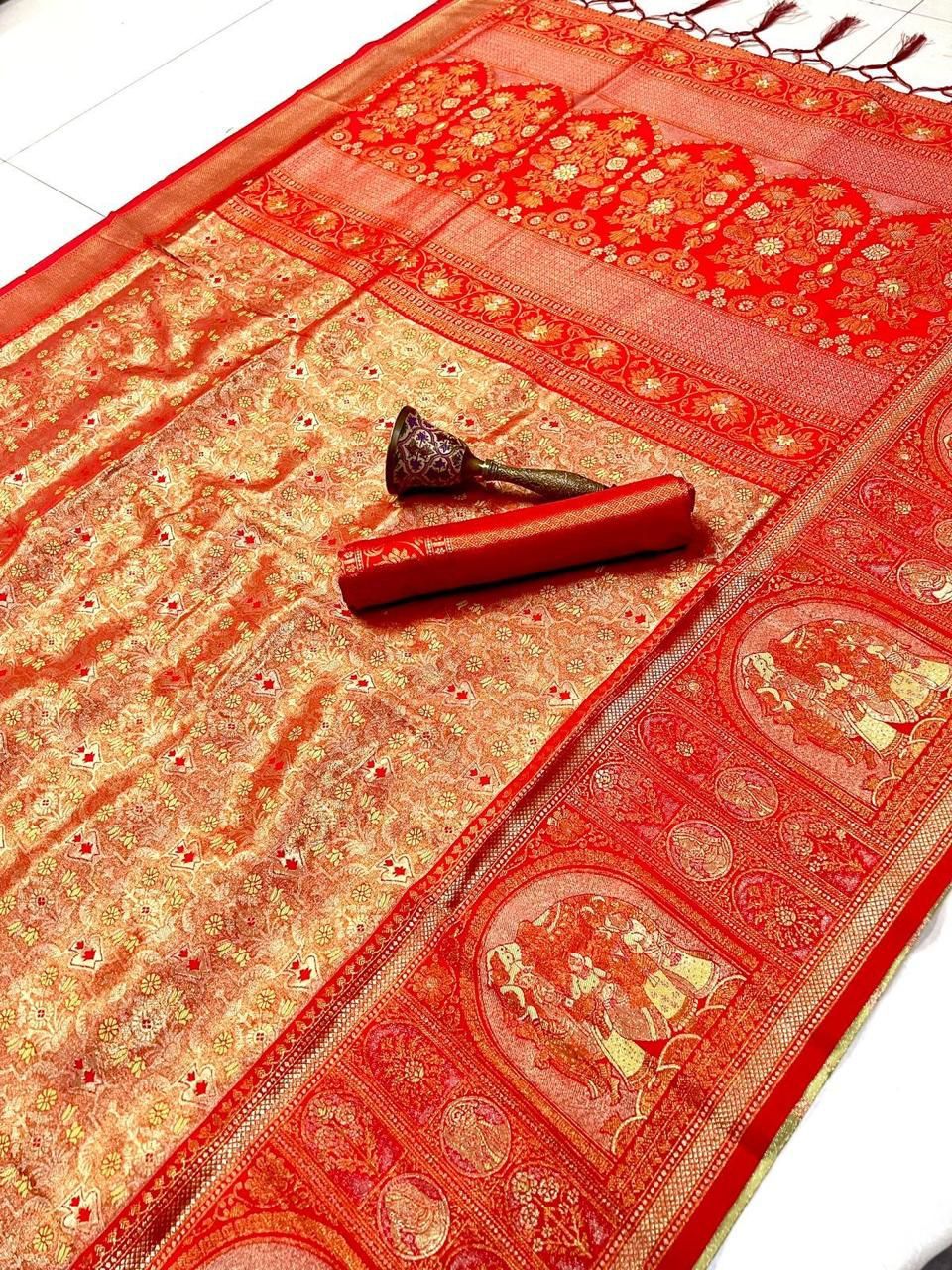 | Fabric: | Pure Soft Kanchivram Silk Original Pure Zari Wiwing And Both Side Minakari Boder Heavy Mina Zari Weaving Pallu |