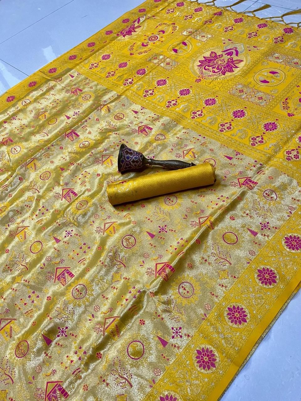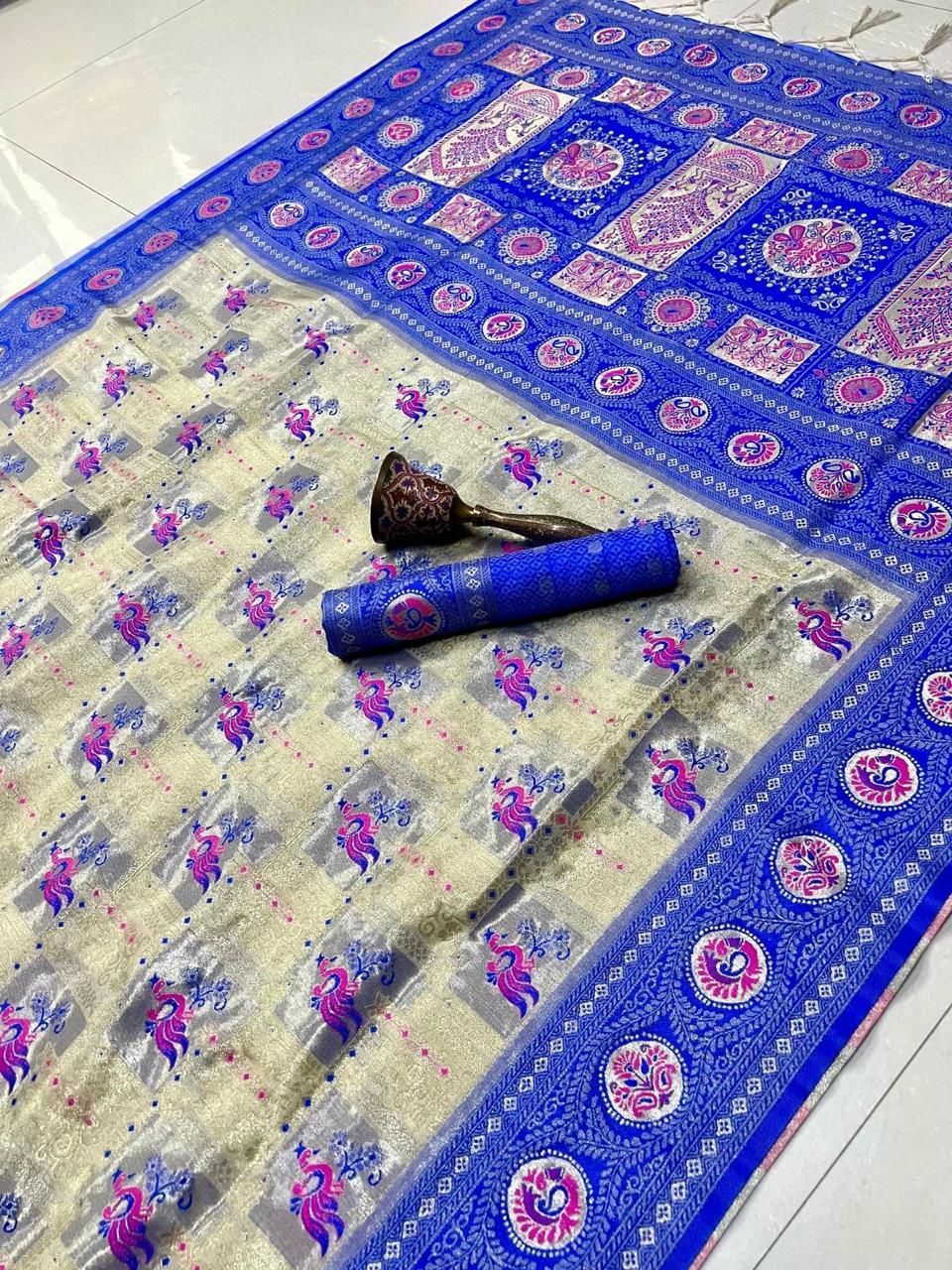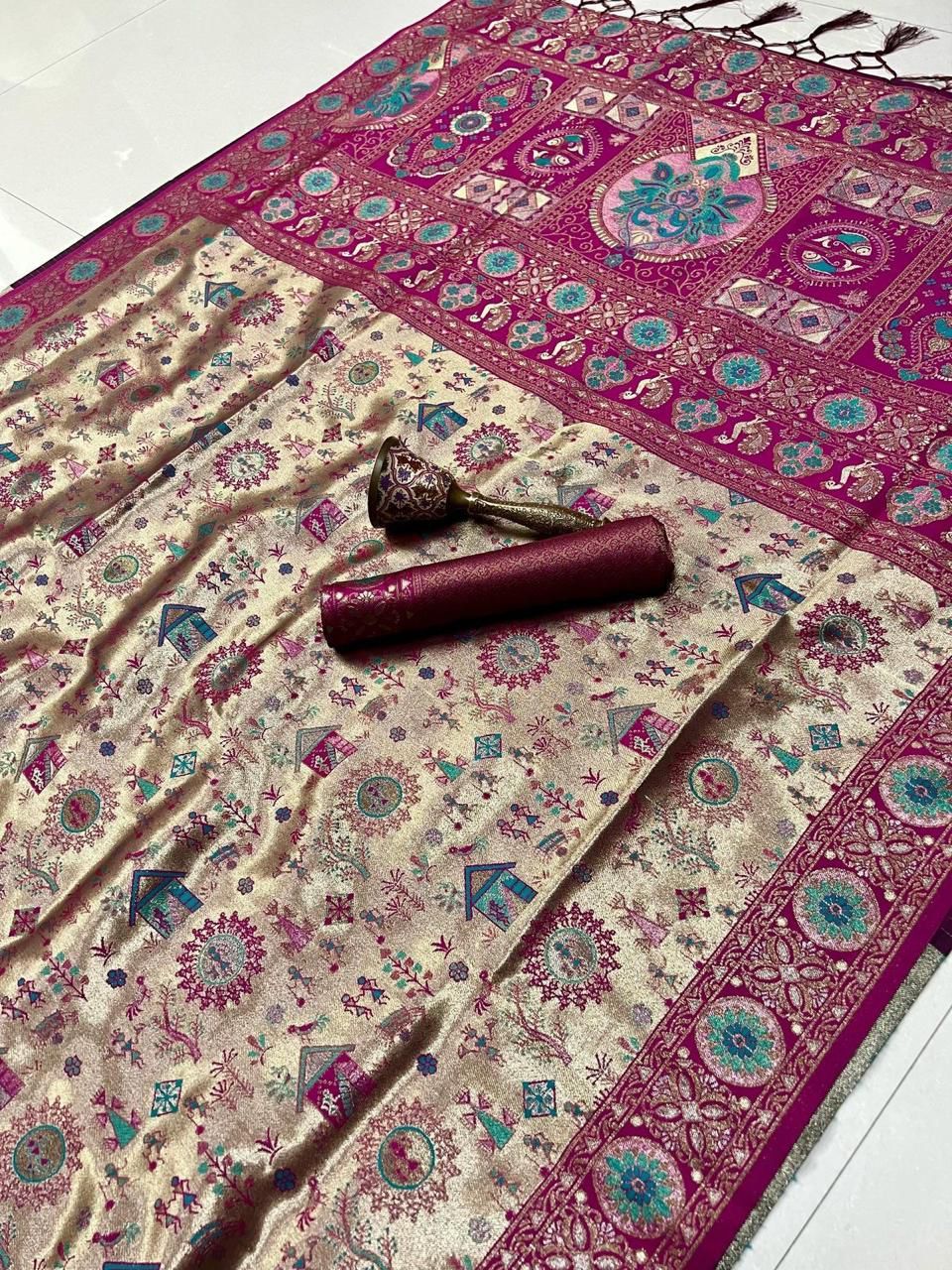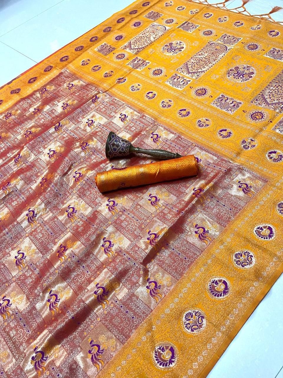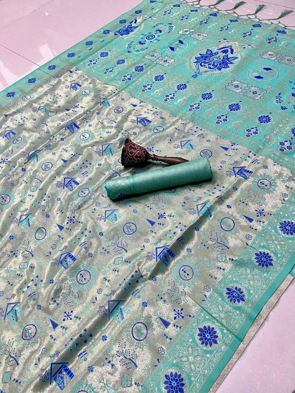 | Fabric: | Pure Soft Kanchivram Silk Original Pure Zari Wiwing And Both Side Minakari Boder Heavy Mina Zari Weaving Pallu |