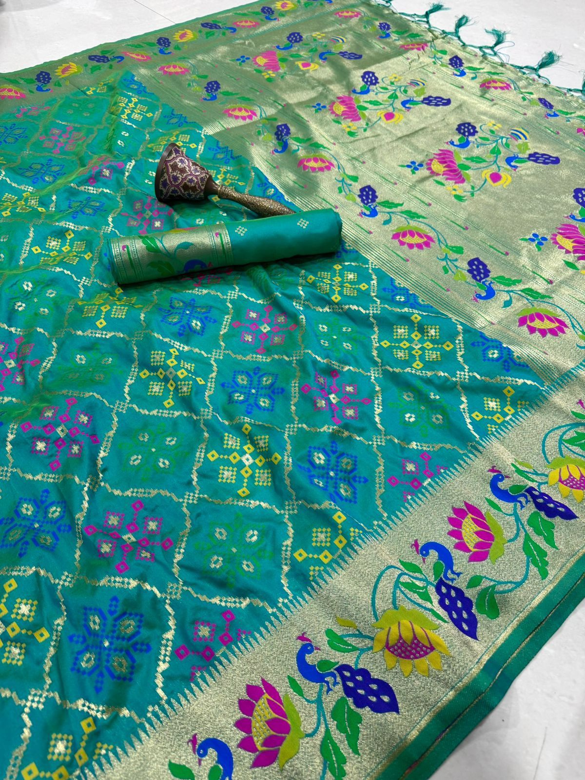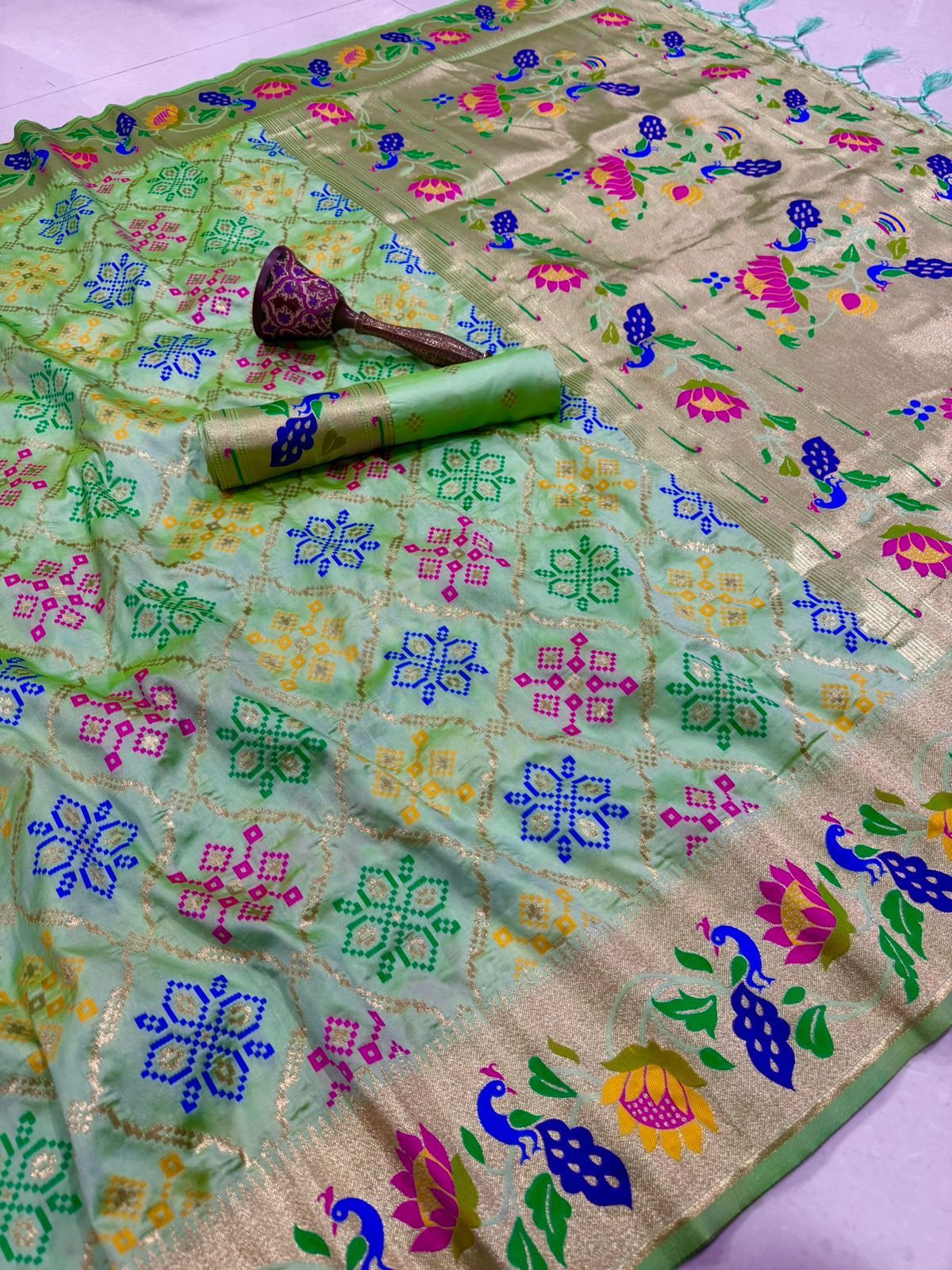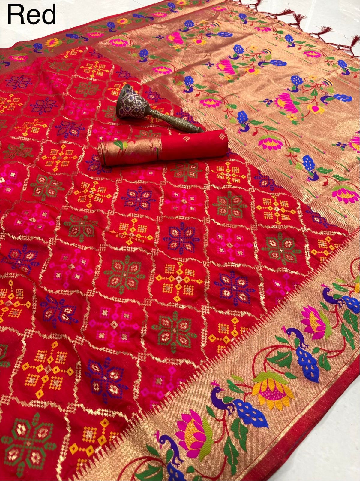 | Fabric: | Pure Soft Kanchivram Patola Pethani Silk Original Pure Zari Bandhani Patola Design And Minakari Border And Heavy Mina Zari Weaving |