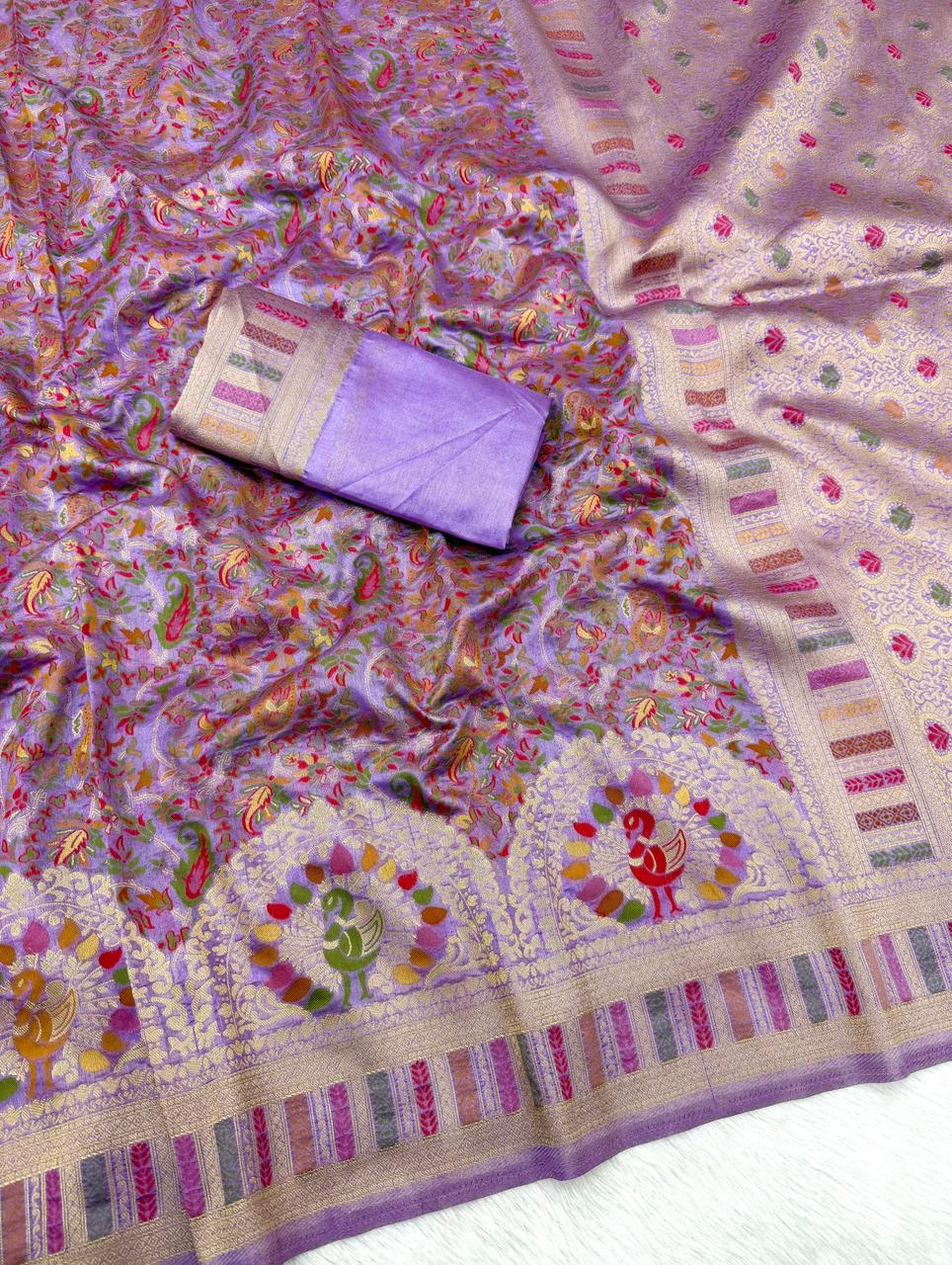 | Fabric: | Pure n Soft Rajwadi Pashmina and Paithani style Silk Weaving Saree With zari Thread Wooven Pallu Having Fancy Tassels With Heavy Rajwadi N Zari Weaving Border |