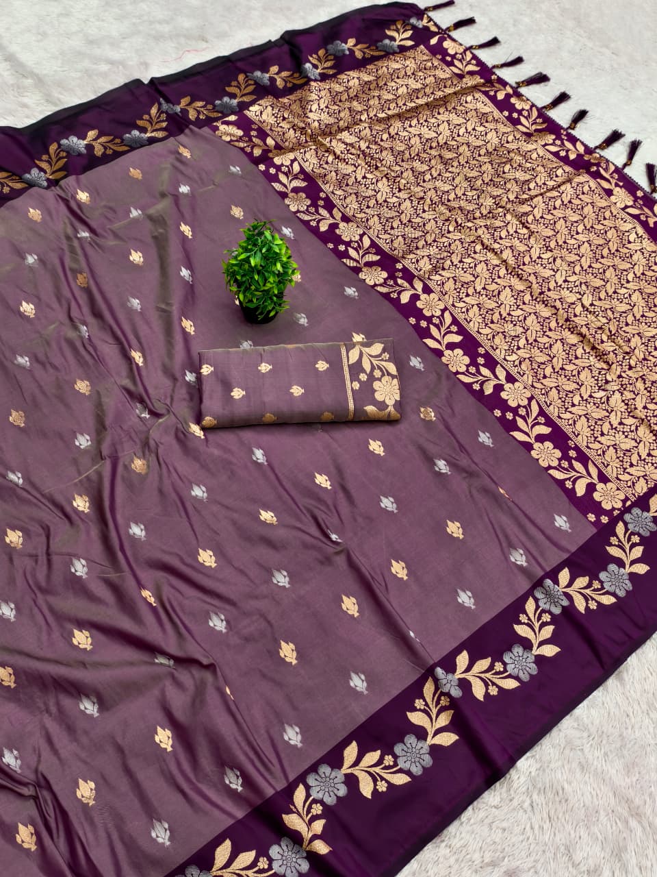 | Fabric: | Super Soft Silk Saree with attractive contrast color matching border silver & Copper jari weaving, adorable Pallu design |