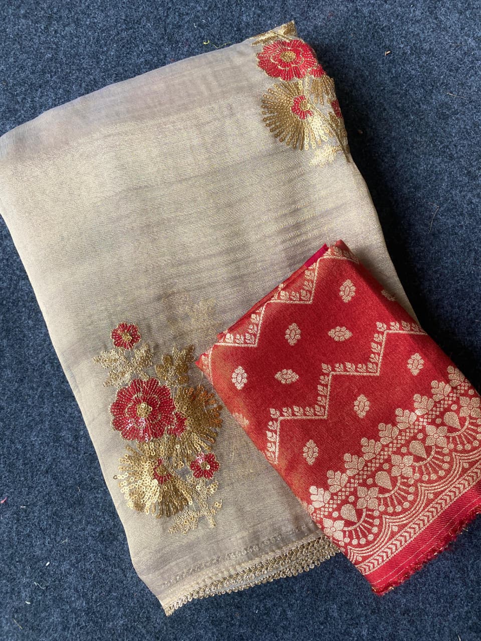 | Fabric: | Pure tissue crush doubleTone fabric saree with two colour multi sequence work flowers with outline work with beautiful lace |