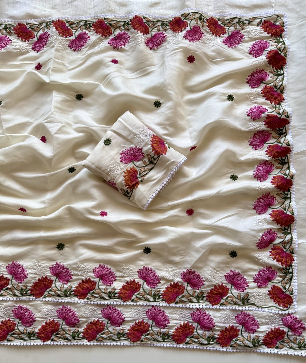 | Fabric: | Pure Tussar silk saree in a solid color with embroidery viscos thread work in saree Paired with all over white Cotton lace with tussar blouse of same color of saree with work |